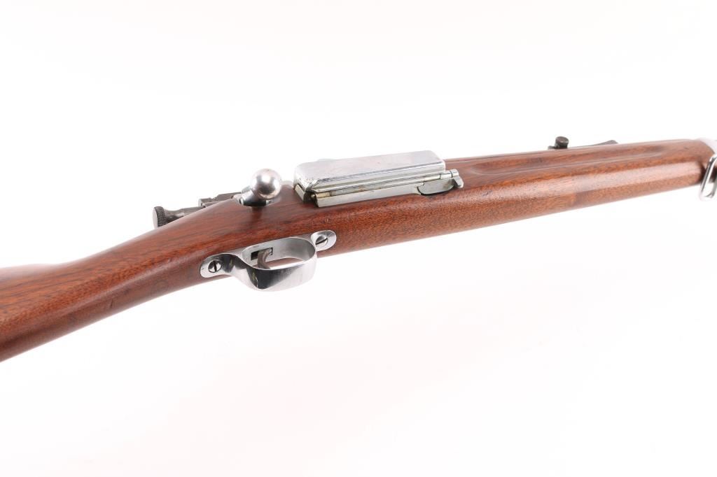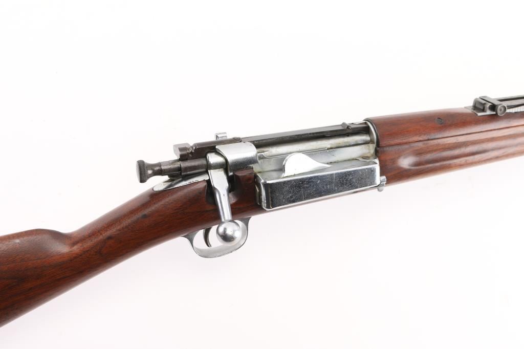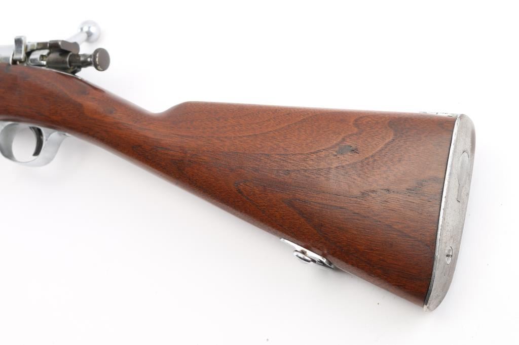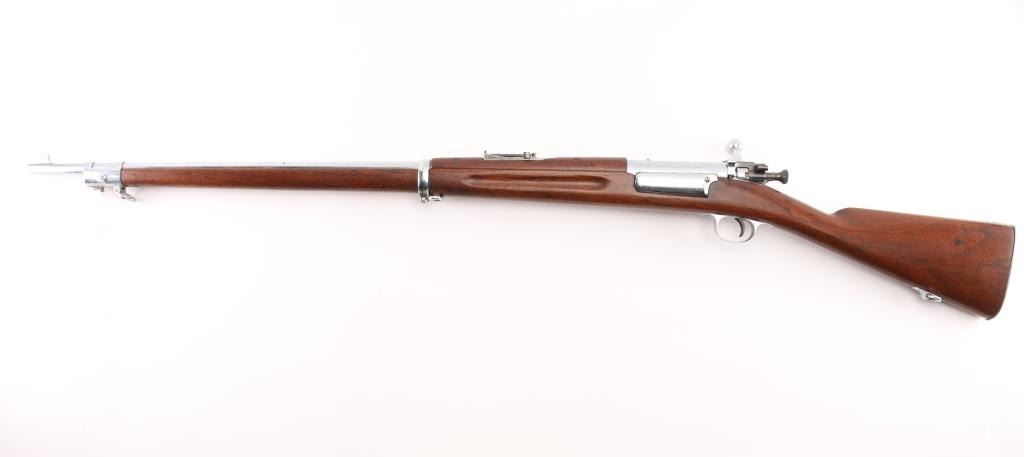 Spanish-American War era US military bolt action infantry rifle manufactured circa 1902. All metal parts have been chromed or nickel finished for parade or honor guard use. Features 30" barrel, pinned blade front sight, tangent rear sight graduated to 2,000 yards with rear notch and sliding peep, two barrel bands with bayonet lug & stacking swivel on the front band, side-mounted 5 round hinged magazine with cut-off on the left side of the receiver, polished bolt with two-position safety on the rear, smooth trigger, sling swivels, smooth walnut handguard and straight grip shoulder stock with finger grooves in the forend, trapdoor metal buttplate, FAINT circled script "P" cartouche behind triggerguard. Bore is very goo bright condition. Nickel (or chrome) is generally very good, with visible slightly rough texture from metal underneath, little puckering or flaking. Wood is lightly sanded, very good condition. Condition is NRA Very Good as modified *** C&R Firearm ***