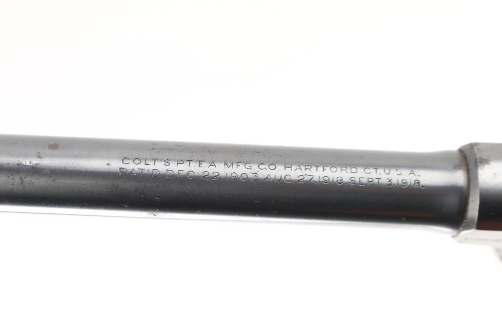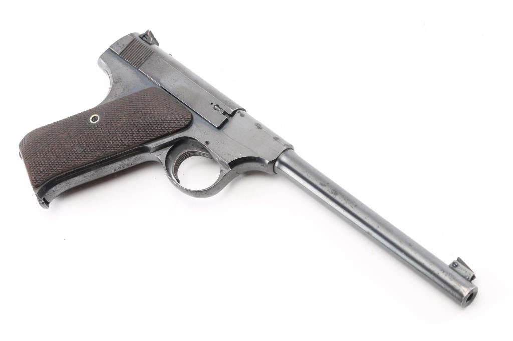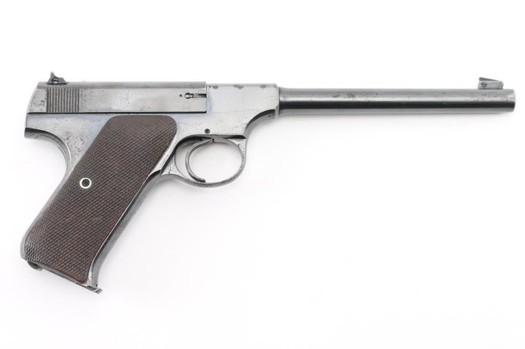 Semiautomatic rimfire pistol manufactured circa 1931. Features blued finish, checkered walnut grips, 6.75" barrel, blade front sight, rear sight in dovetail with adjustment screws, heel magazine release, manual safety. Bore is very good condition. Retains 75% blue, with edge losses, scratches, small areas of patina, some tiny pits on left side of slide. Grips are very good condition with handling wear to checkering points. Includes (1) Colt magazine. Condition is NRA Good++ *** C&R Firearm ***