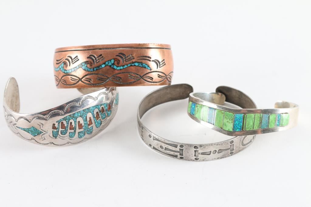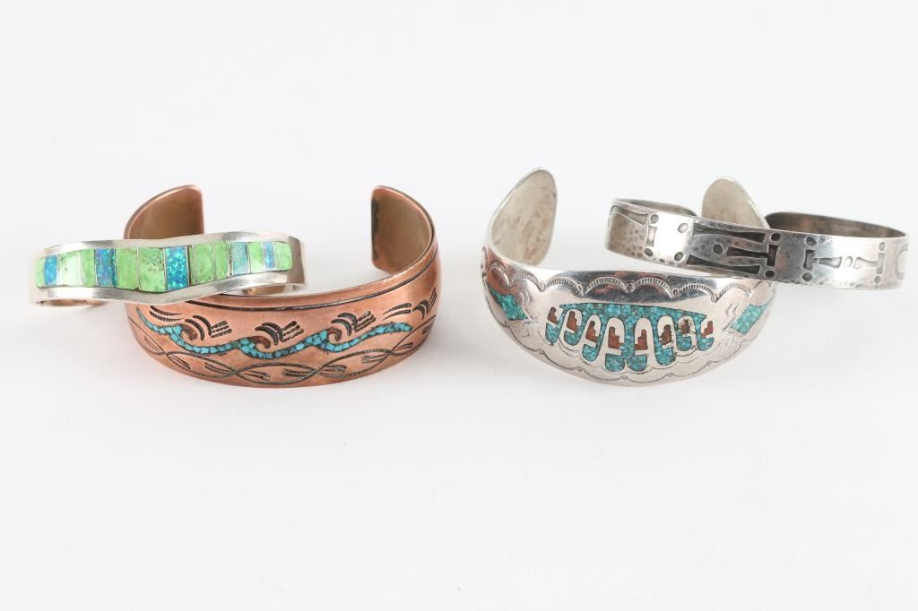 (1) Copper cuff inlaid turquoise J. Mezzie (1) Navajo Inlaid Bracelet with turquoise & Coral (1) Gaspeite & Opal Bracelet maker marked I . Kee (1) All Sterling stamped cuff