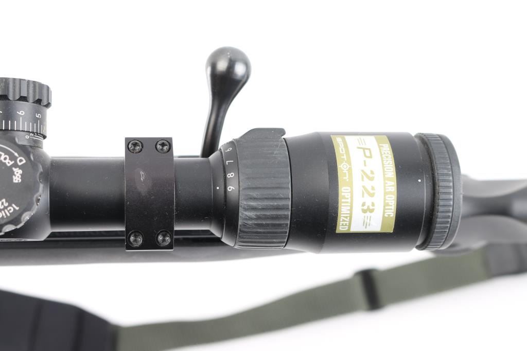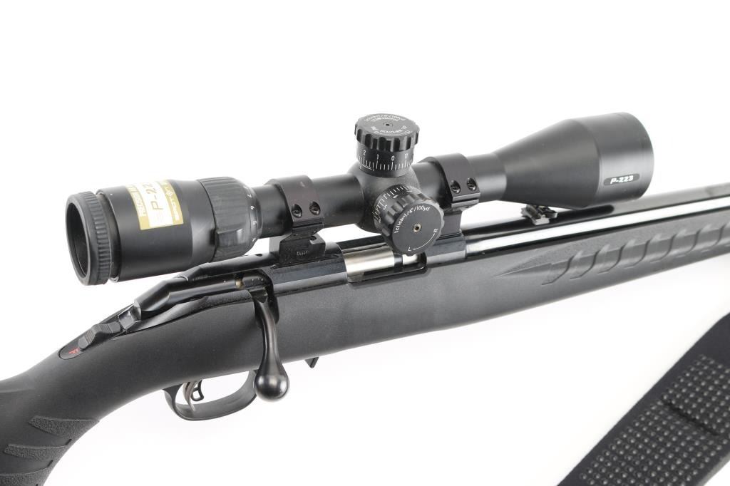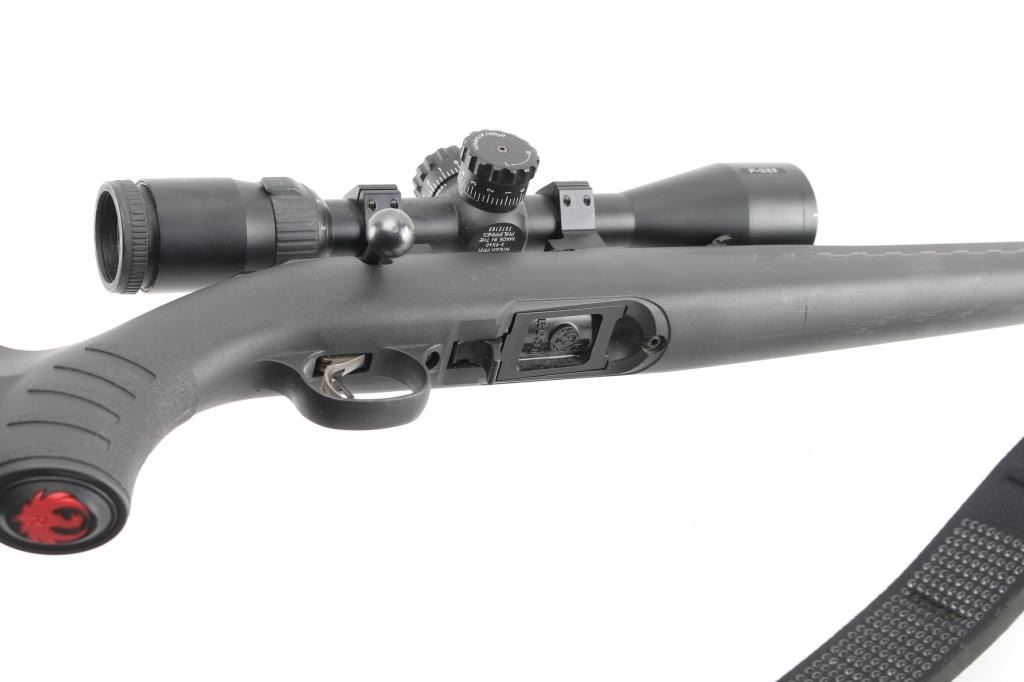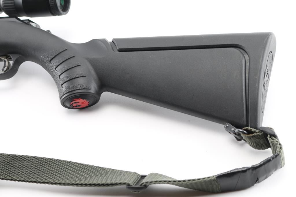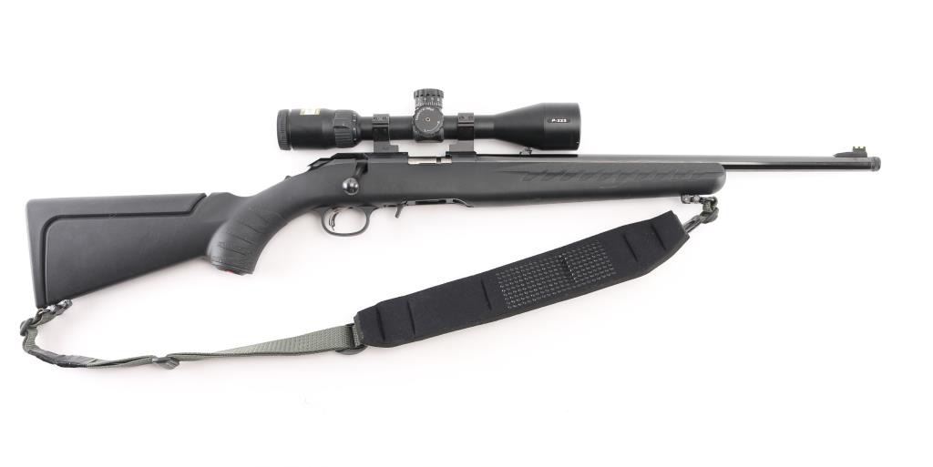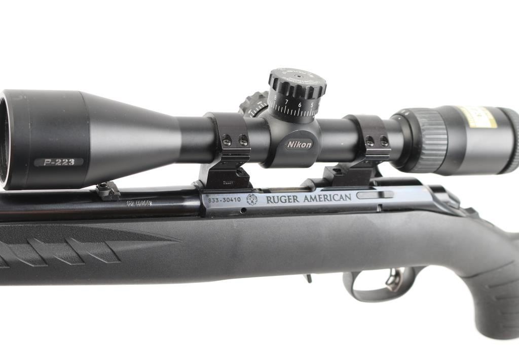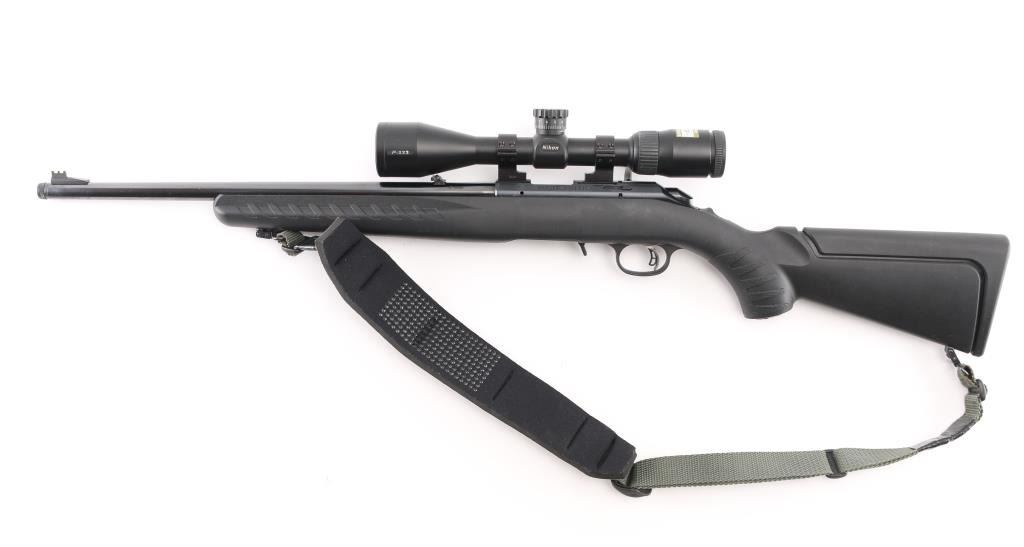 American made bolt-action rifle chambered in .17 HMR. Features a 18" blued, threaded barrel with raised green fiber optic front sight,flip white diamond rear sight. tang safety, 109 rd detachable box magazine, black synthetic stock with textured fore end and wrist, blued sling swivels, Butler Creek camo/green nylon sling, plastic red Ruger logo grip cap,smooth accu-trigger, LOP is 12 3/4". Bore is excellent but a little dirty. Metal retains 99% of its finish. Comes with a mounted silver Nikon P-223 3-9x40 scope, clear optics.. NRA Condition-Excellent. Modern Firearm.
