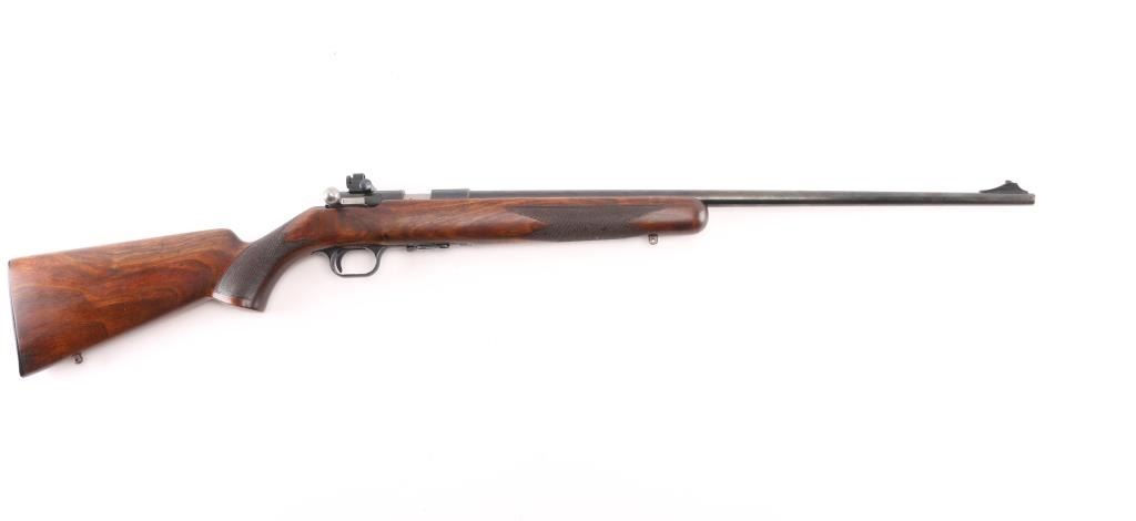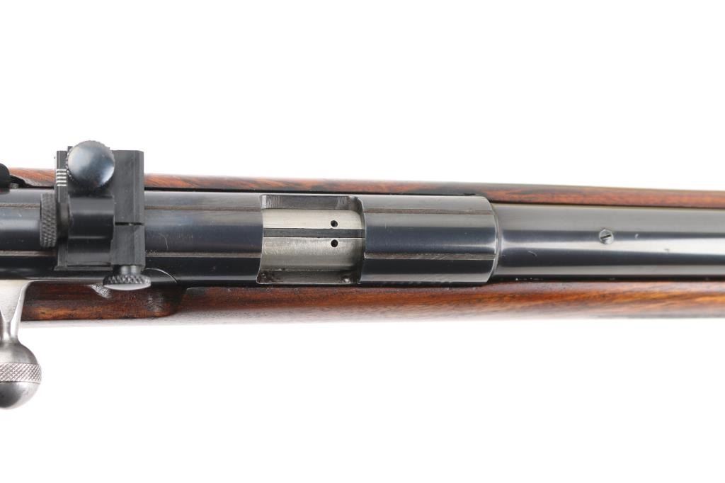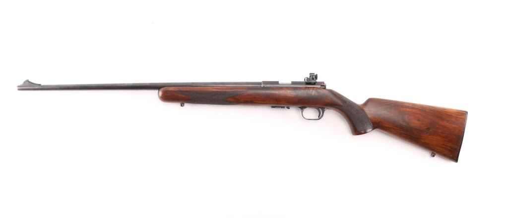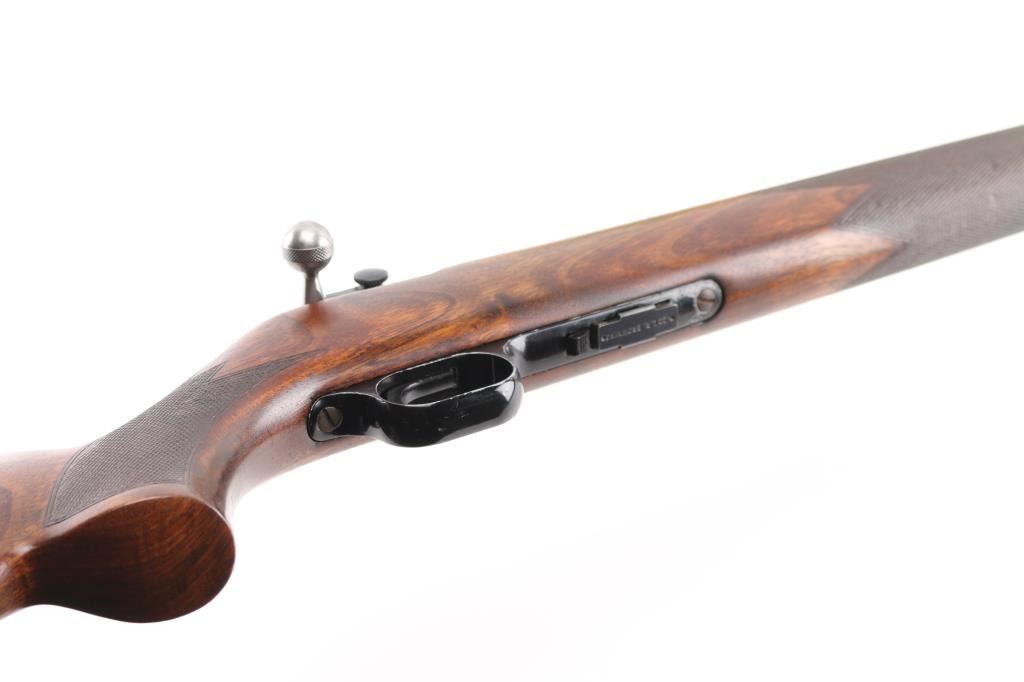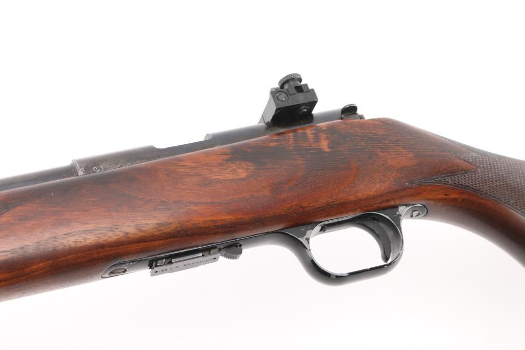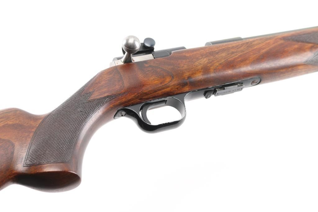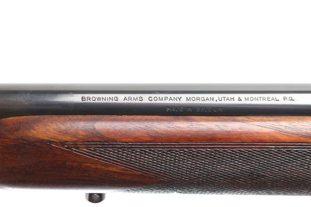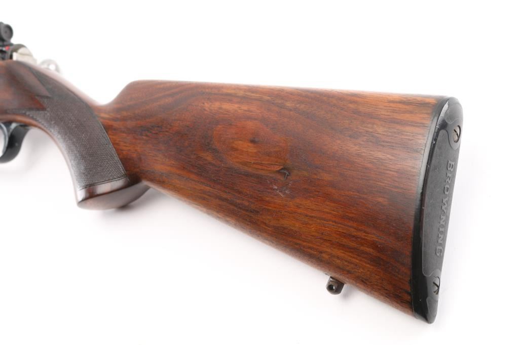 Belgian straight pull bolt action rifle imported by Browning Arms Co, Morgan UT. 1971 date code. Features blued finish, checkered walnut stock with curved grip, flat plastic buttplate, 24" barrel, blade front sight, receiver mounted peep rear sight, dovetail rail, detachable magazine, manual safety. Bore appears excellent. Retains 85% finish, with edge losses, handling marks, small area of cleaned patina with some tiny pits on left side of receiver, fading and graying on barrel near muzzle. Wood is very good condition, with fancy figure. Includes (1) magazine. Condition is NRA Good++ *** C&R Firearm ***