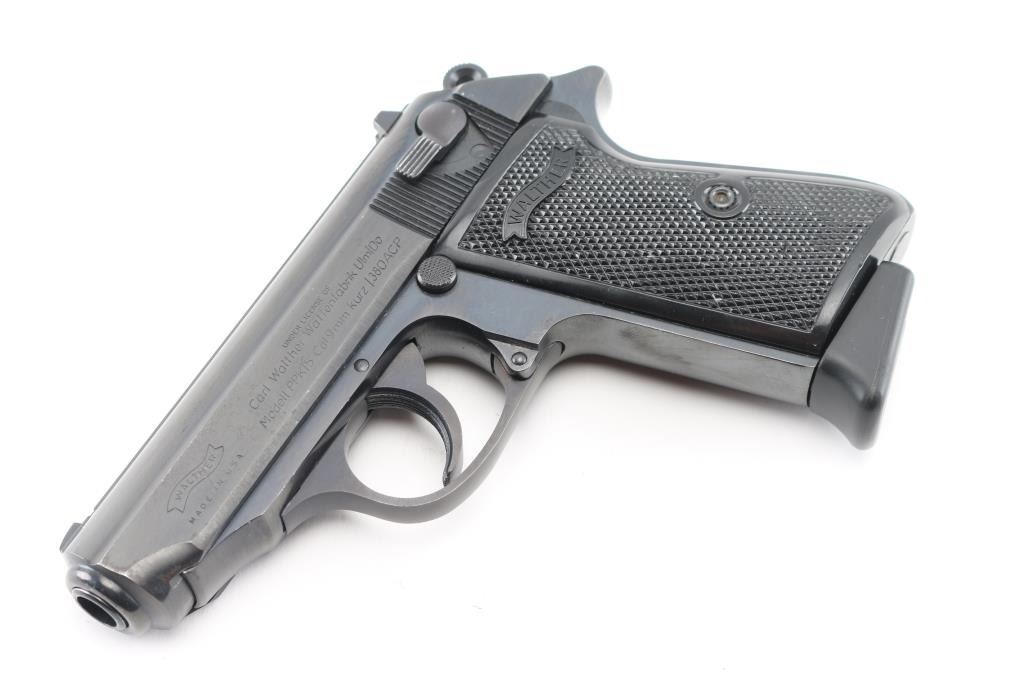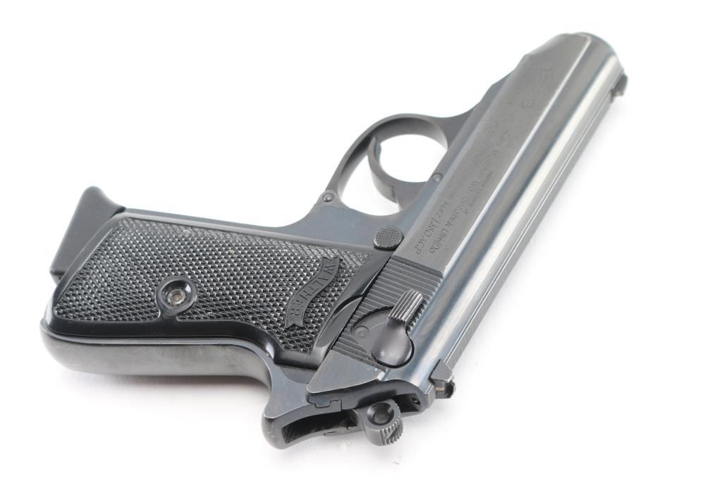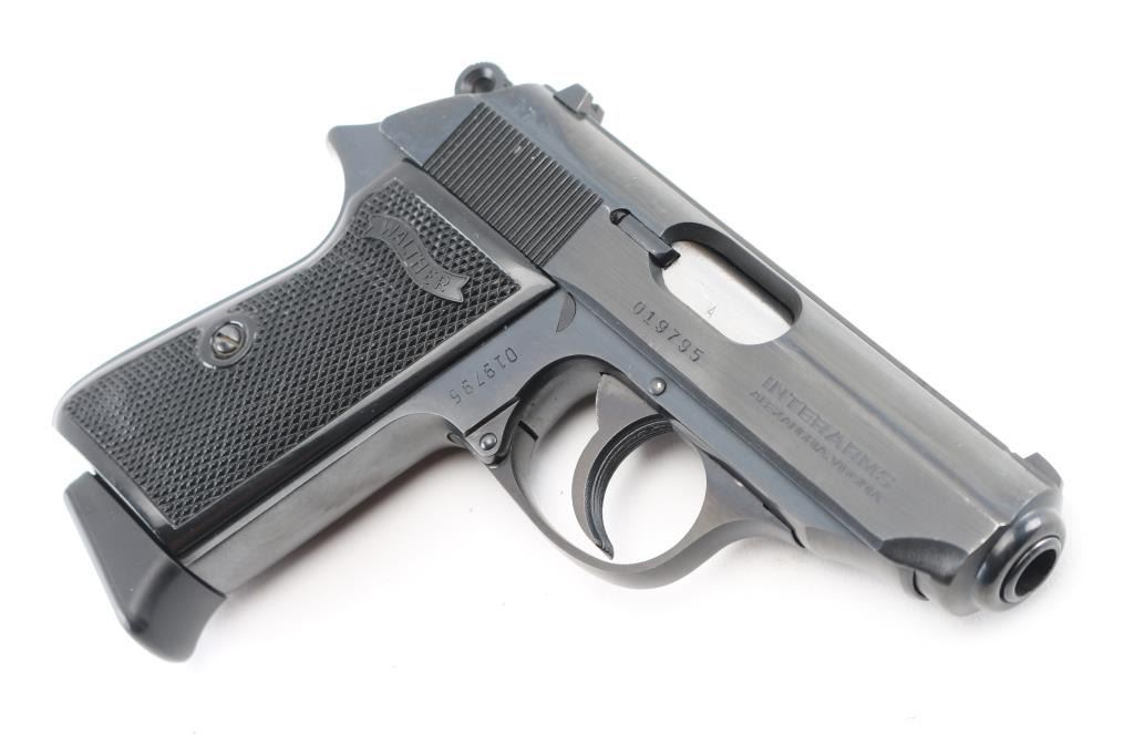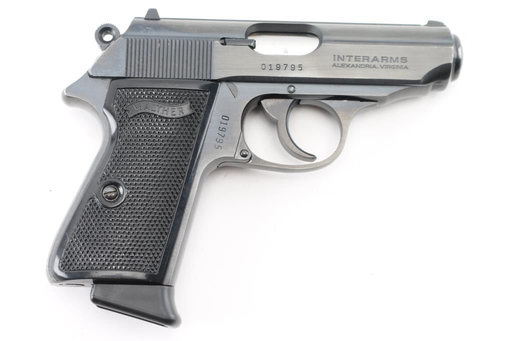 Semiautomatic compact pistol manufactured by Interarms, Alexandria VA, under license from Walther. Features blued finish, double action trigger, 3.3" barrel, fixed front sight with white dot, dovetailed rear sight with square notch & white bar, serrated trigger, serrated round hammer spur, thumb safety/decocker on the left side of the slide, loaded chamber indicator on the rear of the slide, push button magazine release, checkered black plastic "Walther Banner" grips. Bore is very good condition. Retains 95% finish with handling marks and few small scratches. Grips are very good. Includes (1) magazine. Condition is near NRA Excellent *** Modern Firearm ***
