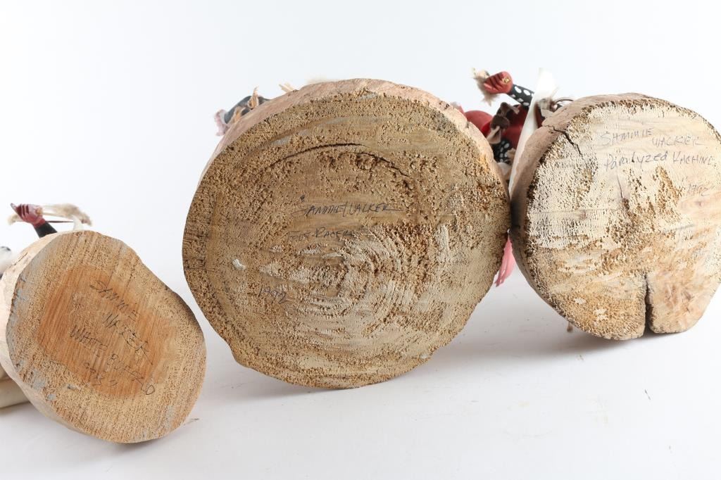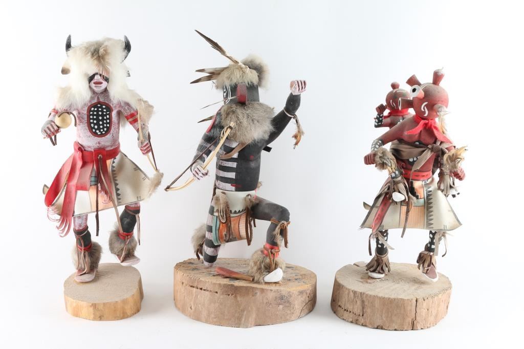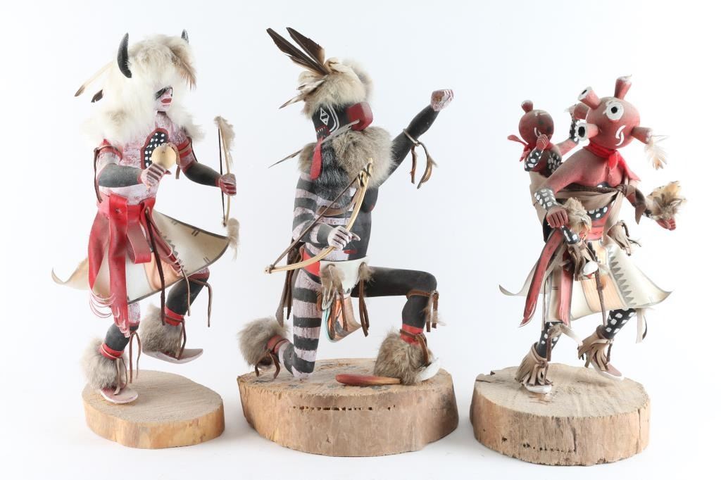 All hand-signed by the artist Sammie Walker, (1) White Buffalo, measures 17" tall x 7" base. (2) Foot Racer, measures 16" tall x 6" base. (3) Paralyzed Mud Head Kachina, measures 15" tall x 6" base.