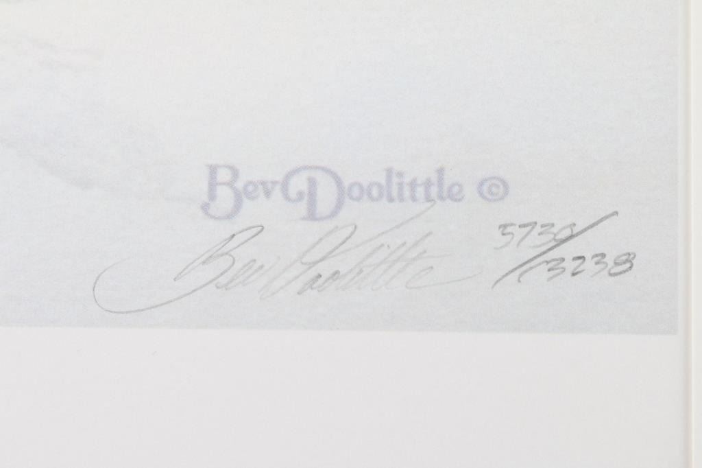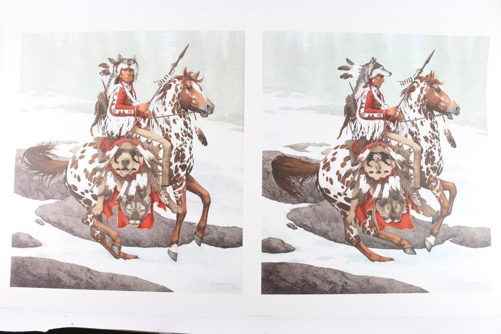 Hand-signed and numbered 5731 of 13,238 in the lower right hand. Set of two prints named "Guardian Spirits". Details the Blackfeet warrior riding in the snow covered wilderness and the wolf-Brother, symbol of stamina and hunting prowess, the messenger and the guide to the spirit world. Distributed by The Greenwich Workshop in Trumbull, CT. Bev Doolittle was born and raised in California. In 1968, graduated from the Art Center College of Design in Los Angeles. She wanted to be close to nature and traveled. Her paintings depict our Western wilderness and its inhabitants, with detailed realism. Measures 19 1/2"L x 22"W Year Print: 1987. Size of Edition: 13,238: One print is pencil signed and consecutively numbered, the second print is initialed with the matching number in pencil. The outside envelope is numbered in pencil as well. NEW in Original Packaging. Documentation certificate enclosed. Excellent Condition. Collectible.