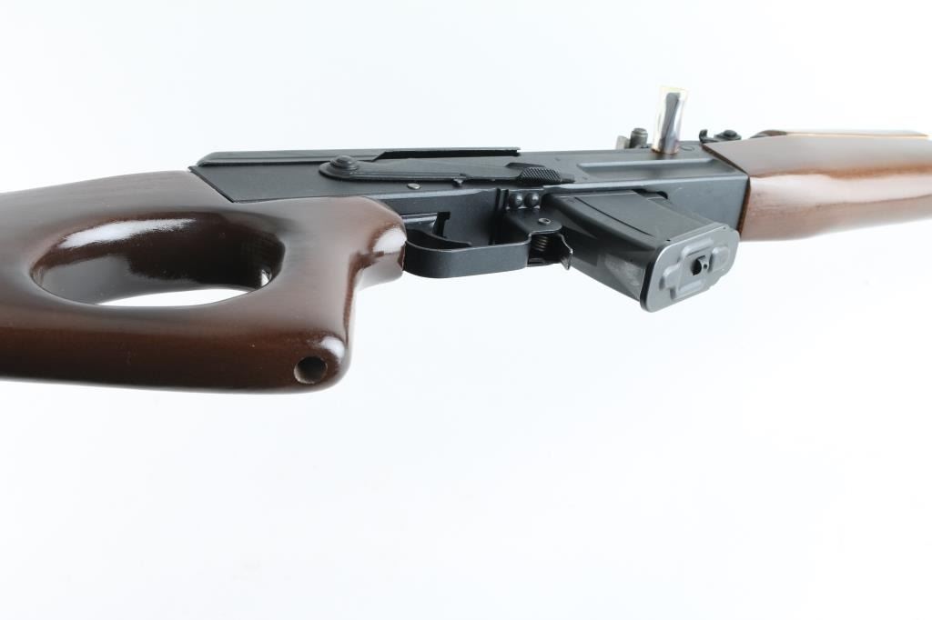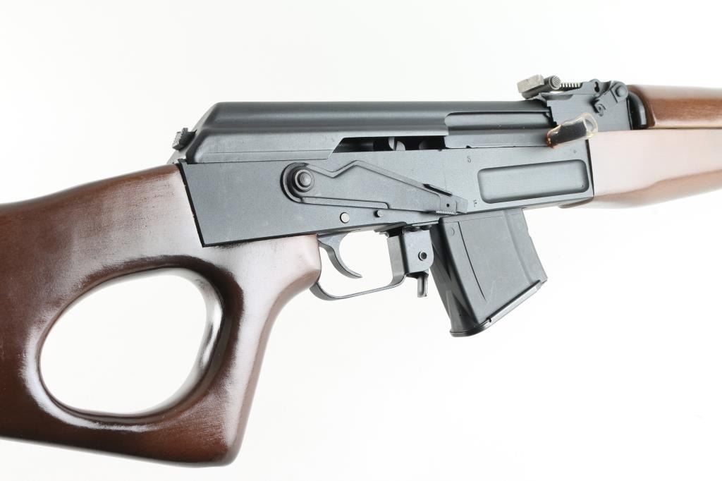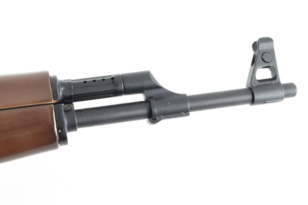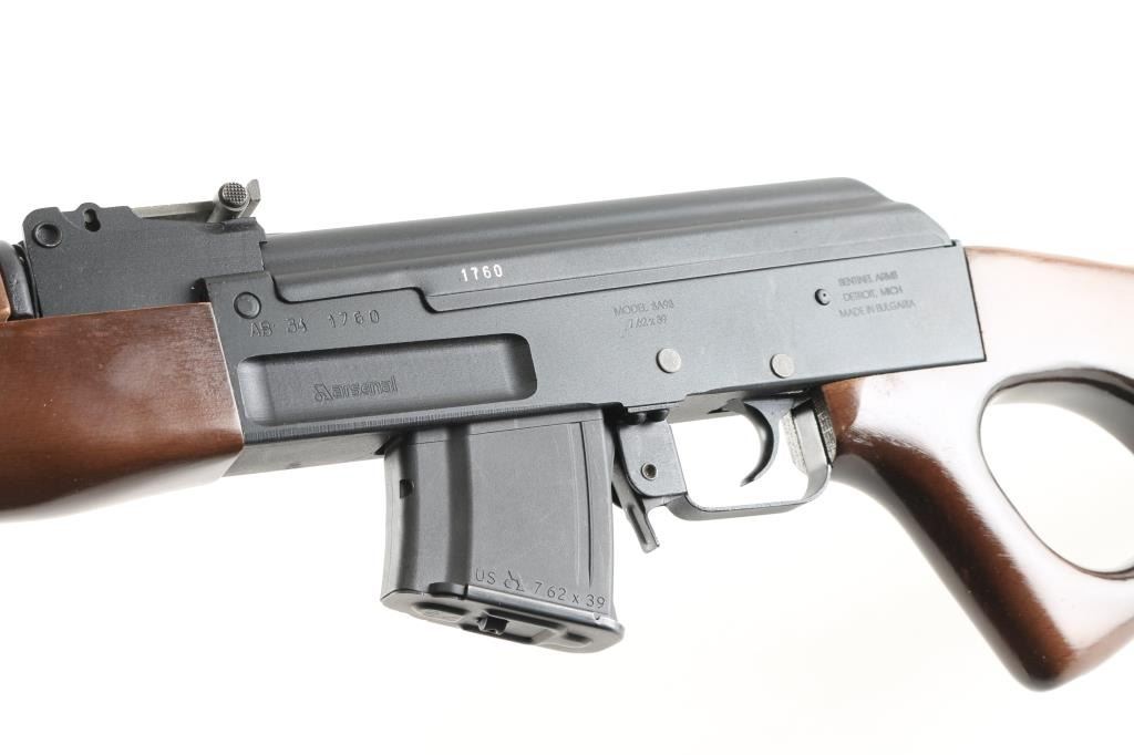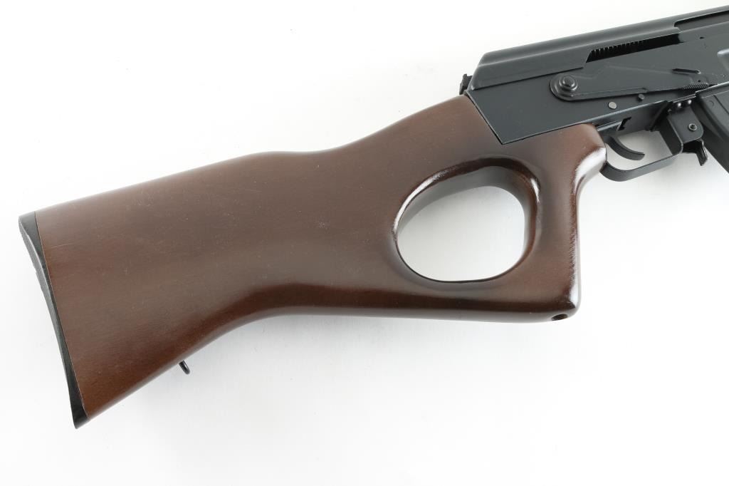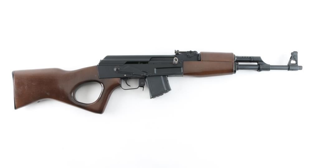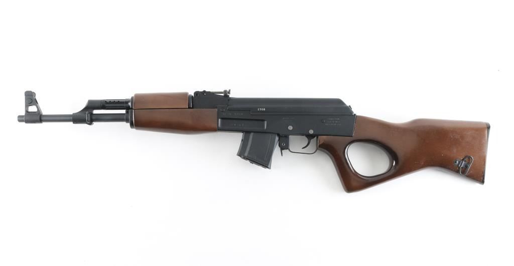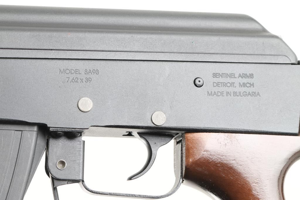 'Milled Receiver' Top quality Kalashnikov pattern semi-automatic rifle chambered in 7.62x39mm, manufactured in Bulgaria and imported by Sentinel Arms, Detroit MI. Features a matte black finish, 16.25" chrome lined barrel, fully adjustable shrouded post front sight, elevation adjustable tangent rear sight graduated to 800 meters, 45 degree gas block, manual safety, factory 5 round magazine (US made floorplate & follower), smooth trigger, smooth wood furniture, thumbhole stock with factory plastic buttplate, forward sling slot, rear sling swivel. "Post Ban" configuration with non-threaded muzzle, no cleaning rod, no bayonet lug. Rifle retains approximately 98% of its black finish showing scattered handling marks. Action is smooth, the bore is pristine and stocks are excellent. Last 4 digits of SN# repeated on bolt, carrier, top cover. Includes factory styrofoam & cardboard box with manual, oil bottle, cleaning tools, leather sling. Condition is NRA Excellent - like new *** Modern Firearm ***