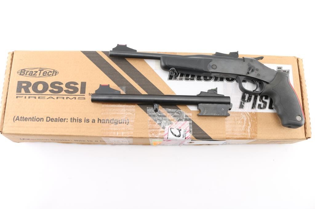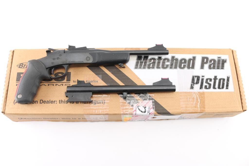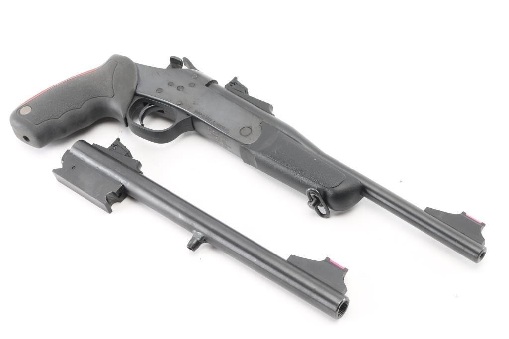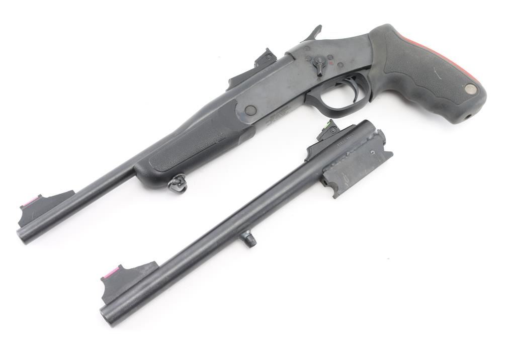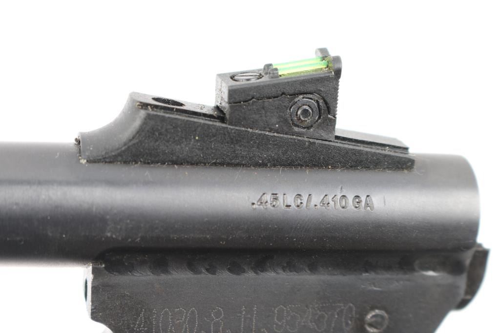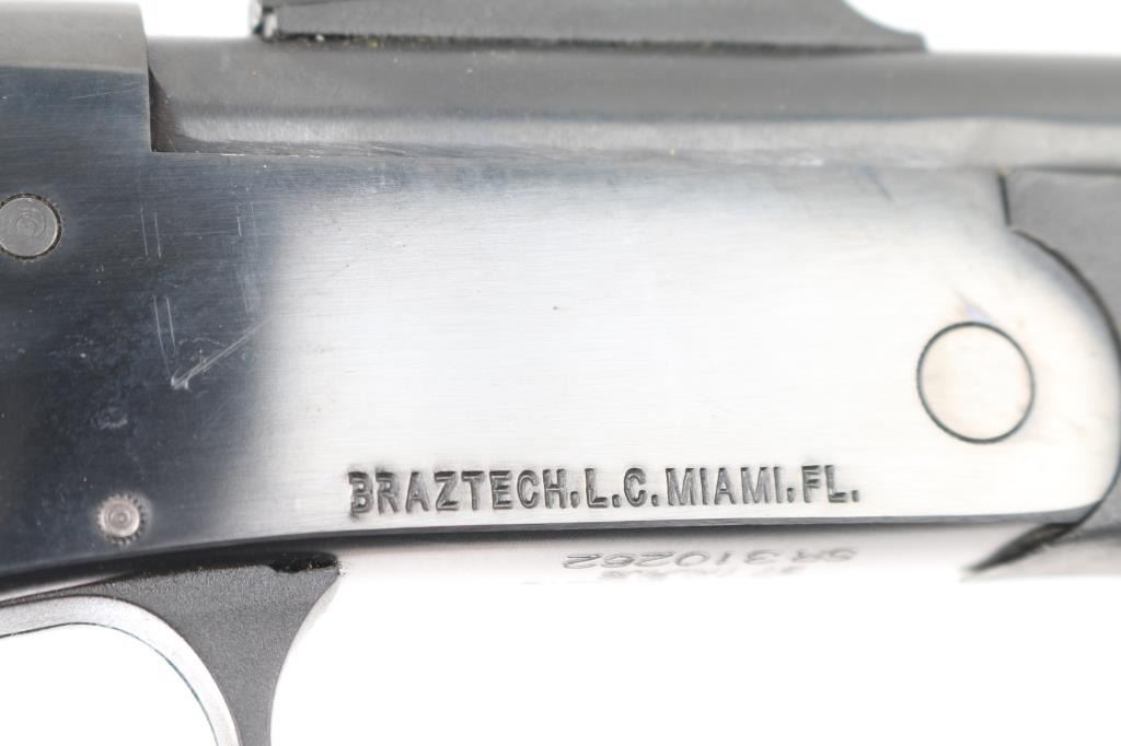 Brazilian made single shot break open handgun, imported by Braztech, Miami FL. Features blued finish, 11" barrel, blade front sight with fiber optic insert, adjustable rear sight with fiber optic insert, exposed hammer, manual safety, sling swivel on forend, rubber mono grip with recoil absorbing backstrap. Bore is pristine. Retains 95% finish with handling marks. Includes factory box with 45 Colt/410 Ga barrel, additional forend. Condition is NRA Excellent *** Modern Firearm ***