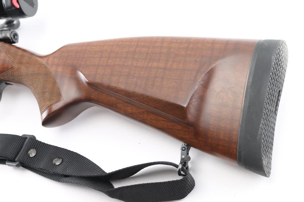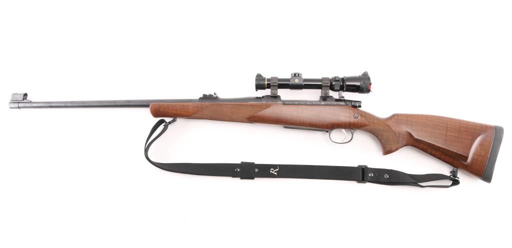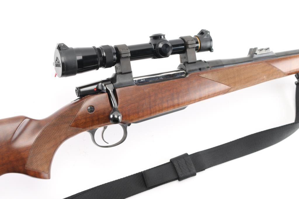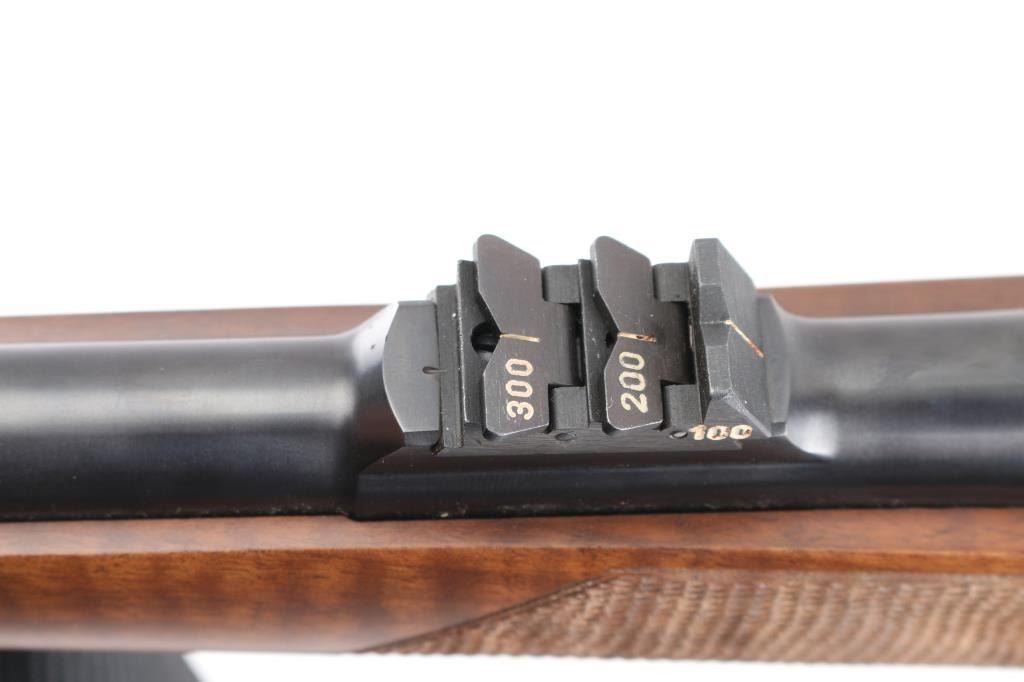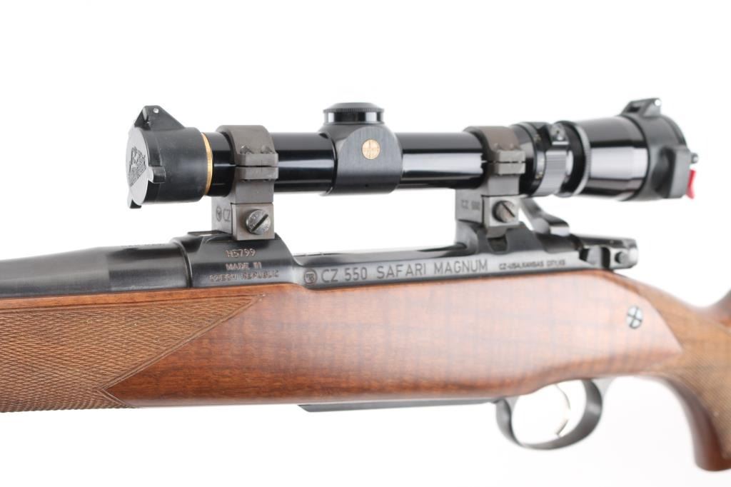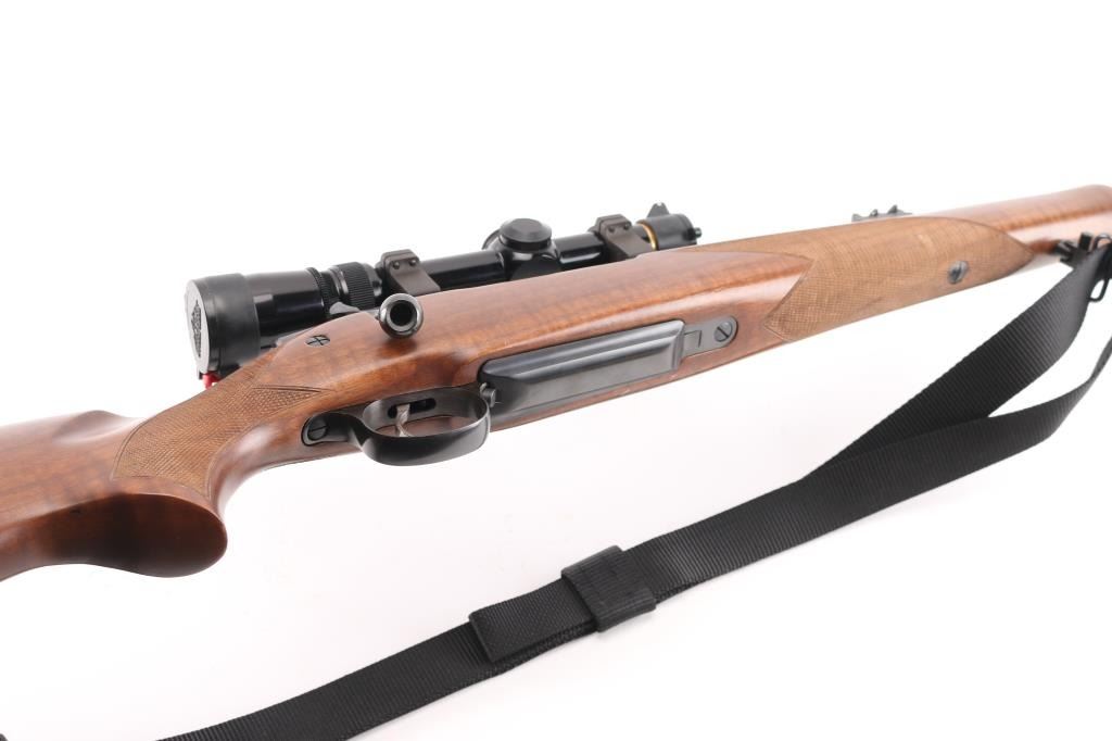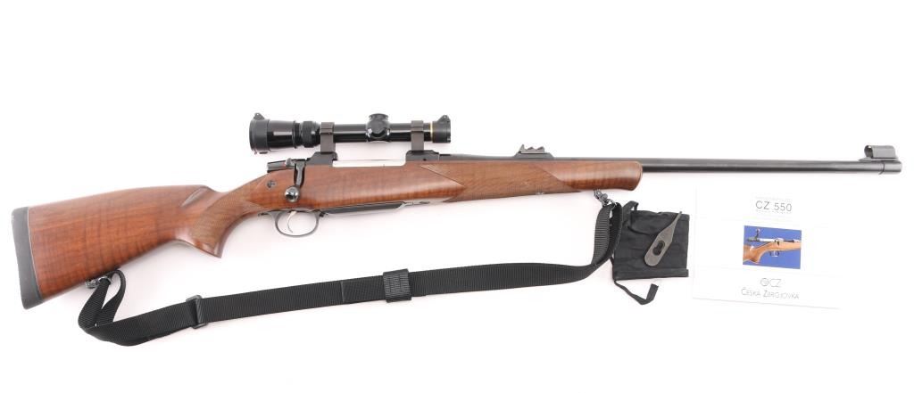 Czech bolt action rifle imported by CZ USA, Kansas City KS. Features blued finish, fancy figured walnut stock with right handed cheekpiece, checkering at wrist & forend, solid rubber recoil pad, 25" barrel, hooded blade front sight, express rear sight island with one standing and two folding leaves, hinged floorplate, manual safety, black nylon sling. Mounted with a very good condition Leopold Vari-X III 1.5-5x20mm scope with Butler Creek caps.. Bore is very good condition/bright. Retains 99% blue finish. Stock is excellent. Comes with owners manual & related documents, test target. and take-down tool. Condition is NRA Excellent. Modern Firearm.