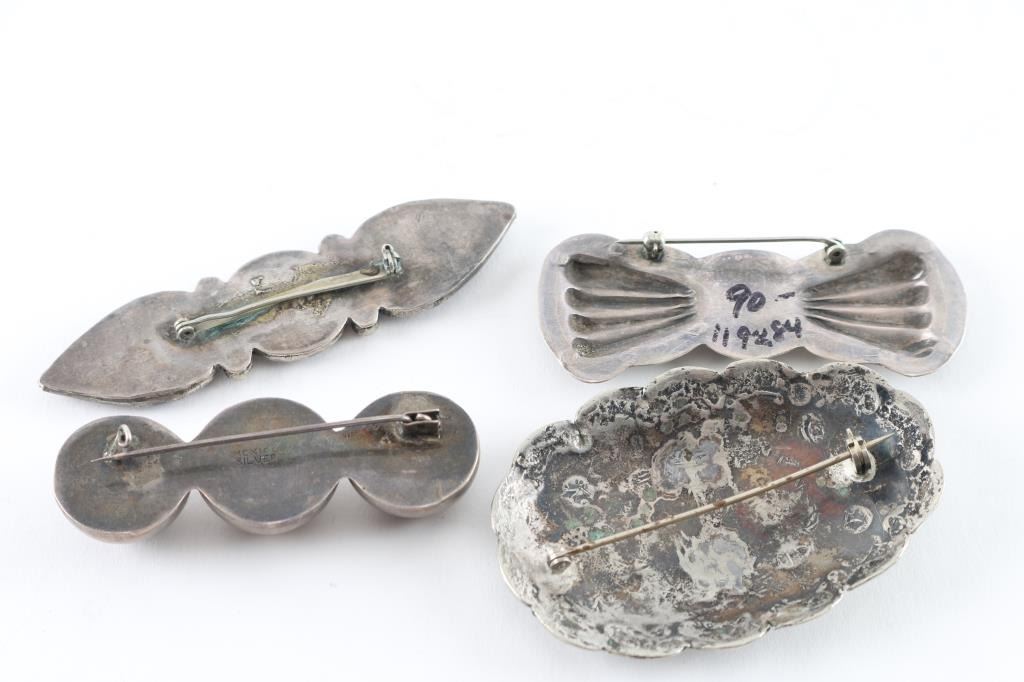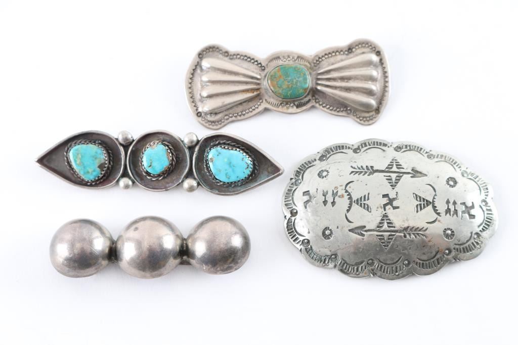 (1) Large concho style pin with stamped geometric designs, all sterling silver. (1) Bowtie style pin with turquoise, set in sterling silver. (1) Old pawn three-stone sterling silver pin. (1) Mexican sterling silver bubble pin.