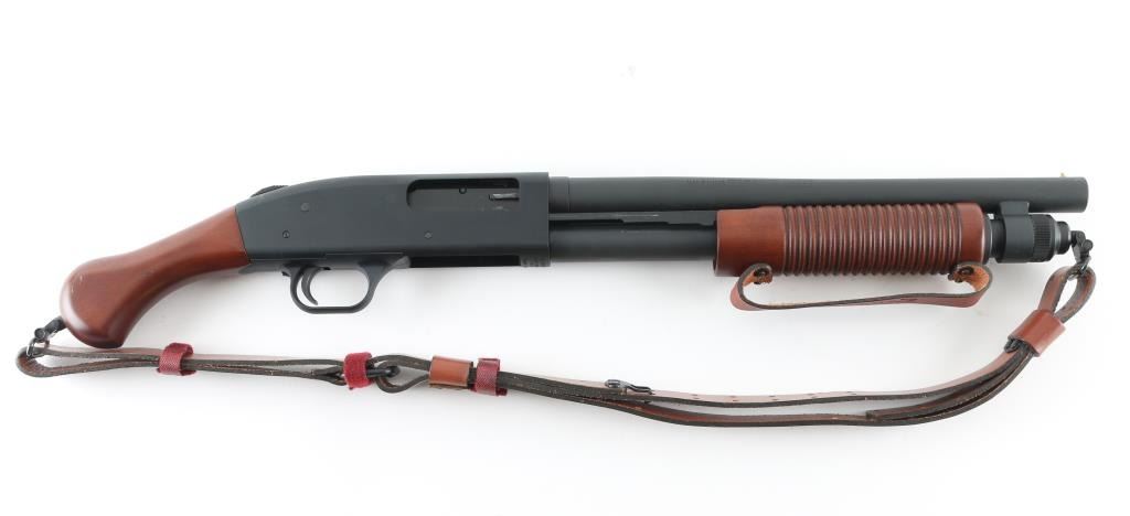 American made slide action repeating firearm chambered for 2 ¾” & 3” 12 gauge shells. Features a matte blued/black finish, smooth bore 14 3/8” heavy-walled barrel, brass bead front sight, full-length 5 round tube magazine, smooth trigger, sliding safety on the rear of the receiver, dual action bars, swivel studs, factory drilled & tapped aluminum receiver, grooved walnut slide handle with leather strap and smooth walnut bird’s head raptor grip. Comes with a brown leather sling and swivels. Metal finish looks very good with some signs of handling. Wood stocks look very good with a couple of tiny dings in the raptor grip. Bore looks good, dusty. Condition is NRA Very Good *Modern Firearm*