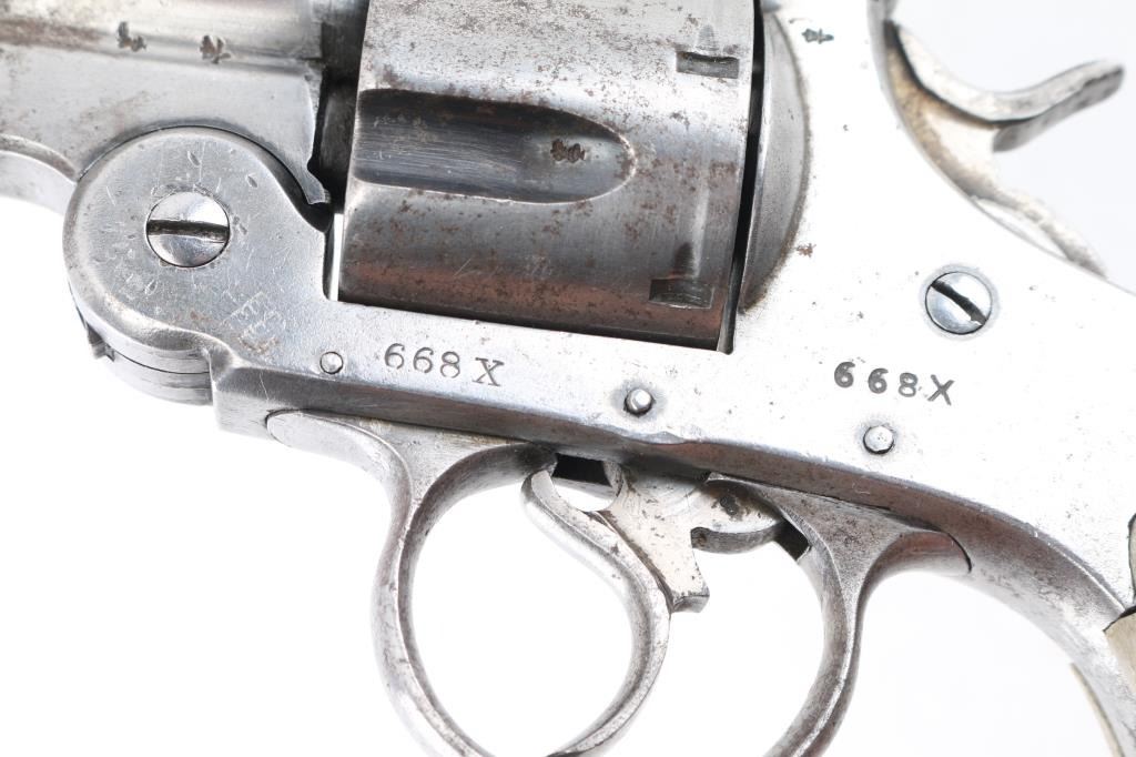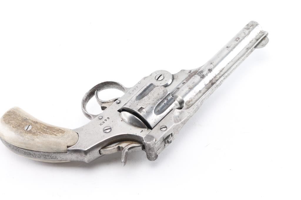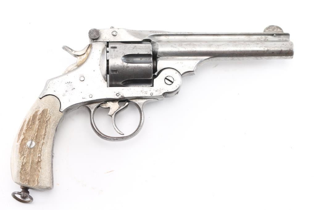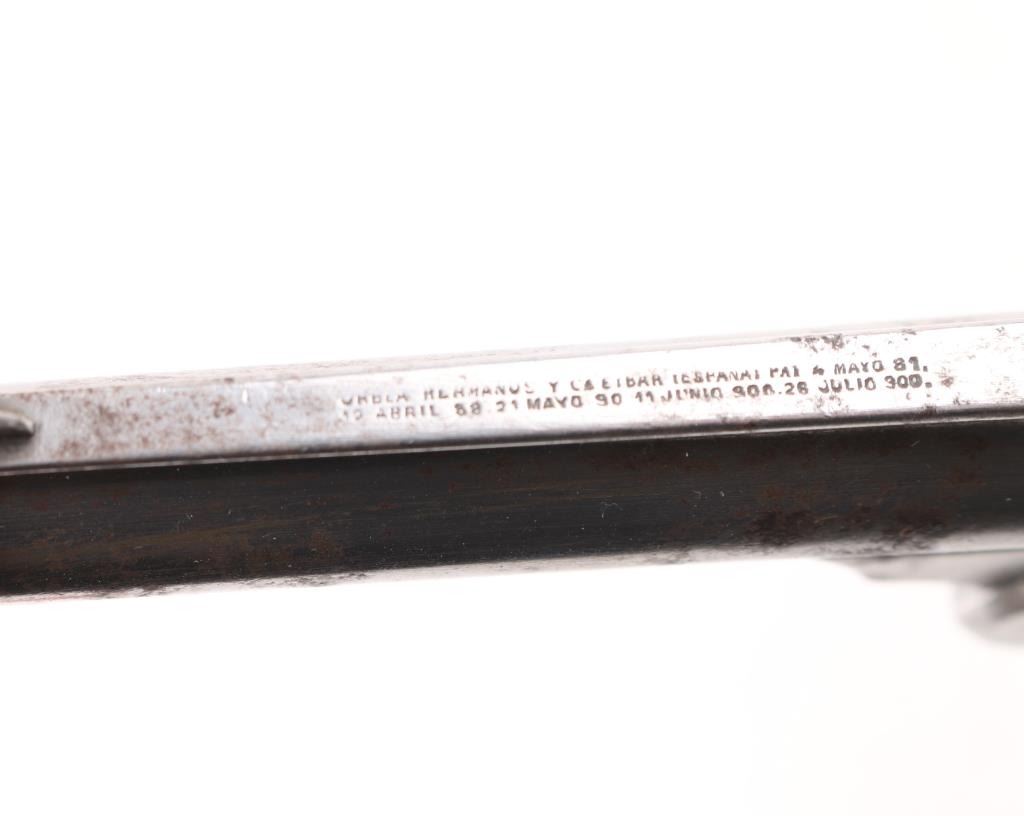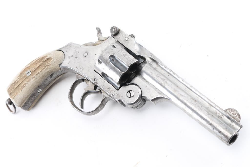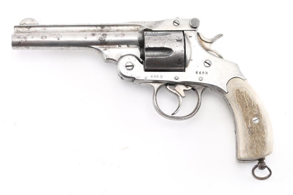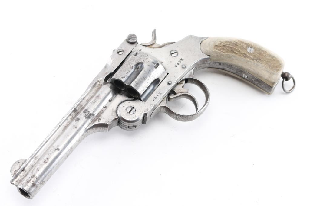 Spanish copy of Smith & Wesson Top Break DA. Features, blue finish, approx 5" barrel, fixed sights, six shot cylinder, single/double action, top break loading/unloading, lanyard ring at butt. Bore is good condition, very minor areas of light pits with intact rifling. Charge holes are fair with some darkness and light pitting. Blue finish is mostly in the white with blue remaining in the cylinder flutes. Flux stag grips are very good condition. Action operates a little stiffly, Fires double action only, ejector star works. Only visible markings are the two line address on top of barrel, the serial number is stamped twice on the left frame,the Orbea Hermanos trade mark on the right frame, which looks like the S&W. and a few Spanish proofs. Condition is NRA Fair. C&R Firearm.