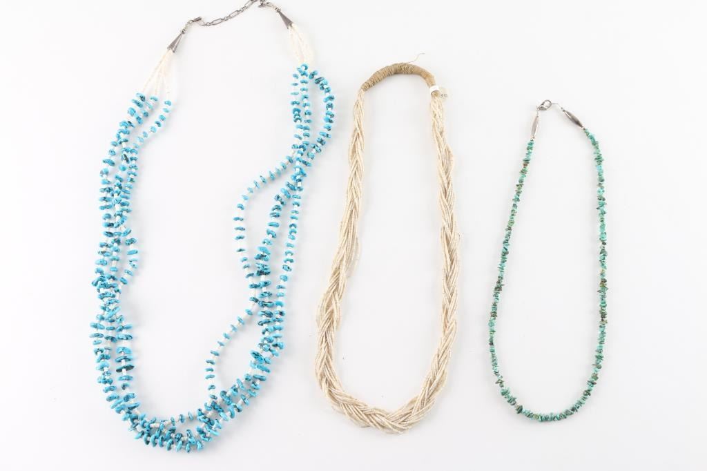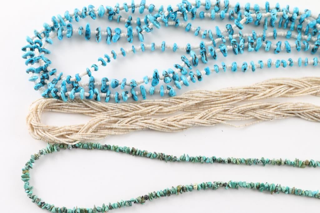 (1) 3-strand turquoise 3-strand & white glass bead necklace (1) Single strand turquoise necklace (1) Multi-strand braided heishi necklace