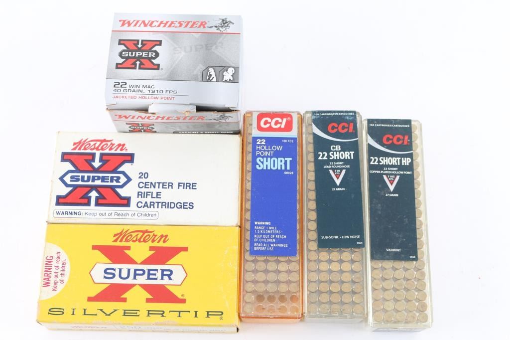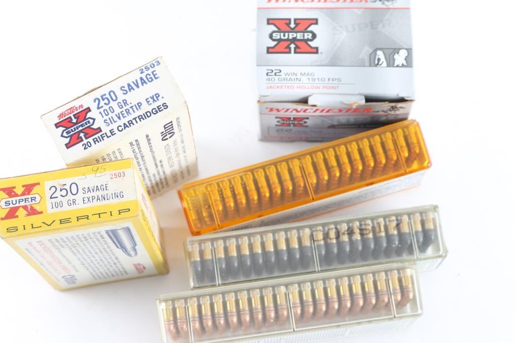Approx. 80 rounds of 22 Win Mag; approx. 192 rounds of 22 Short; approx. 40 rounds of 250 Savage, all in factory boxes.