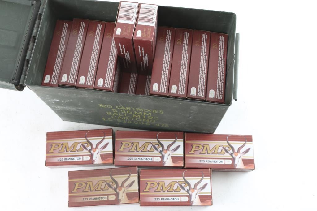 Approx. 500 rounds of factory new .223 Remington ammunition, PMP (South Africa) make, 55 Gr. FMJ in factory boxes. All in metal ammo can.