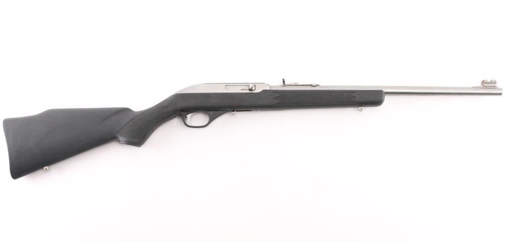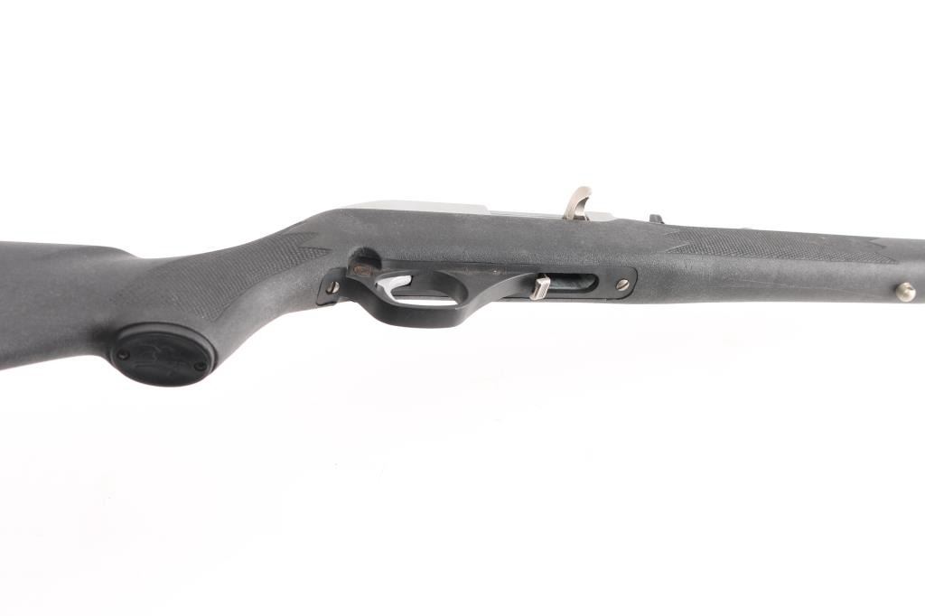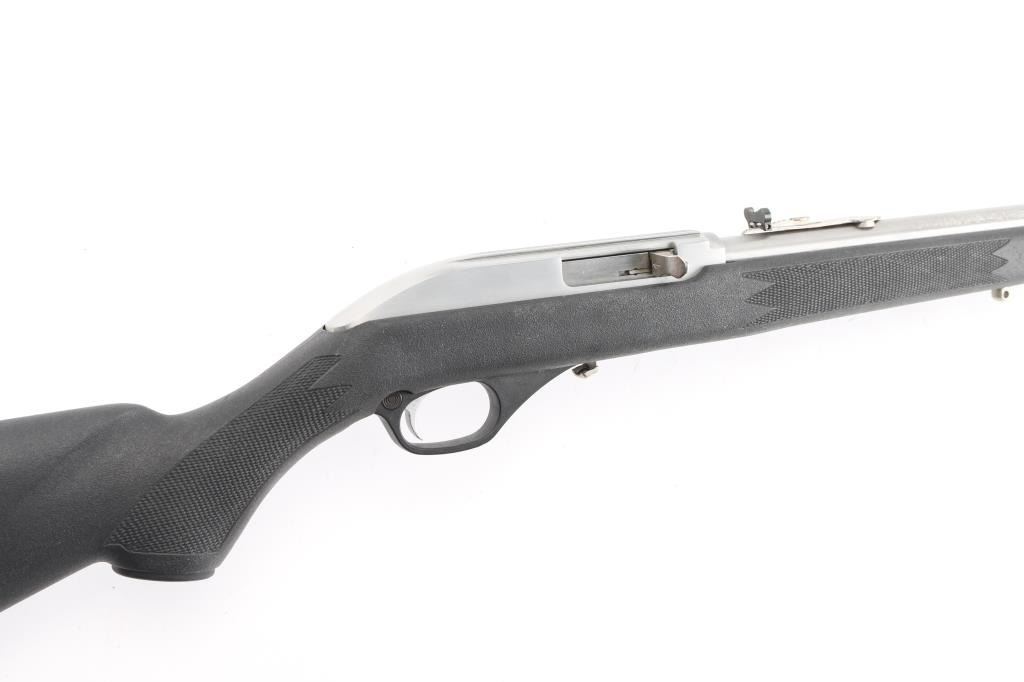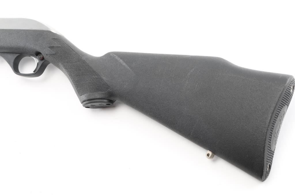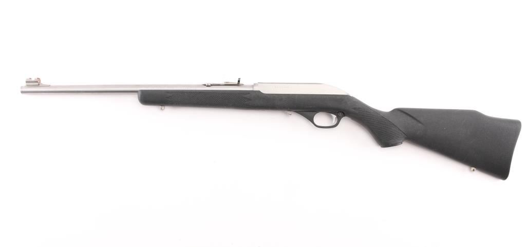 Semiautomatic rimfire rifle for 22 long rifle only. Features stainless steel construction with matching silver color aluminum alloy receiver, black polymer stock with matching trigger guard, black plastic buttplate, 18" barrel, accepts detachable magazine (none provided), orange polymer blade front sight with hood, sporting rear sight folds, grooved receiver, bolt locks to rear by pressing handle in, push button safety, sling studs. Bore is very good condition. Overall excellent condition with minor handling marks. NO MAGAZINE. Condition is near NRA Excellent *** Modern Firearm ***