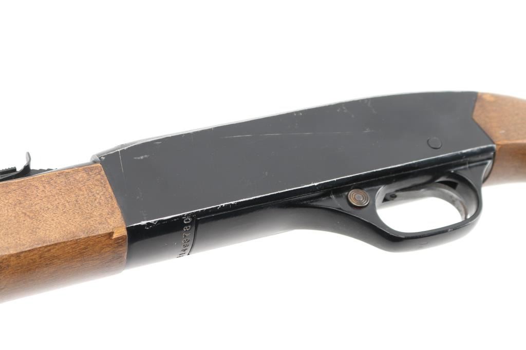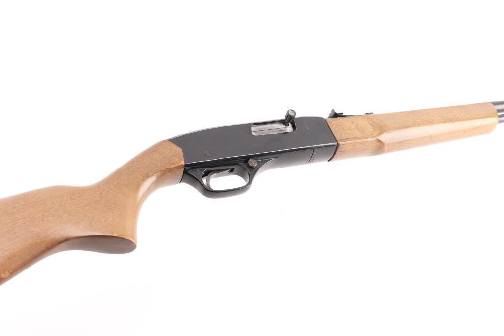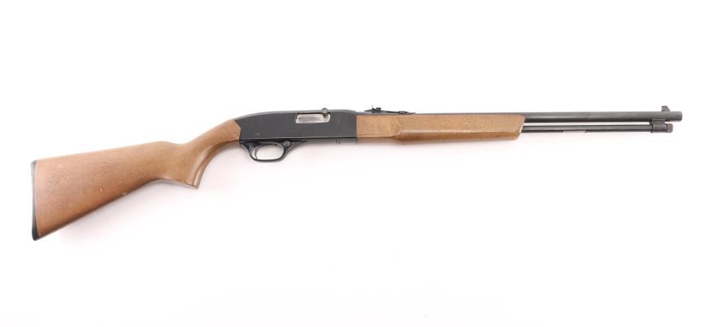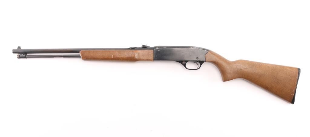 Semiautomatic rimfire rifle features blued finish, black finished receiver, smooth wood forend & shoulder stock, 20.5" barrel with magazine tube underneath, blade front & sporting rear sights, manual bolt hold open, push button safety. Bore is very good condition. Retains 75% finish with bare metal showing across top of receiver, some light rust and patches of patina or pitting on barrel. Wood is very good condition with scuffs, scratches. Condition is NRA Good++ *** Modern Firearm ***