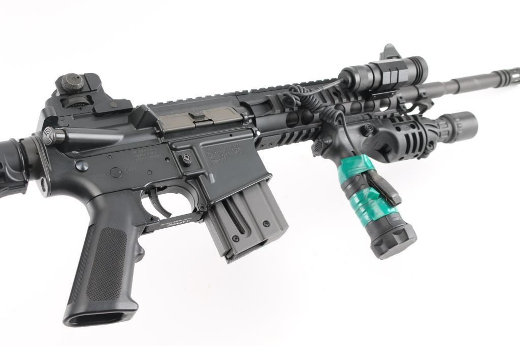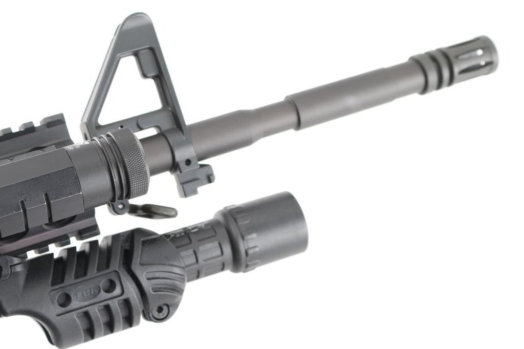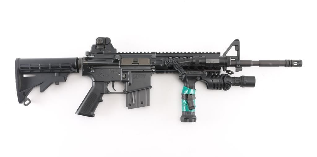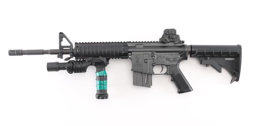 SN: BP022034 Made in Germany by Walther under Colt license, and imported by Umarex, Fort Smith AR. Features matte black finish with polymer furniture, 16.5" barrel, A2 front sight and bayonet lug assembly, peep rear sight assembly, quad rail handguard, Picatinny rail flat top receiver, birdcage flash hider, rear charging handle, faux forward assist, dust cover, manual safety (rotates 180 degrees between S and F), push button magazine release. Bore is very good condition. Retains 95% finish with handling marks. Polymer is very good condition with few blemishes. Includes one magazine (appears to hold 10 rounds), forward grip with socket for a Surefire flashlight (polymer body, not tested), green NCstar laser (not tested). Condition is NRA Excellent *** Modern Firearm ***