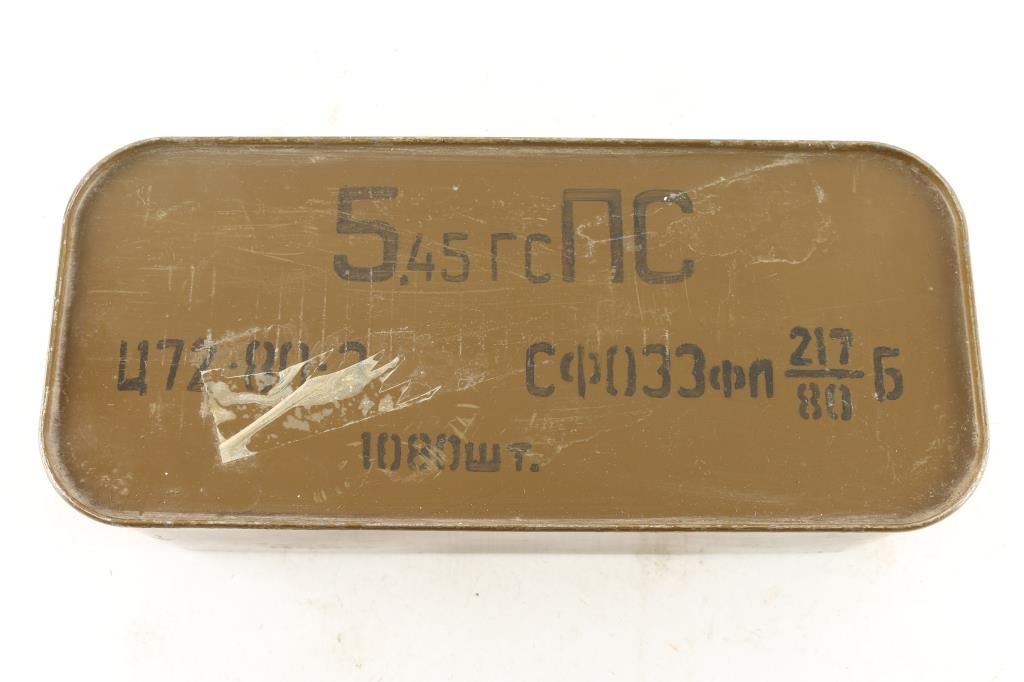 Approx. 1080 rounds of 5.45 X 39mm ammunition. 52 Gr. FMJ, 7N6 steel core corrosive, Berdan primed lacquered steel case. All in Spam can.