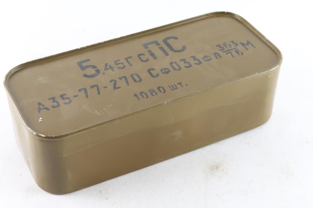 Approx. 1080 rounds of 5.45 X 39mm ammunition. 52 Gr. FMJ, 7N6 steel core corrosive, Berdan primed lacquered steel case. All in Spam can.