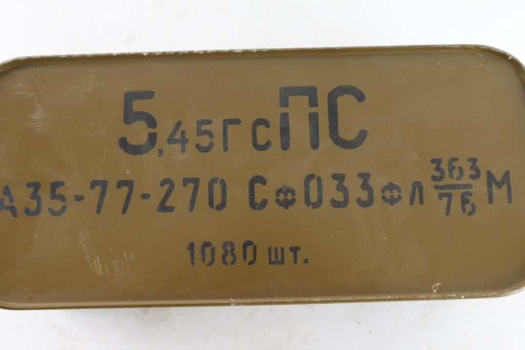 Approx. 1080 rounds of 5.45 X 39mm ammunition. 52 Gr. FMJ, 7N6 steel core corrosive, Berdan primed lacquered steel case. All in Spam can.