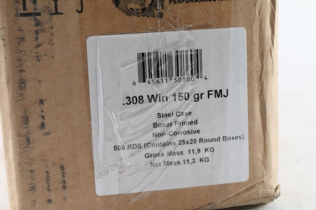 Approx. 500 rounds of .308 Winchester ammunition. Wolf 150 Gr. FMJ. Non-corrosive, boxer primed steel case. In factory boxes, 1 case.