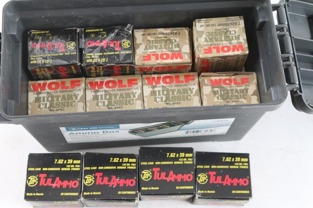 Approx. 400 rounds of factory new 7.62 X 39mm ammunition, Tula & WPA in factory boxes. All in plastic ammo can.