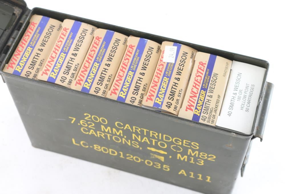 Approx. 350 rounds of factory new 40 S&W ammunition. 300 rnds of Winchester 180 Gr. SXT & 50 rnds of new reloads, in factory boxes. All in metal ammo can.