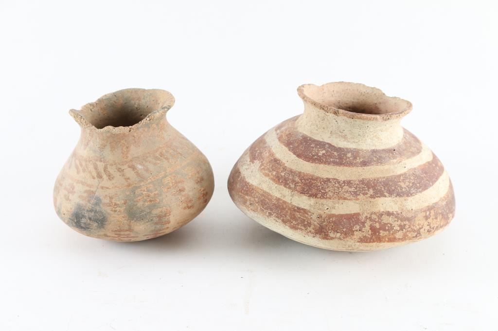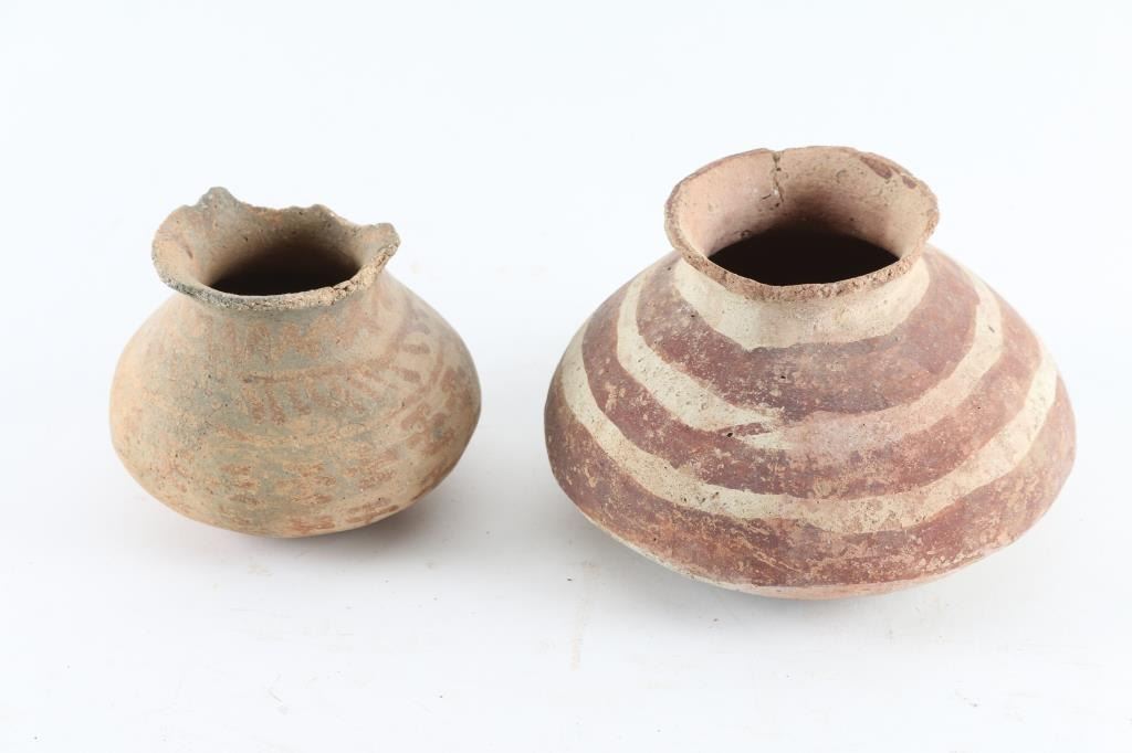 Both red on buff, larger one is 6" x 4" and smaller one is 4" x 3"; both in fair to poor condition. Losses to rim.