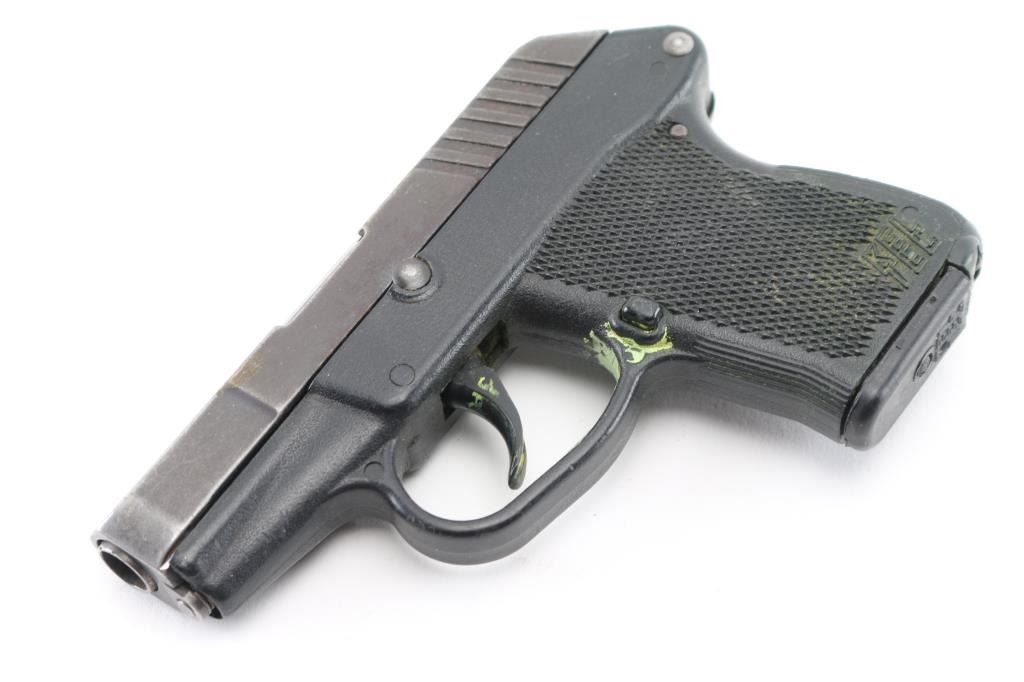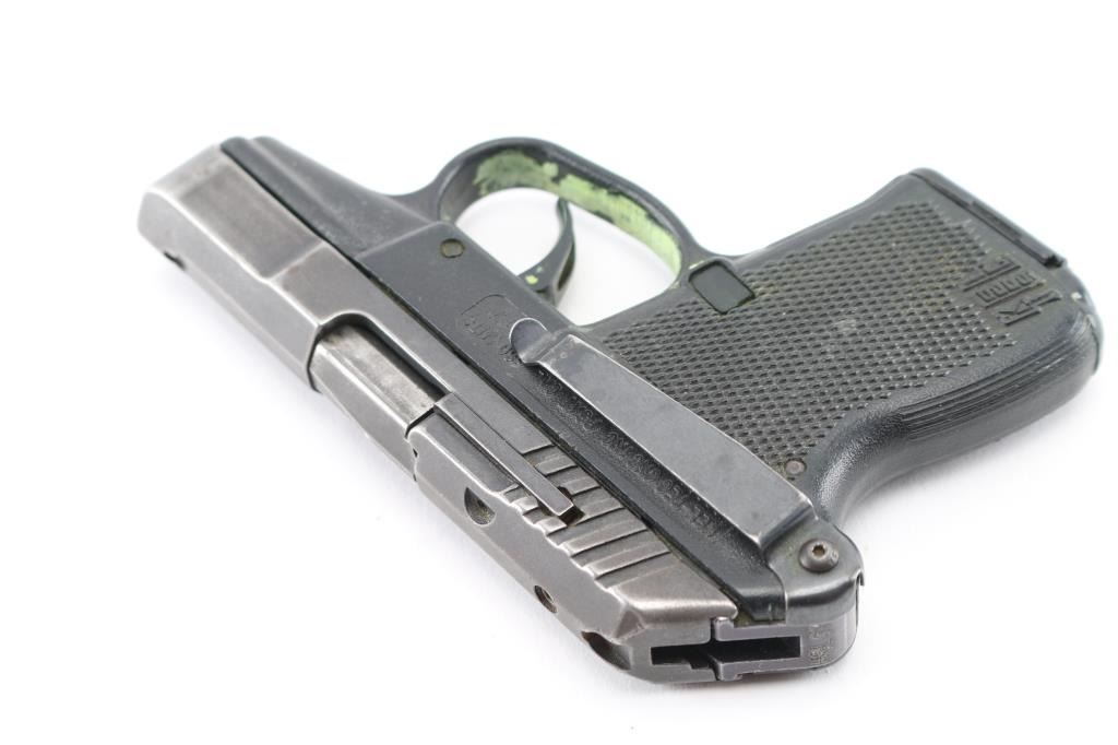 Semiautomatic pistol chambered for 380 Auto. Features blued slide, black polymer frame, double action only trigger (no second strike), fixed sights, push button magazine release, belt clip on right side of frame. Bore is very good condition. Bluing is faded and dull, 75% coverage with thinning and edge losses. Polymer frame is very good, appears to have been painted, paint later removed, retaining some yellow color in protected areas. Includes one magazine. Condition is NRA Very Good *** Modern Firearm ***