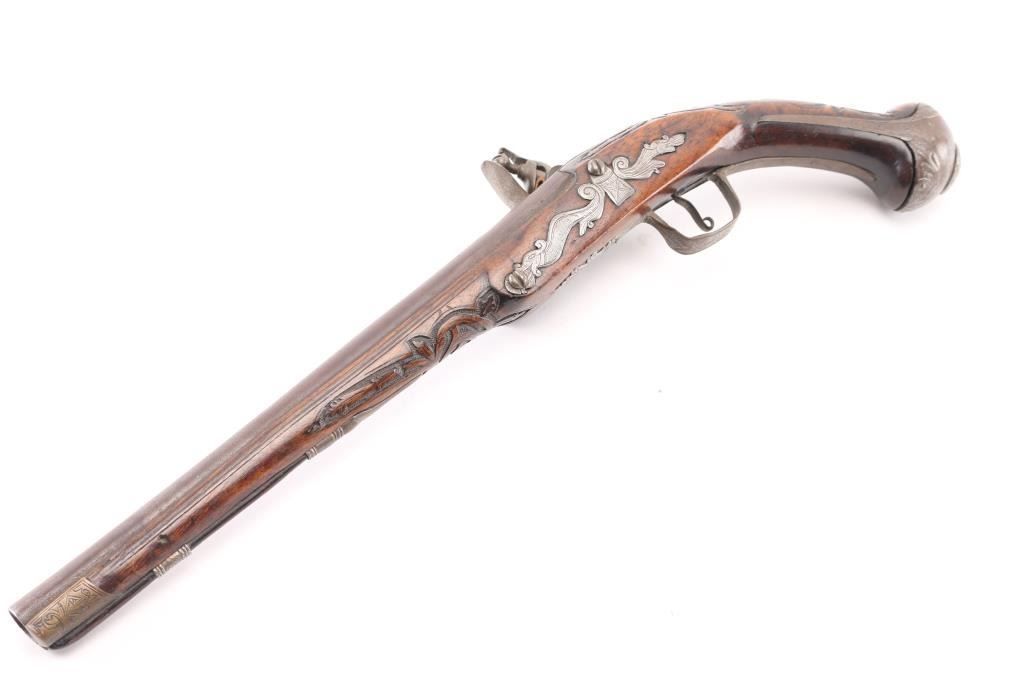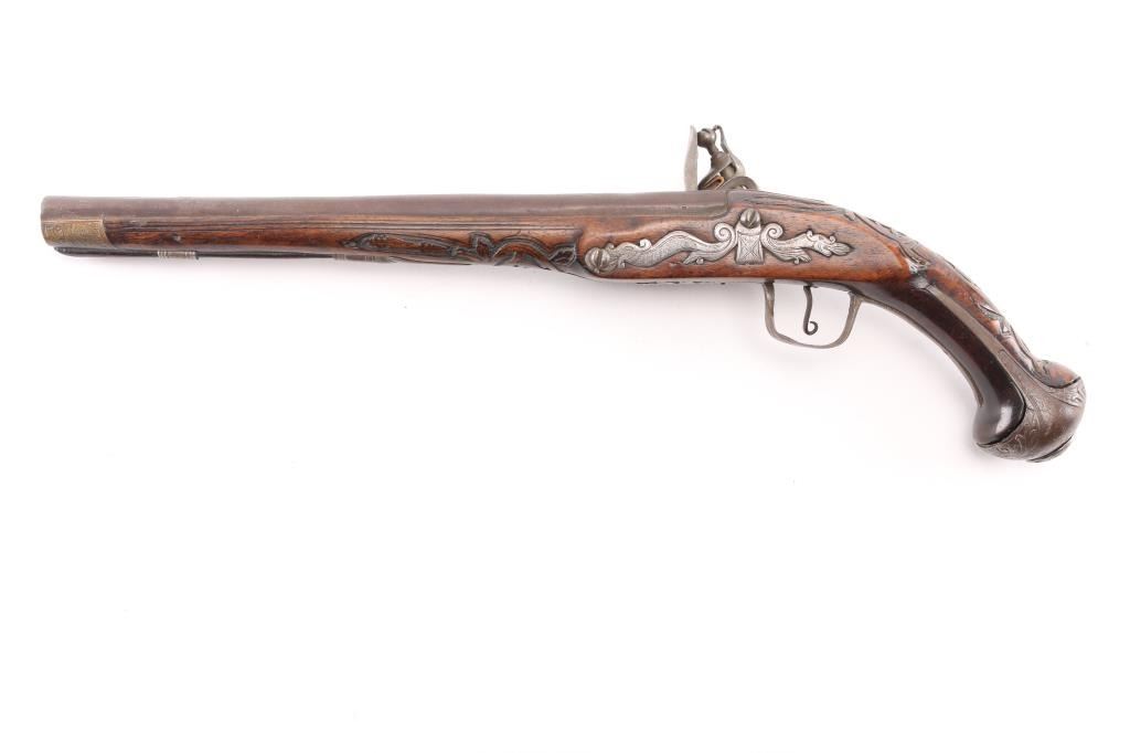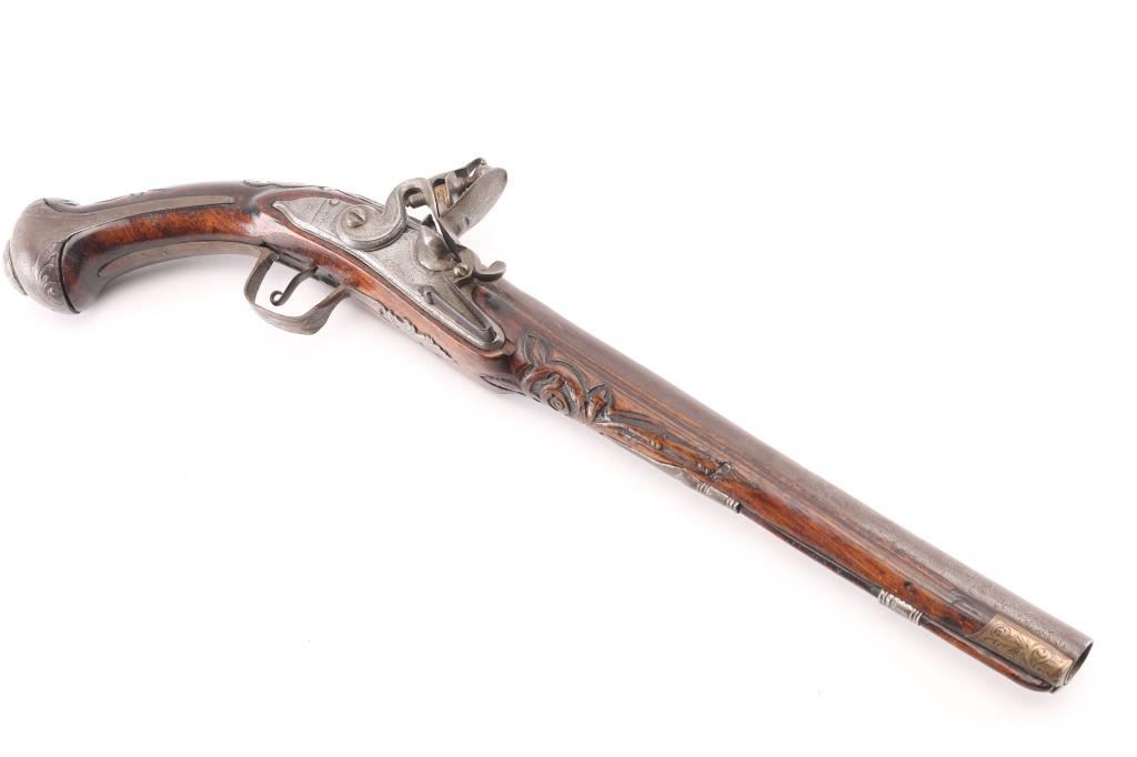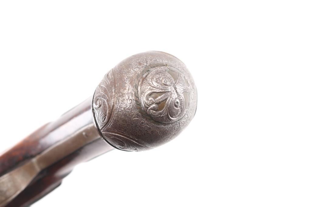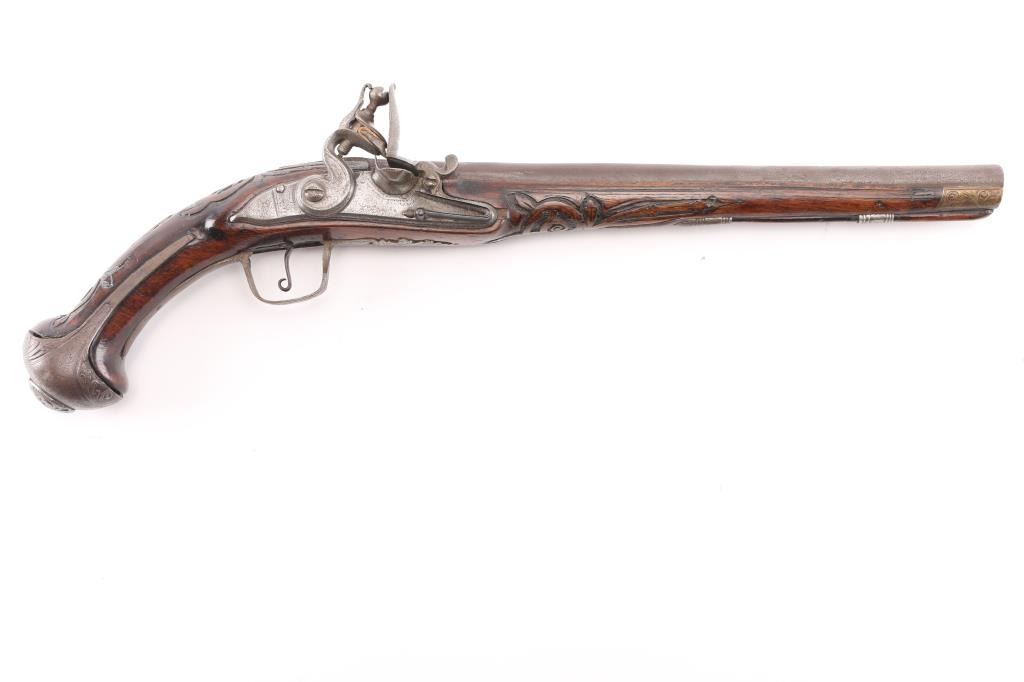 Circa 18th Century single shot pistol features right hand lock, approx 12" smooth bored barrel of approx 60 caliber, walnut stock with decorative carving, iron pommel and fittings, engraved brass stock cap at muzzle, wood ramrod under barrel, engraved and decorated on butt and serpentine. Barrel shows brown patina color, other metal generally a dull gray color. Wood is good condition, dark and stained, no obvious visible cracks. Action is sound. Condition is NRA Very Good *** Antique Firearm ***