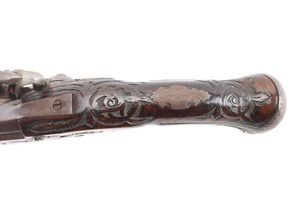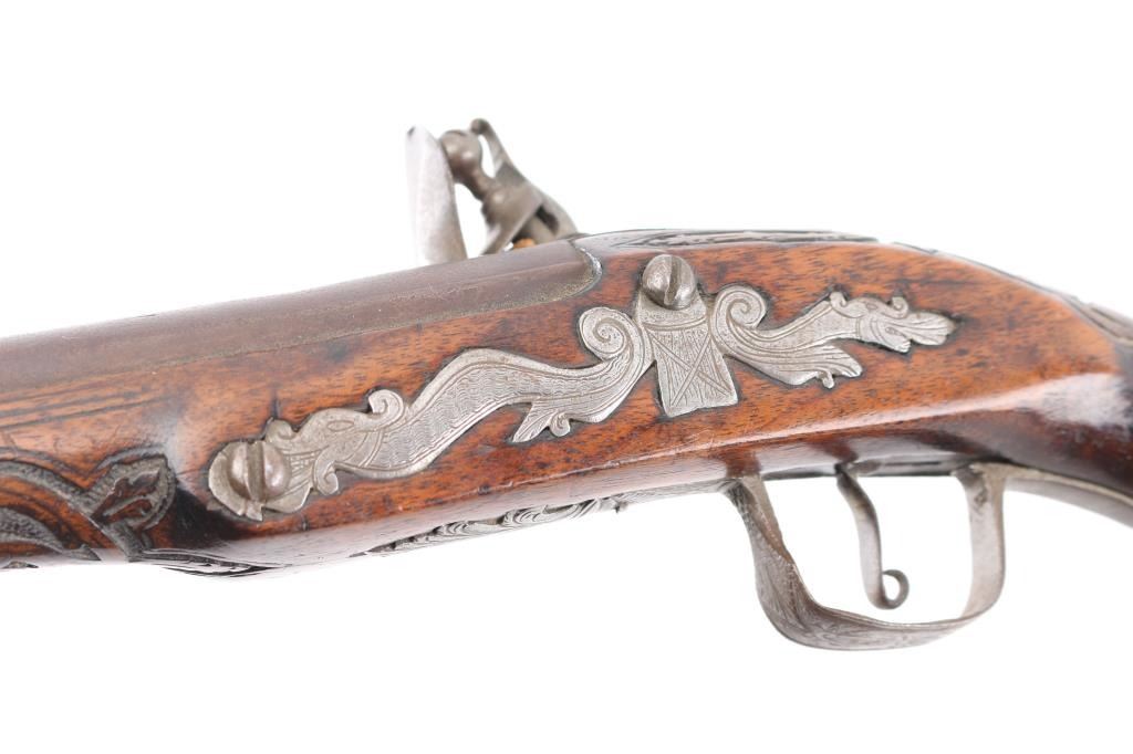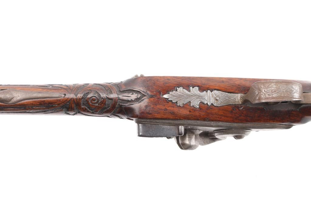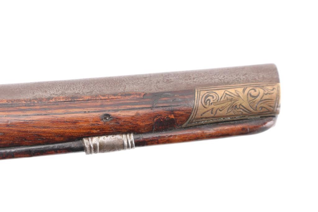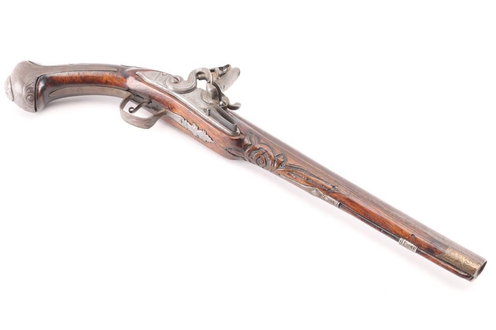 Circa 18th Century single shot pistol features right hand lock, approx 12" smooth bored barrel of approx 60 caliber, walnut stock with decorative carving, iron pommel and fittings, engraved brass stock cap at muzzle, wood ramrod under barrel, engraved and decorated on butt and serpentine. Barrel shows brown patina color, other metal generally a dull gray color. Wood is good condition, dark and stained, no obvious visible cracks. Action is sound. Condition is NRA Very Good *** Antique Firearm ***