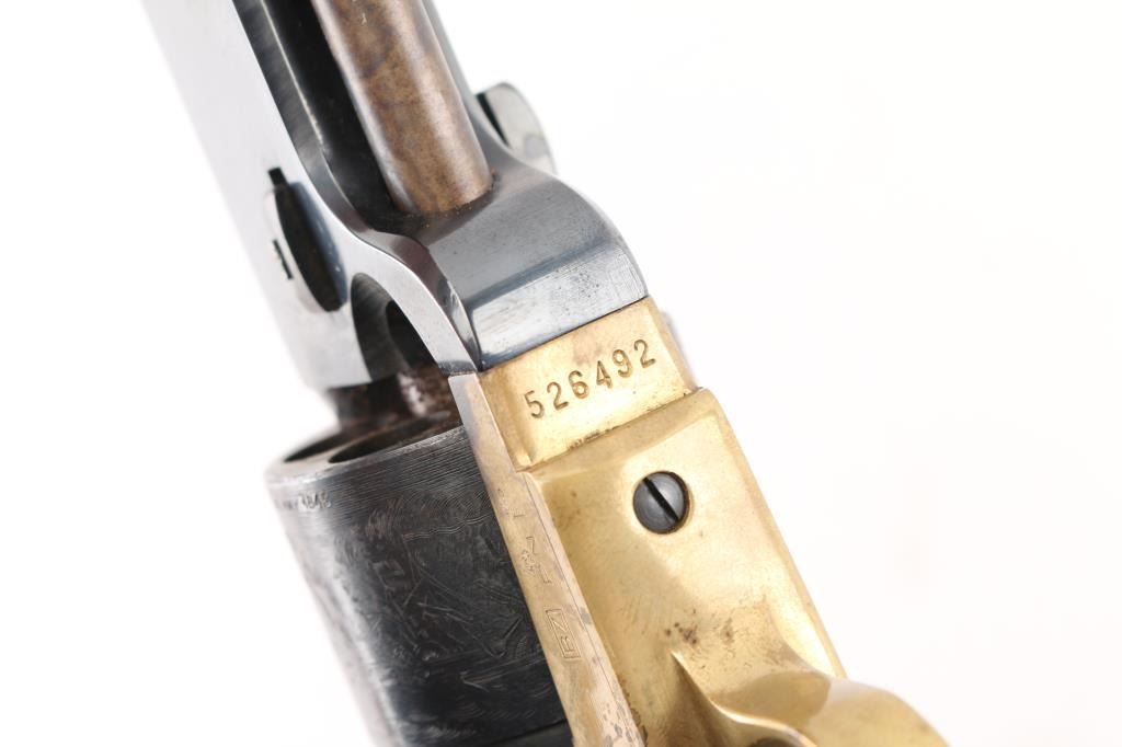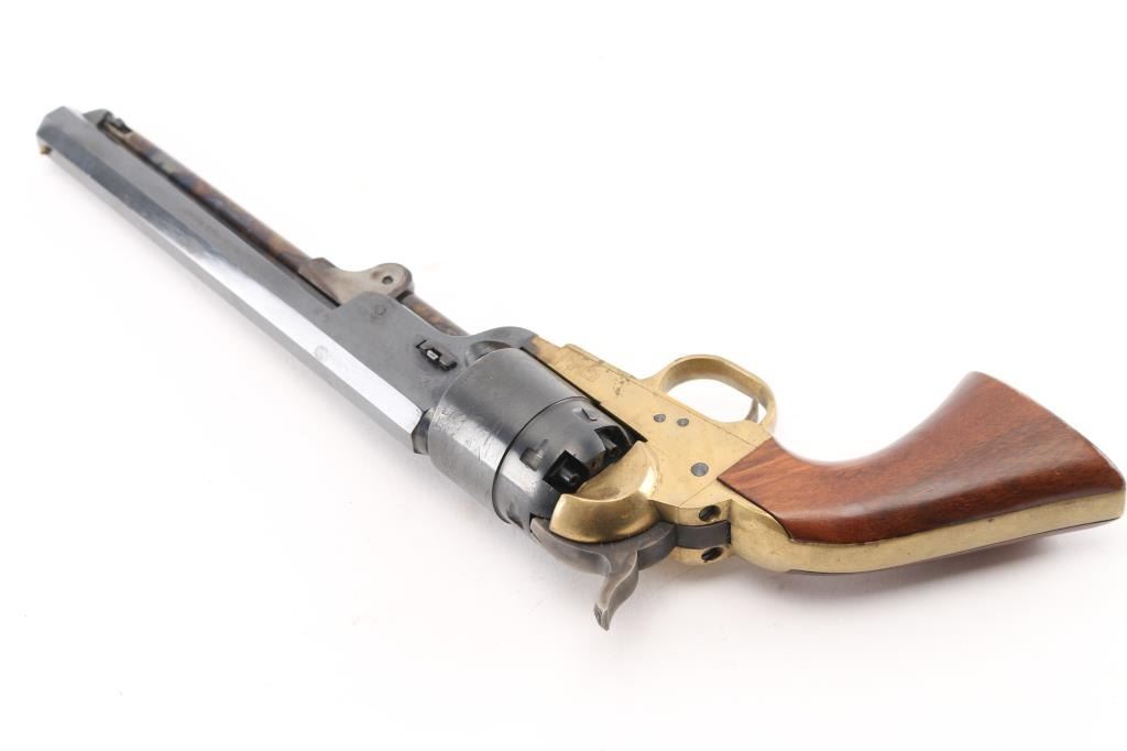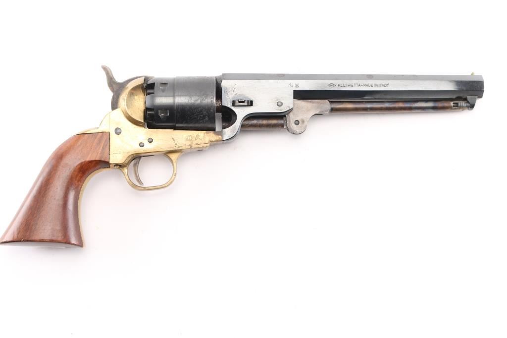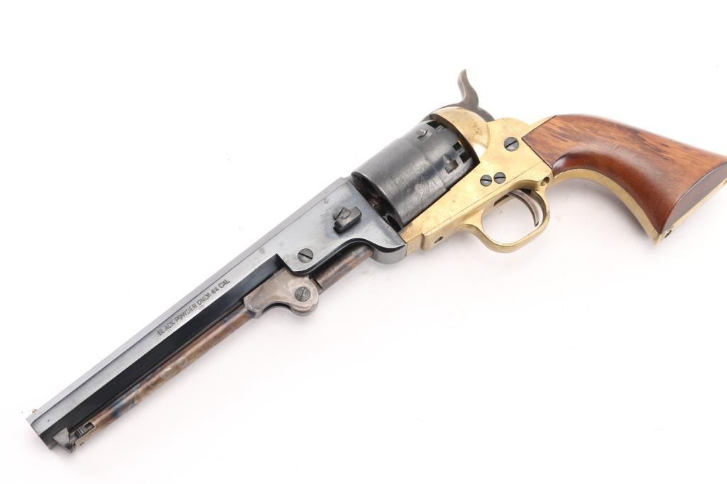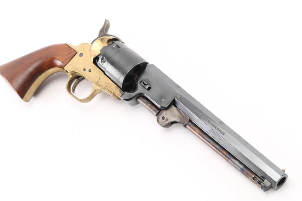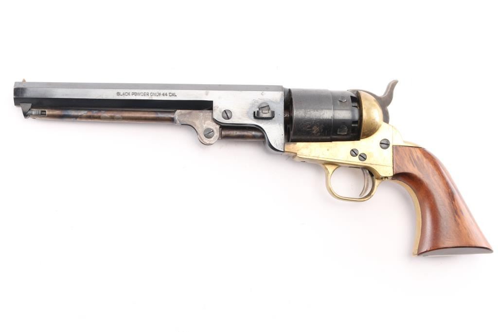 Brass framed Italian "replica" of the Colt 1851 revolver, in 44 cal, with roll engraved scene on rebated cylinder. Features blued barrel & cylinder, case color finish on ram rod & trigger & hammer, 7.5" octagon barrel, brass backstrap and round trigger guard, one piece smooth walnut grip. Appears unfired, with bright shiny bore. Retains 90% finish with handling marks and small losses. Brass has an aged patina color, some brown spots. Action is sound. Condition is NRA Very Good *** 'Antique' Firearm ***