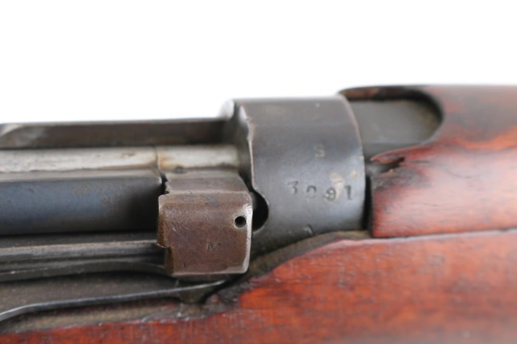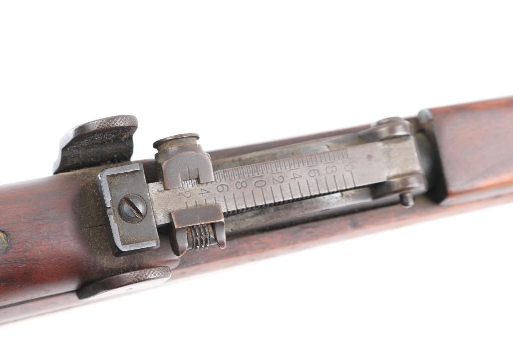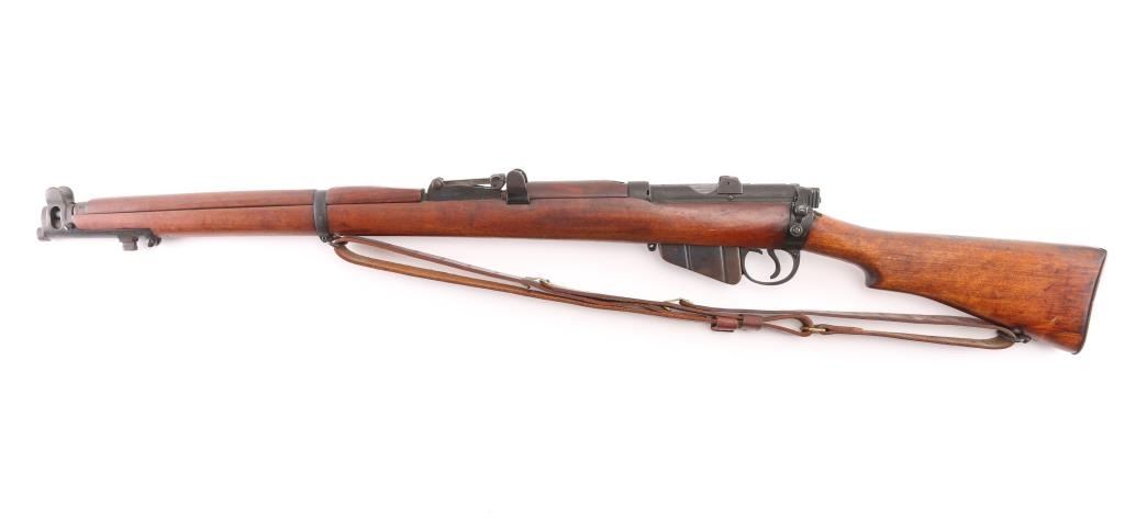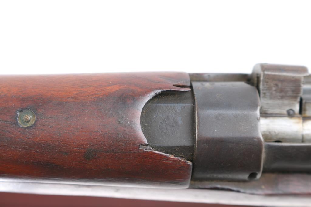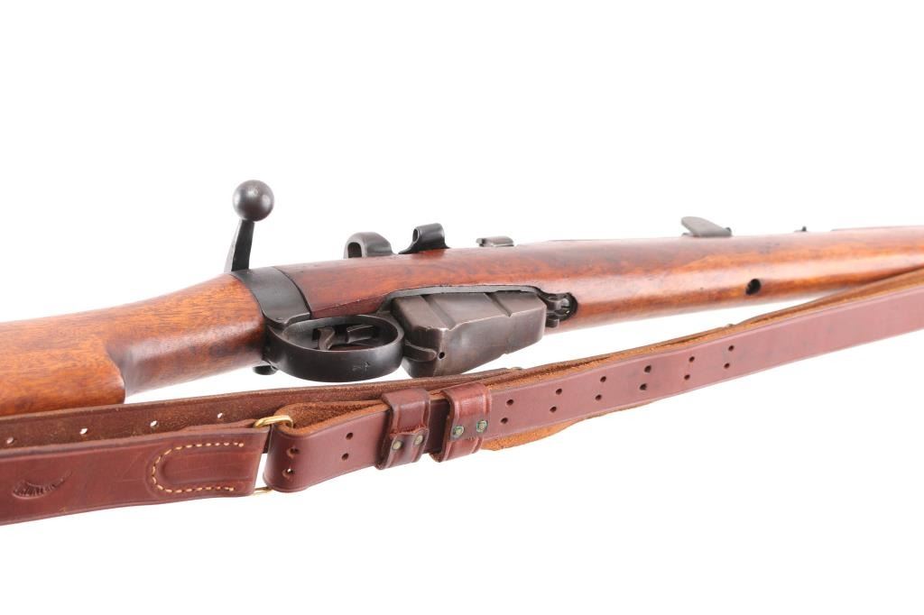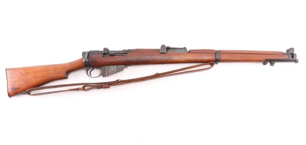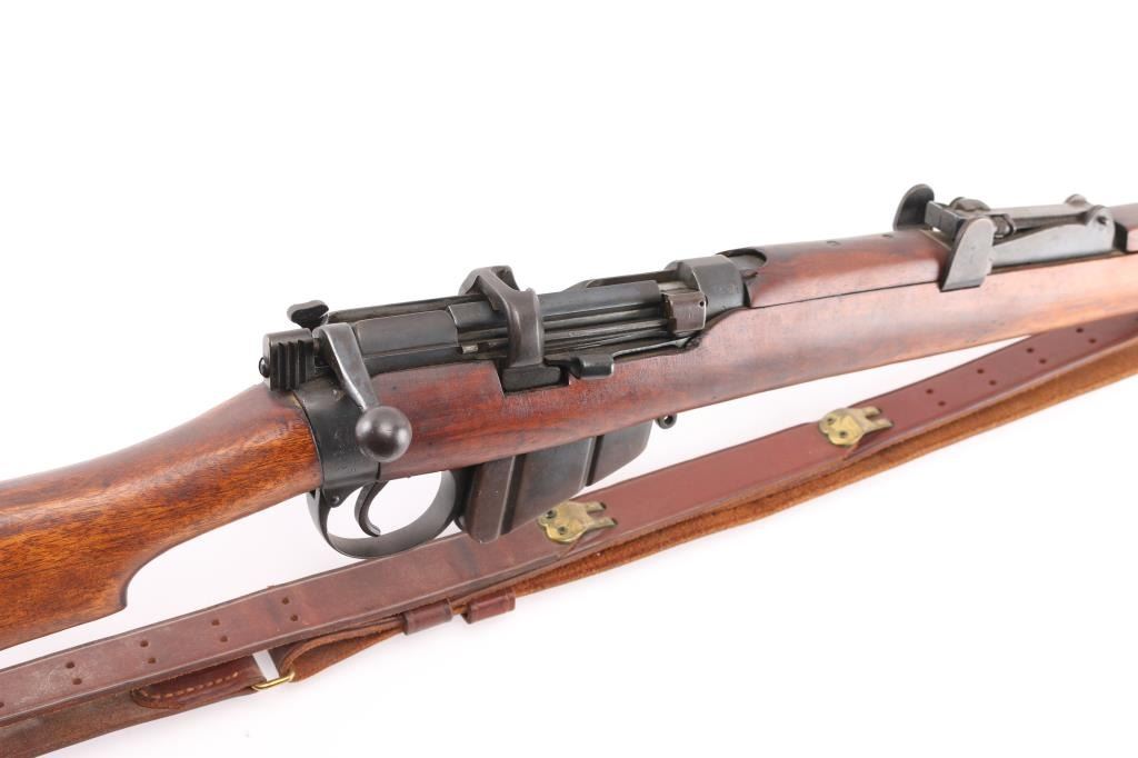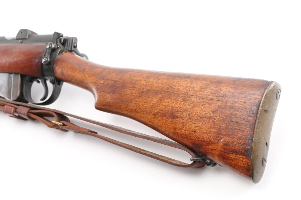 SN: S3201 "Osterr Gendarmerie" marked British military bolt action rifle dated 1915, used by Austrian police after WWII. Refinished/refurbished with thinning or erosion of many markings. Features 25" barrel, bayonet lug, protected post front sight, adjustable rear tangent sight with protective ears, 10 round detachable magazine, magazine cut-off, stripper clip guide bridge, manual safety (does not engage), sling swivels, two piece wood stock with straight grip, brass buttplate with trap door storage compartment. Bore is good to very good condition, with strong rifling, fairly bright overall. Retains 80% re-finish, with some fading and thinning, edge losses, patina brown on much of magazine. Wood is good condition with scratches/dings, good color match among the 4 pieces, some losses to rear edge of rear handguard. No importer marks observed. Matching number on nose cap. Austrian eagle marking over chamber. Includes very good condition Hunter two hook leather sling. Condition is NRA Fair (safety needs adjustment) *** C&R Firearm ***