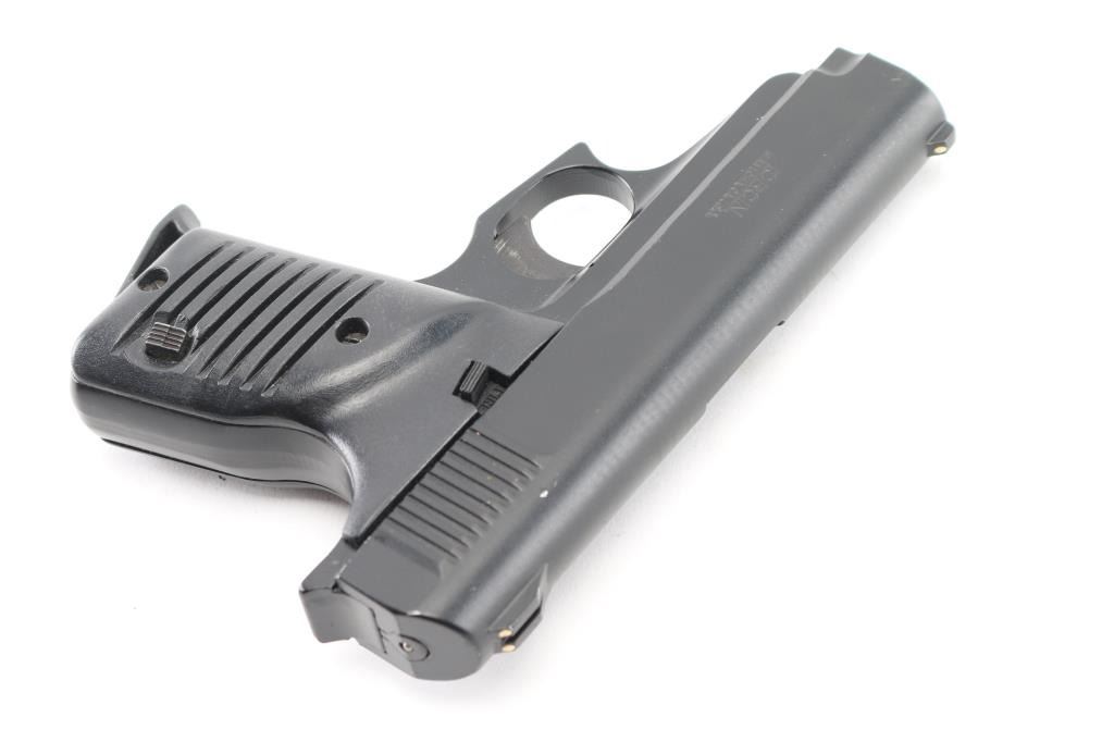 Semi-automatic pistol. Black painted finish. black synthetic grips. 3-dot sights. 3 1/2" barrel. Bore appears very good, needs cleaning. Action is tight. Comes with one 7-rd magazine, with finger extension. A couple of very minor scratches on the finish, otherwise, pistol is in like new condition. NRA Condition-Near Excellent. Modern Firearm.