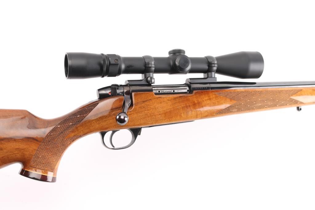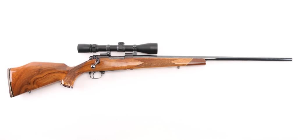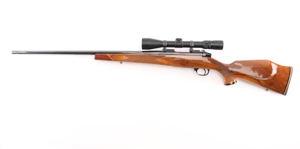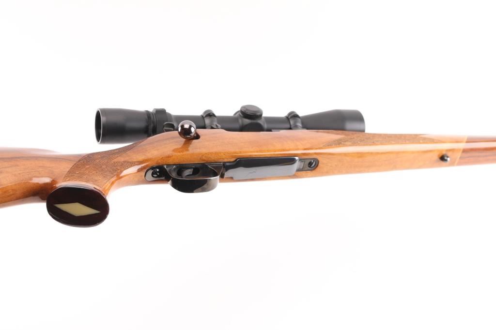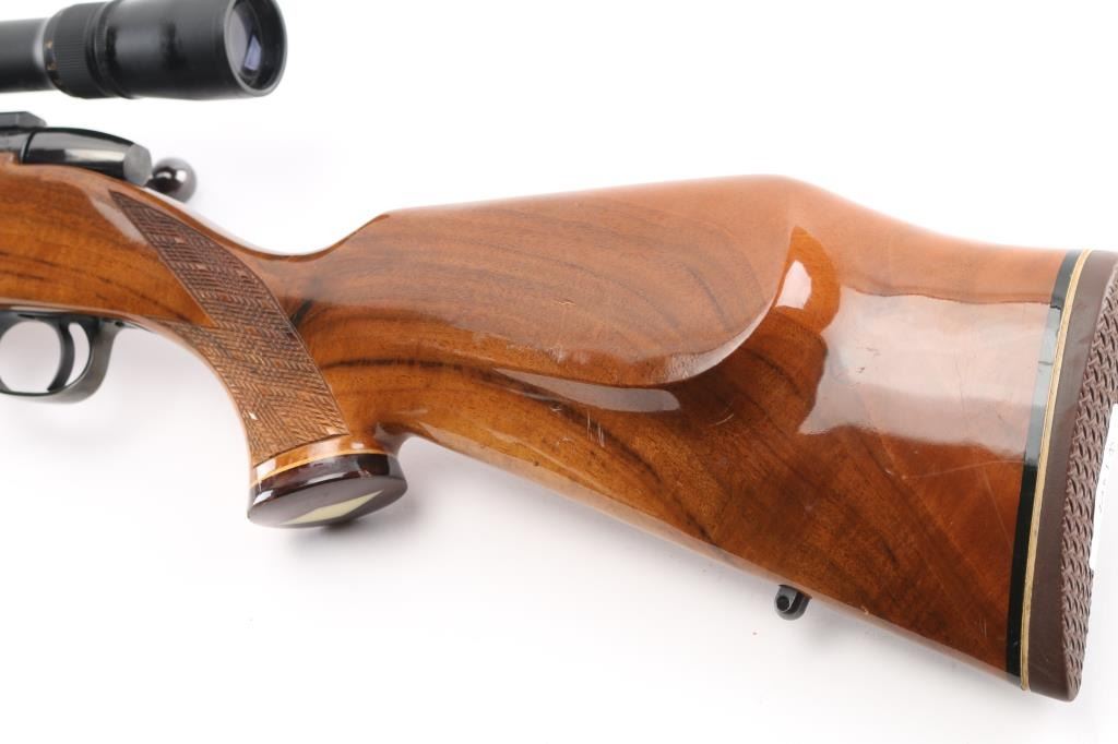 ' Varmintmaster' Made in Japan. Built using a smaller action for smaller, varmint hunting cartridges. Features blued finish, fancy figured walnut stock, 26" barrel, no provisions for sights, two piece Leupold type scope bases & rings mounting a Japanese made 2-10x38mm Weaver scope with duplex reticle, manual safety on bolt shroud, hinged floorplate, sling studs, thin rubber butt pad. Stock is Monte Carlo styled with contrasting grip cap & forend tip, white diamond inset on grip cap, curved grip, high combed right hand cheek piece, checkered panels at wrist & forend, urethane type finish. Bore is very good bright condition. Retains 90% finish with handling marks, some small scrapes on barrel. Stock is very good condition with scrapes and dings, small chip out of grip cap. Scope is excellent condition with clear view. Condition is NRA Very Good++ *** Modern Firearm ***