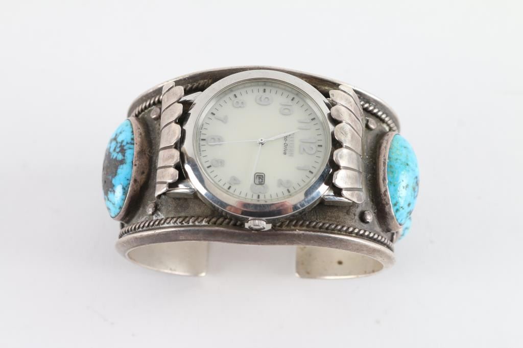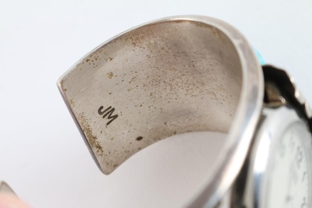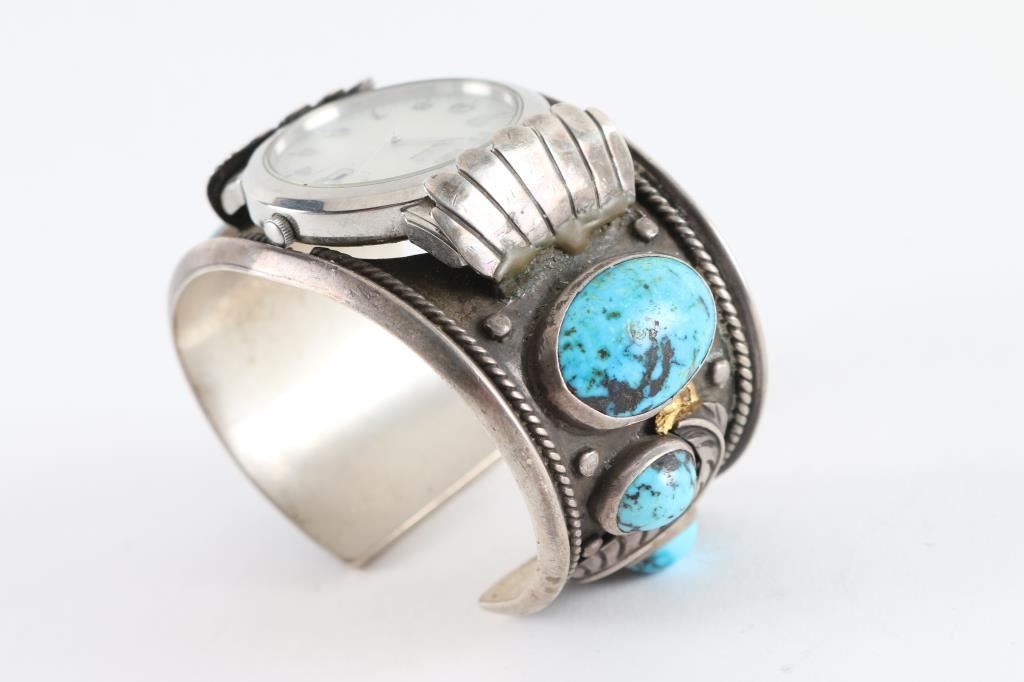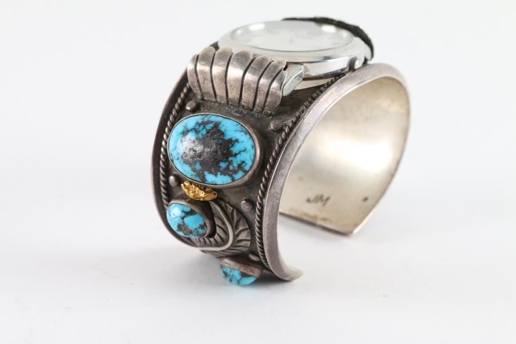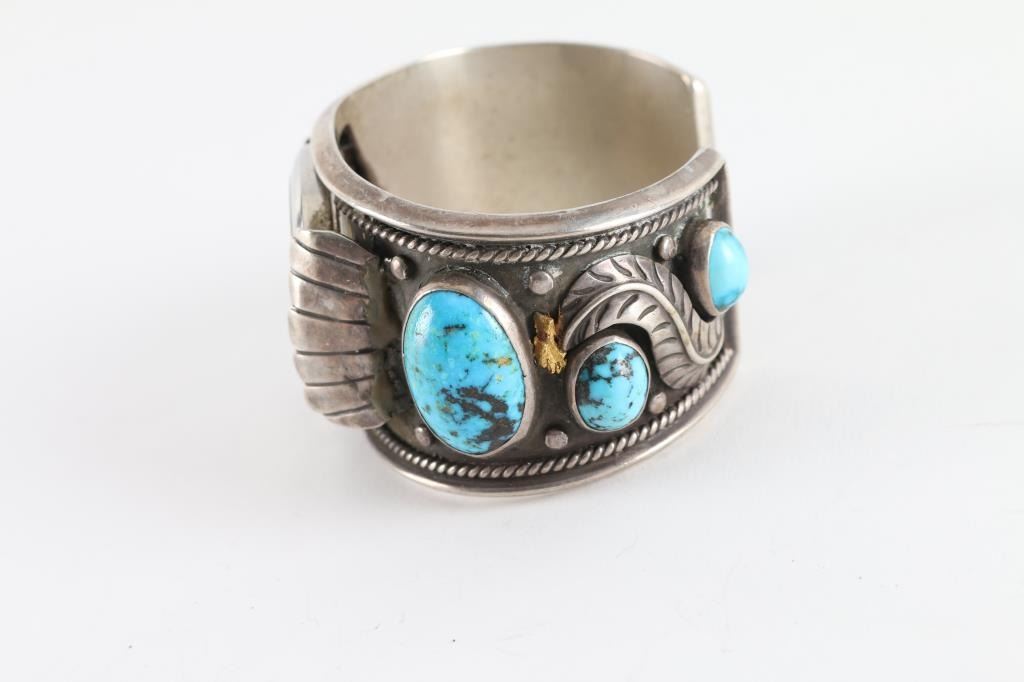 with six turquoise stones accent with small gold nuggets maker marked "JM" set in sterling silver.