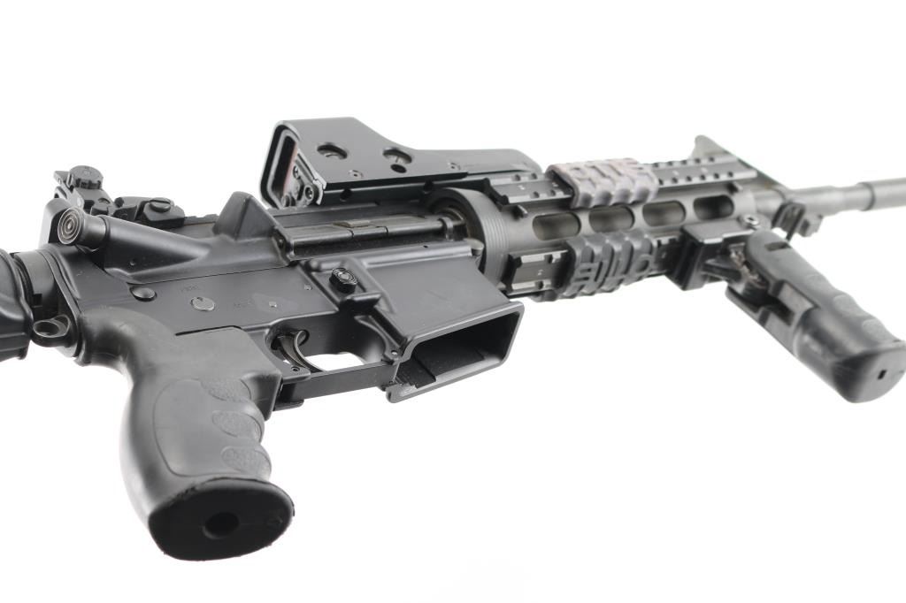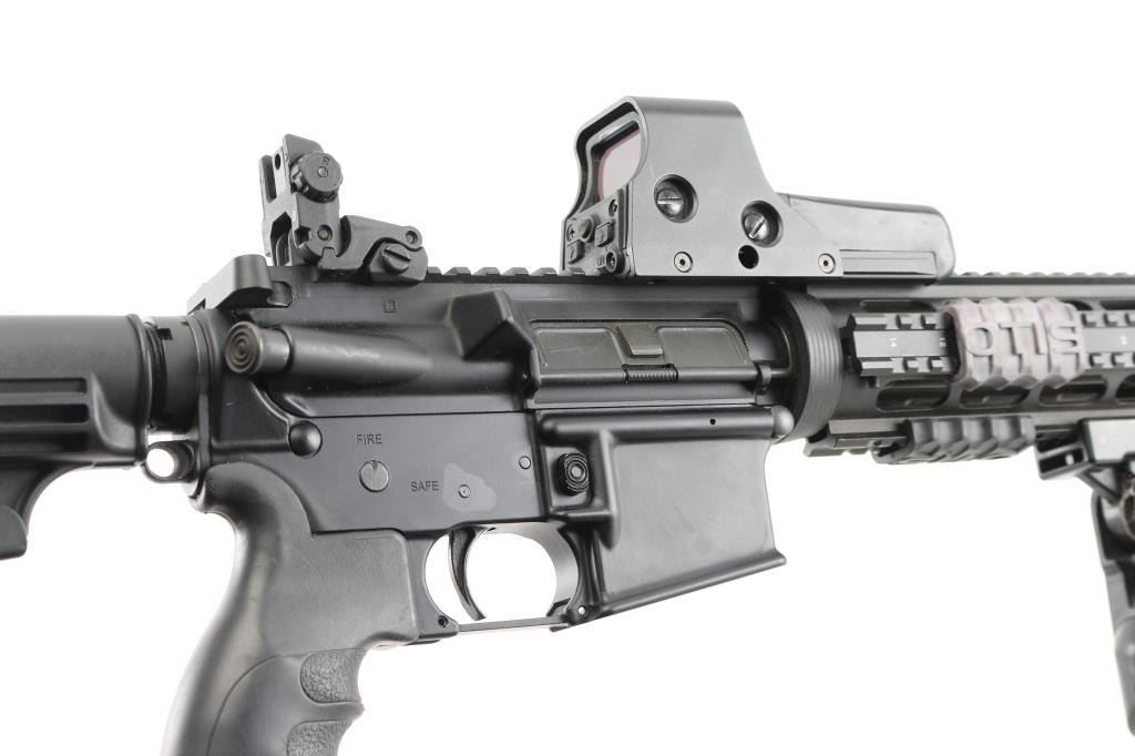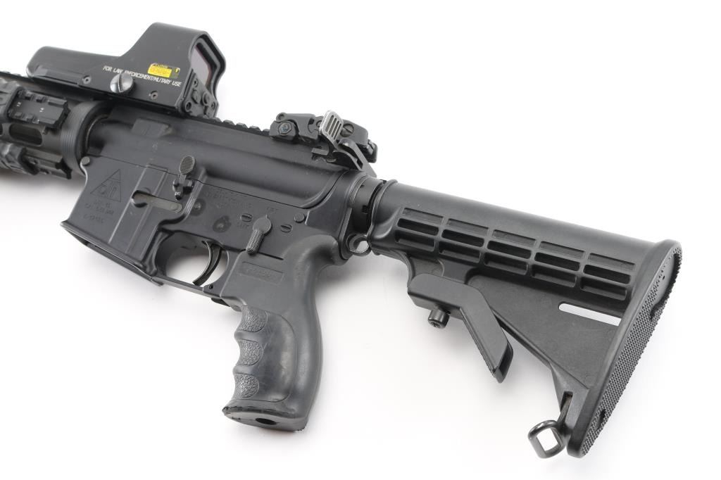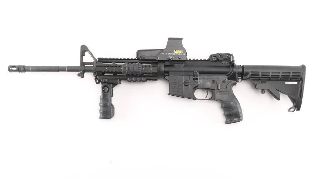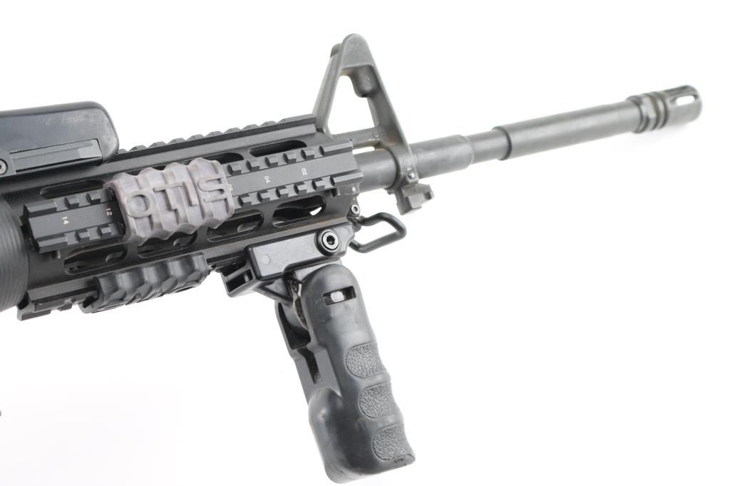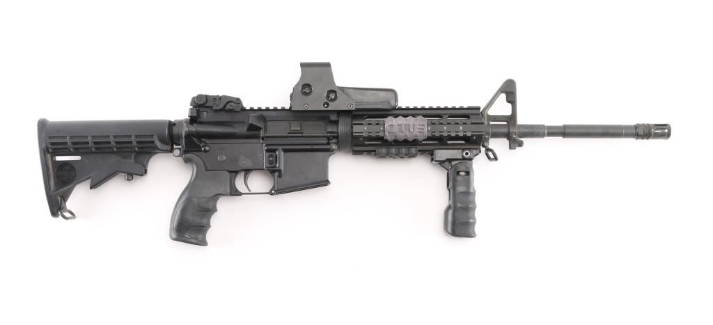 Semiautomatic AR15 type rifle features dark gray parkerizing, black polymer furniture (Tac-Star grip, Bushmaster four position collapsing stock with sling swivel), sling point at rear of receiver, aluminum quad rail handguards, 16" M4 profile barrel, triangular front sight base & bayonet lug, protected post front sight, flat top upper receiver, Magpul folding black polymer adjustable rear sight, front sling swivel, folding fore grip, ejection port cover, forward assist, manual safety, five flute birdcage flash hider, extended latch on left side of charging handle. Bore is very good. Retains 90% finish with handling marks. Polymer is very good with handling marks. No magazine. Includes very good condition reflex sight, not marked, made to look like an EOTech, tests good - powers up, takes AA batteries, the NV switch changes between red and green color. Condition is NRA Very Good++ *** Modern Firearm ***