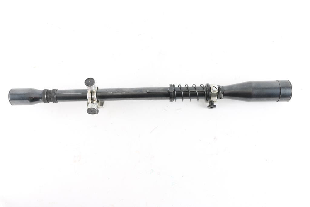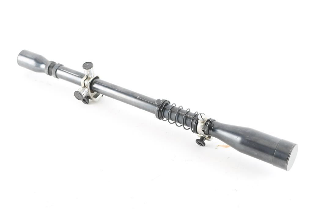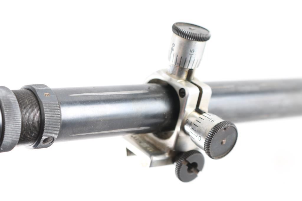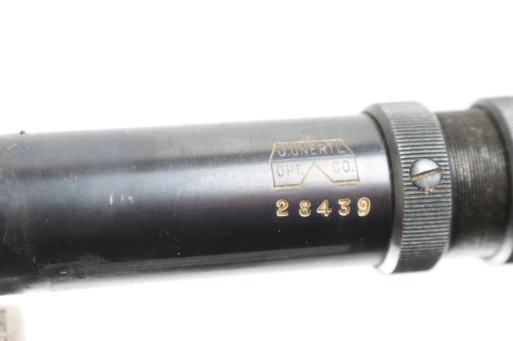 John Unertl recoil spring 8x scope, adjustable dove-tailed Unertl rings. Extremely fine cross hairs with center dot. Screw in lens caps. Measures 19 1/2". Very good condition.
