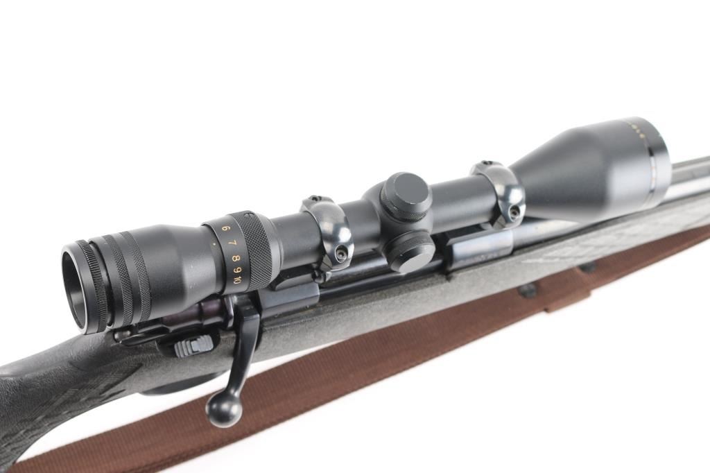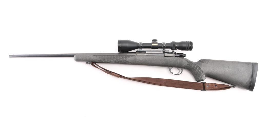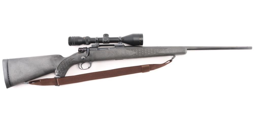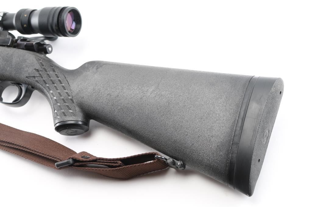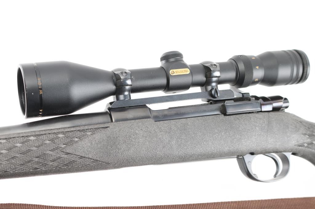 Bolt action rifle manufactured in Yugoslavia for Interarms, using a "CZ" marked receiver. Features blued finish, checkered flat bottom bolt knob, black polymer stock, curved semi-pistol grip, no cheekpiece, black plastic grip cap, solid rubber recoil pad, 24" barrel, drilled & tapped for sights (plug screws installed)ear sights, one piece Redfield type scope bases and rings on receiver, sling studs (with detachable swivels & nylon installed), sliding manual safety on right side of upper tang, hinged floorplate. Mounts a Simmons Wide angle 44 Mag (3-10x44mm) scope. Bore is very good condition. Retains 95% finish with handling marks, some scuffs to barrel. Stock is excellent. Scope is very good with clear view. Condition is near NRA Excellent *** Modern Firearm ***