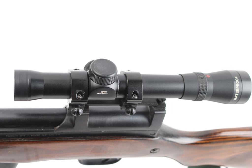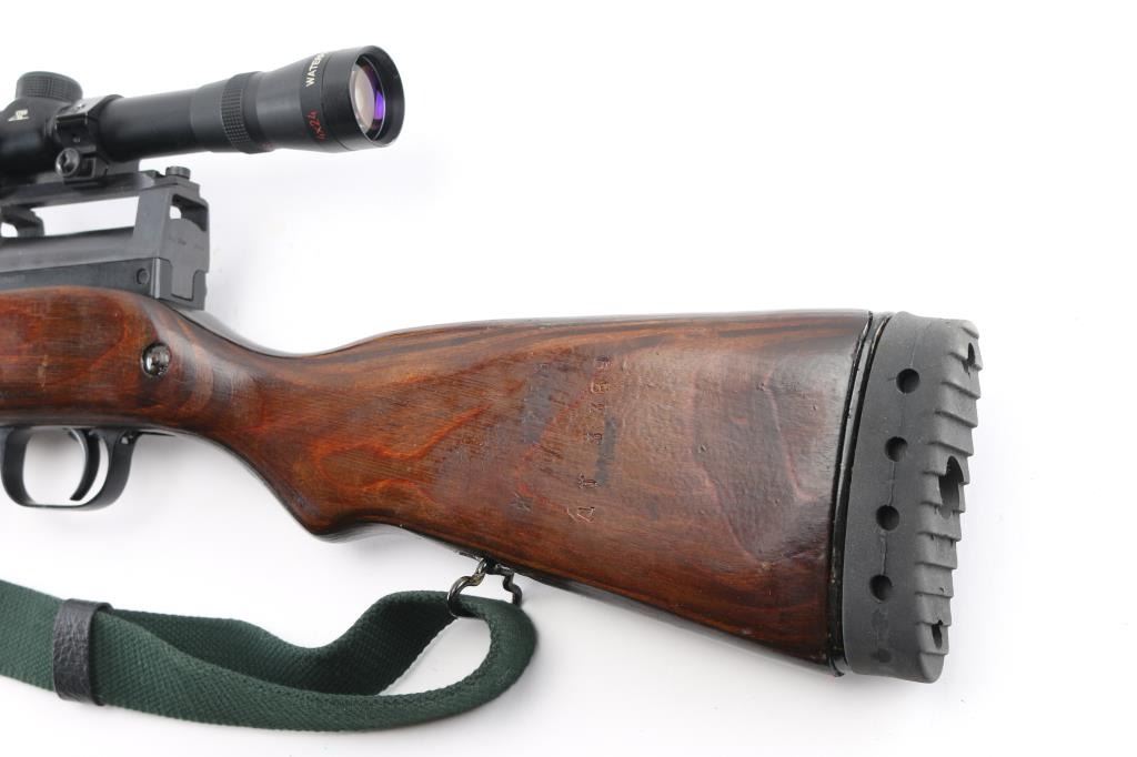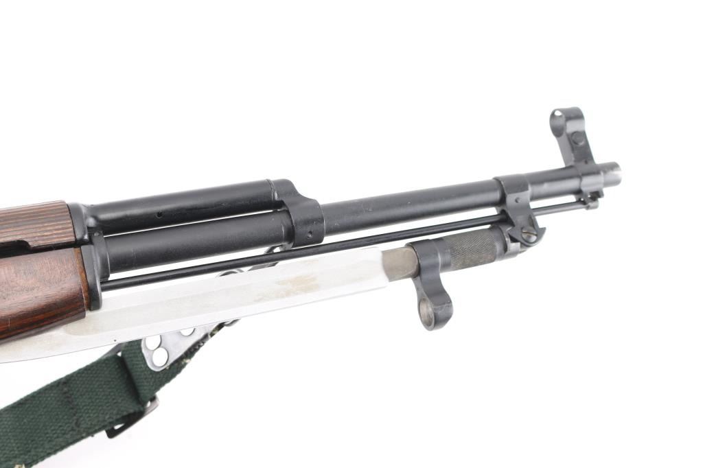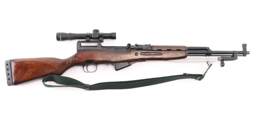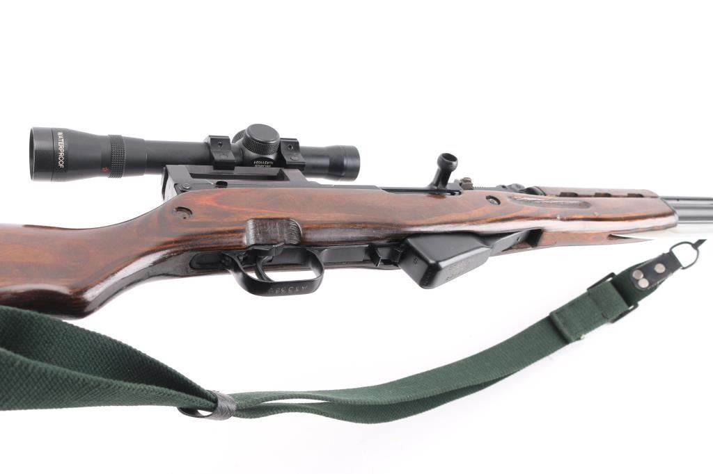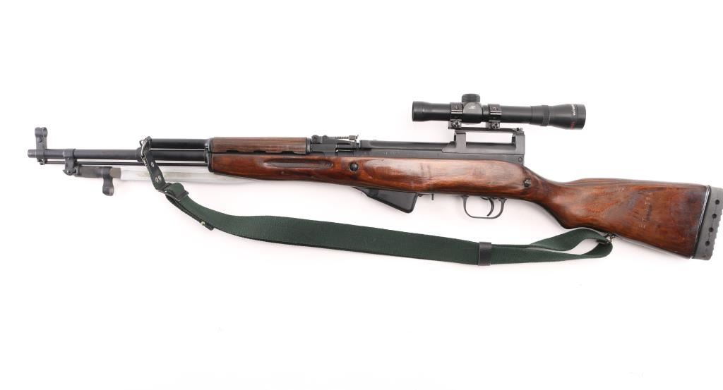 Russian semiautomatic rifle imported by NHM, Sac, CA. Appears arsenal reworked. Features 20" hard chrome lined barrel, fully adjustable protected post front and tangent rear sights, fixed 10 rd magazine with hinged floorplate, manual safety, laminated hardwood stock with trap in butt for cleaning kit, sling swivels, folding blade bayonet, cleaning rod. Rubber butt pad secured to rear, has hole to allow access to cleaning kit in butt. Original factory serial number matches on receiver, bolt carrier, triggerguard, and stock. Magazine is force matched. Receiver top cover is a replacement with integrated scope mount, mounting a 4x24mm military styled scope (BelOMA marked, similar to "PO") with German post reticle. Bore is very good condition. Metal retains 95% blued finish with handling marks and several scrapes. Bayonet blade appears hard chromed. Stock is very good condition, with scuffs & dents. Scope is very good condition, clear view. Importer has added their serial number to left side of receiver. Includes dark green cotton web sling (Egyptian AK sling). Condition is NRA Very Good++ as arsenal reworked *** C&R Firearm ***