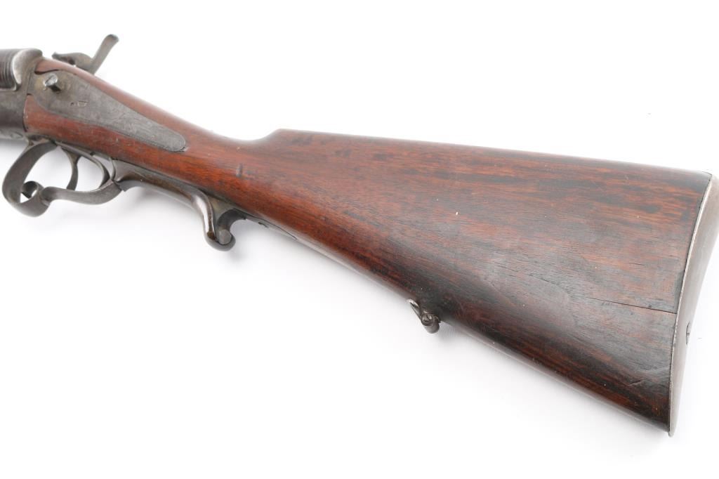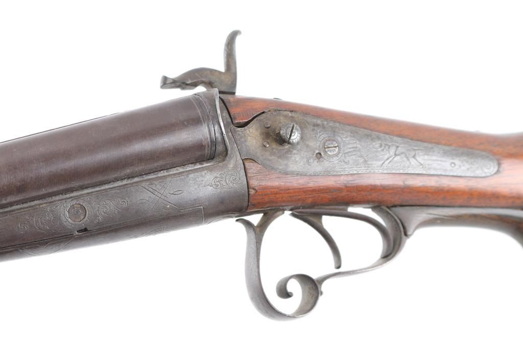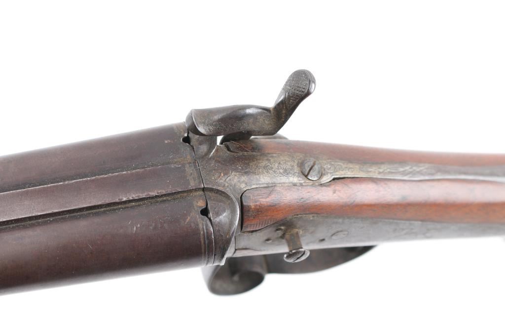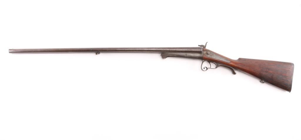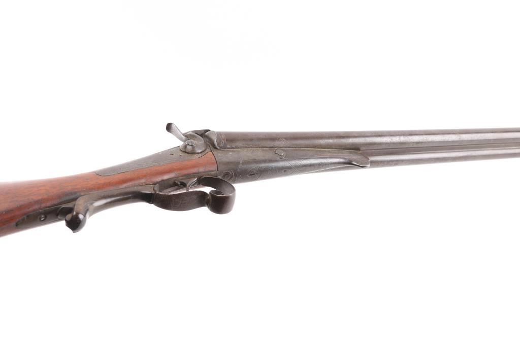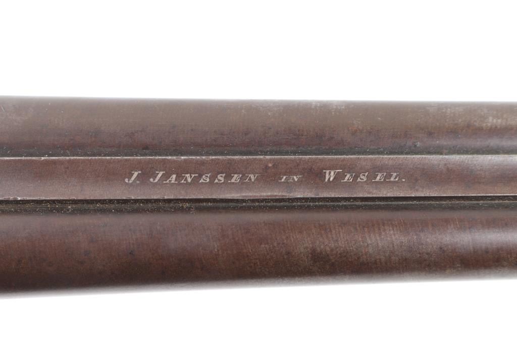 Antique double barrel shotgun marked "Janssen in Wesel" along top rib. Features 30.5" barrels, underlever opening with no forend, double triggers, exposed hammer back lock action, smooth walnut shoulder stock with straight wrist, smooth metal buttplate, narrow sling swivels. Bores are fair to good, lightly pitted throughout. Dark patina brown on all metal. Missing left hammer. Wood is good condition, solid, with many small dents. Condition is NRA Fair - Missing Parts *** Antique Firearm ***
