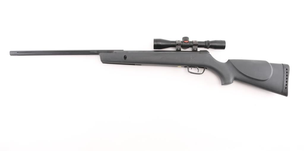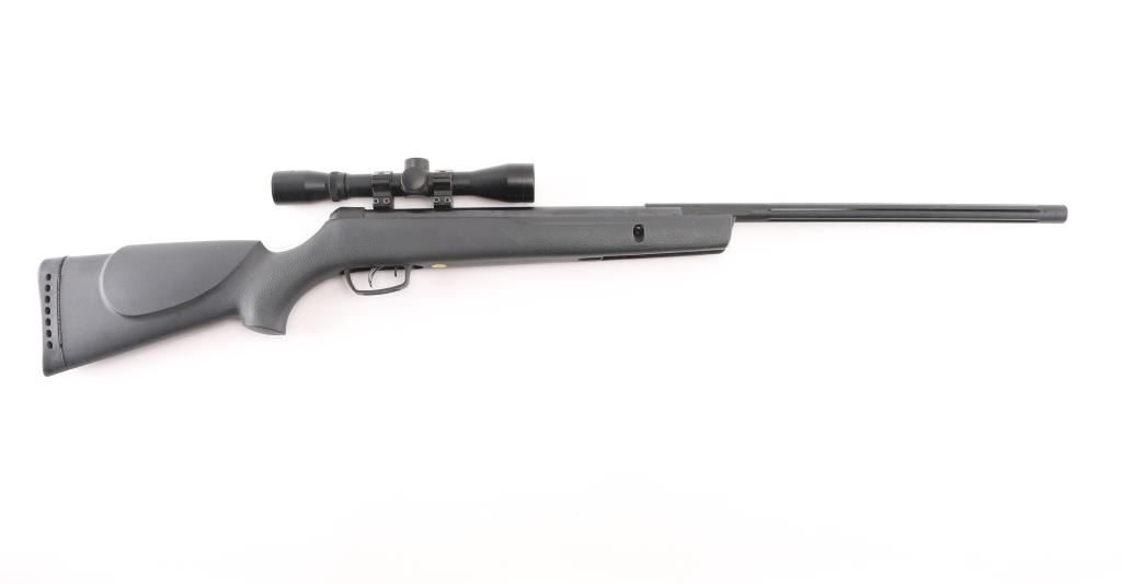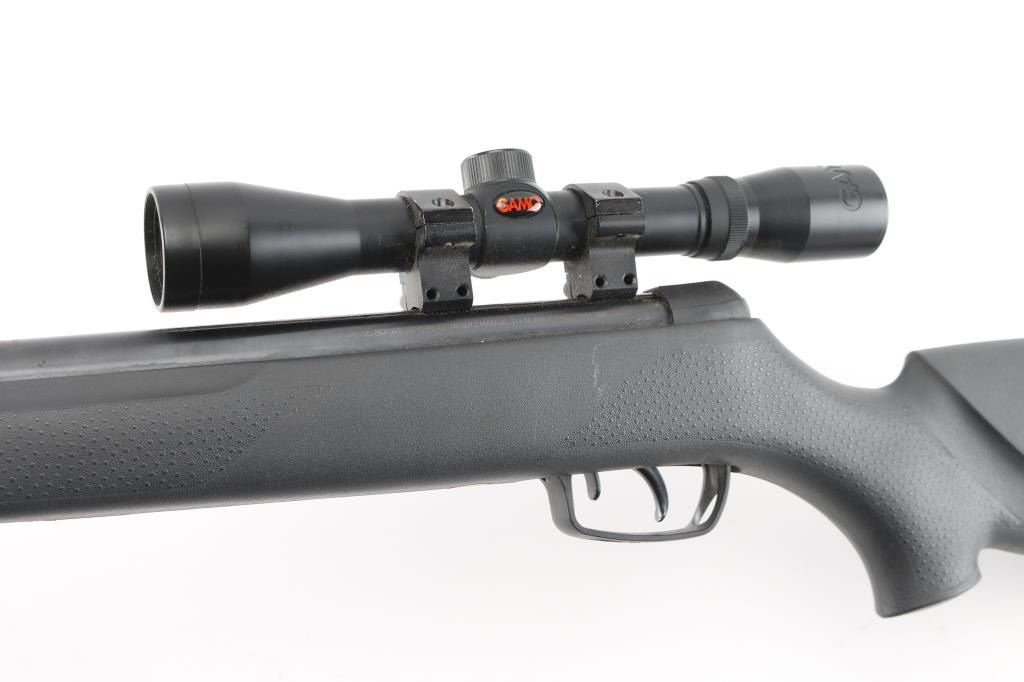 Made in Spain this is a single shot break barrel air rifle chambered for .177 pellets. The barrel reads 1200 FPS with PBA, 1000 FPS with lead. It has an 18" fluted barrel, blued finish and safety in front of trigger inside trigger guard. Black synthetic Monte Carlo style stock has cheek rest on the left side and stippling on the wrist and forearm and a rubber recoil pad. It comes with a Gamo 4x32 scope with clear view. Metal finish looks good, some minor patina or light rust showing where barrel meets stock. Stock looks good. Bore looks bright.
