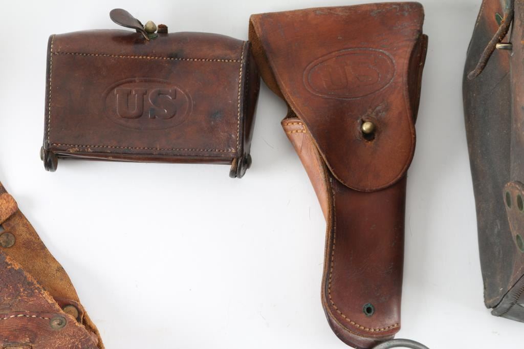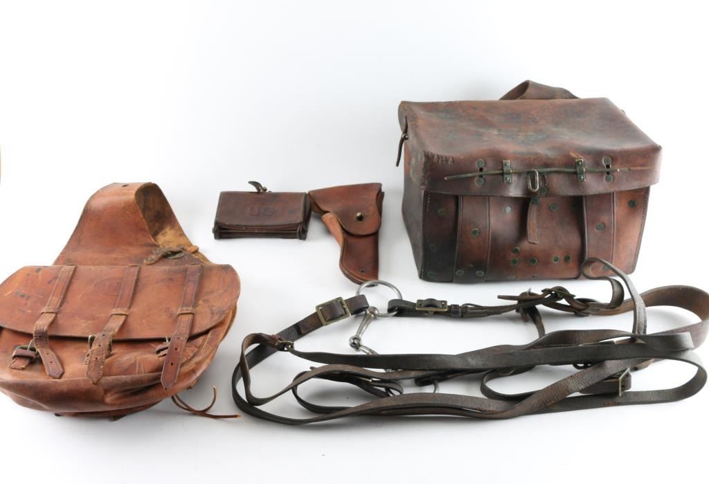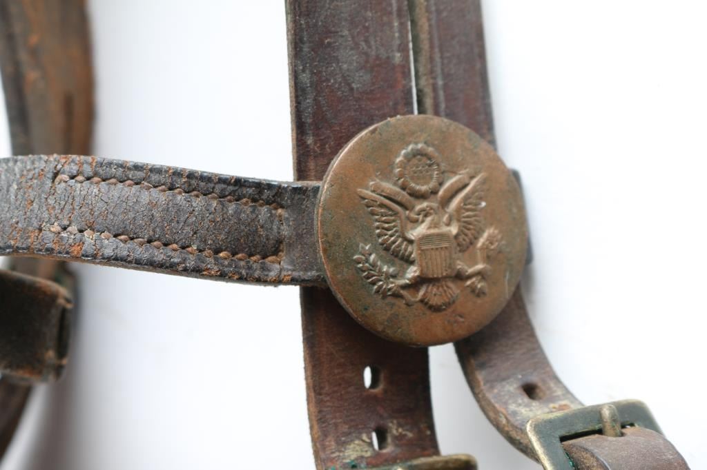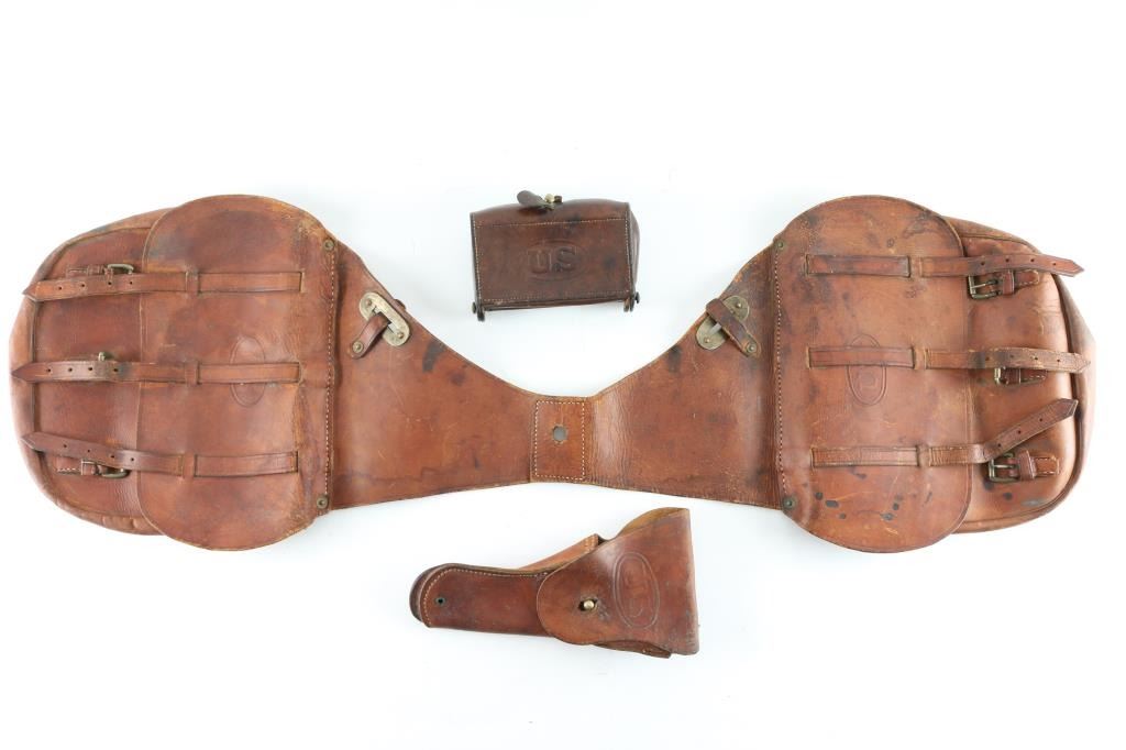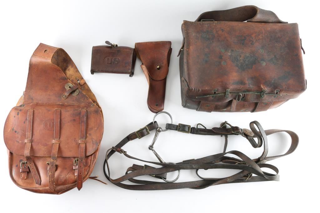 1) U.S. Spanish American War era M1902 "McKeever" cartridge box for the 30-40 Krag. Russet brown,. Rock Island Arsenal marked, unit marked on the back. Loop has a tear. 2) WW1 M1911 brown leather flap holster, Enger-Kress marked. 3) M1904 Russet Leather saddle bags. First Pattern on the M1896 saddle Russet McClellan. "US" embossed on each flap. These have the rare canvass liners with snap closures. Very good condition. 4) US Army Cavalry officer’s M1909 horse bridle with bit, copper Eagle rosettes, inspector marked "H.C." Complete with snaffle bit, and reins. Very good condition. 5) Indian War Era US Cavalry Farriers Leather Tool box. Faint US embossed lid -multi-size tool loops on interior Measurements: 8.5" tall x 14" wide x 9" deep. Very Good for age; leather is worn & stained w/ patina; interior is dirty, but well kept; rear strap is broken. Brass fittings.