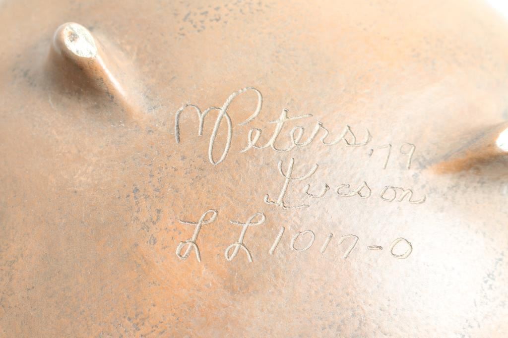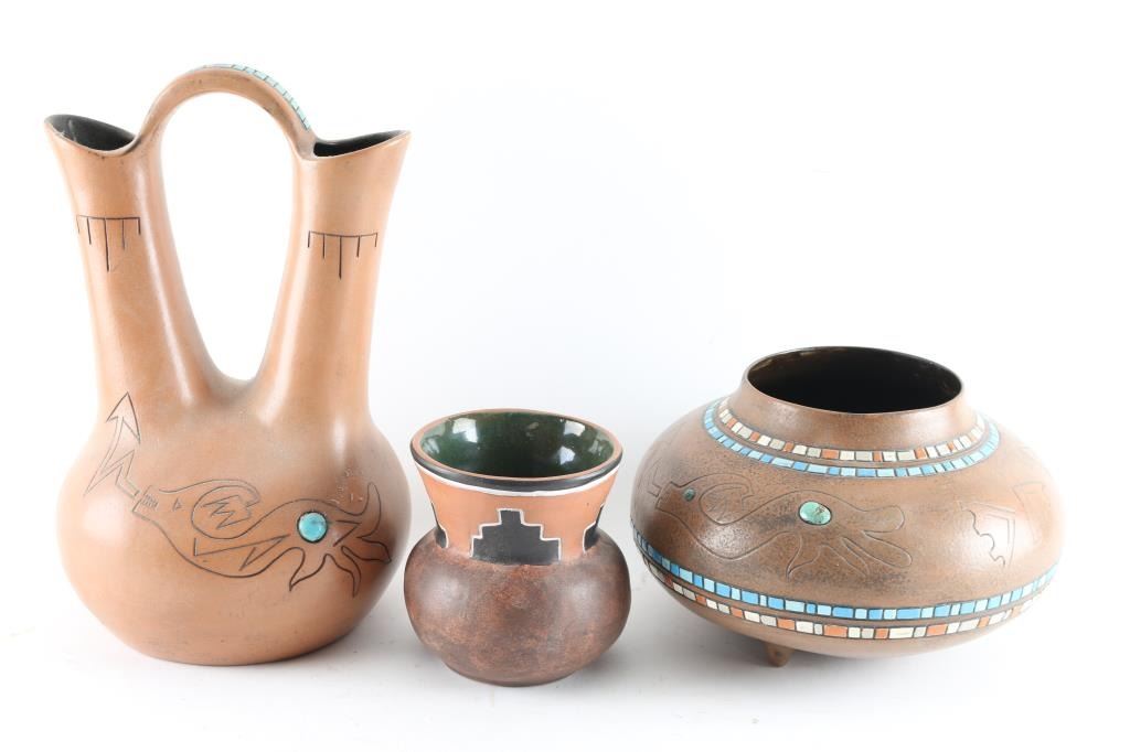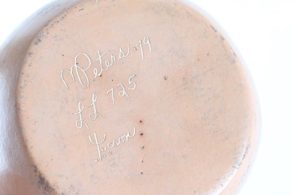 A wedding vessel, signed Peters 79LL725 on base, measures 12" x 9". A hooded pot with colorful design, signed on base by Peters, measures 12" x 7". Smallest pot, unsigned, 4 1/2" x 4 1/2".
