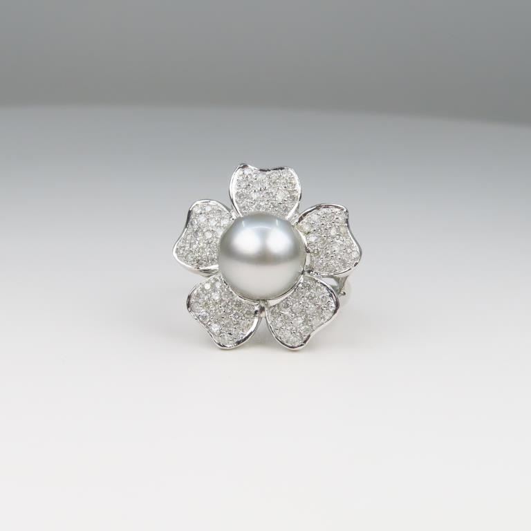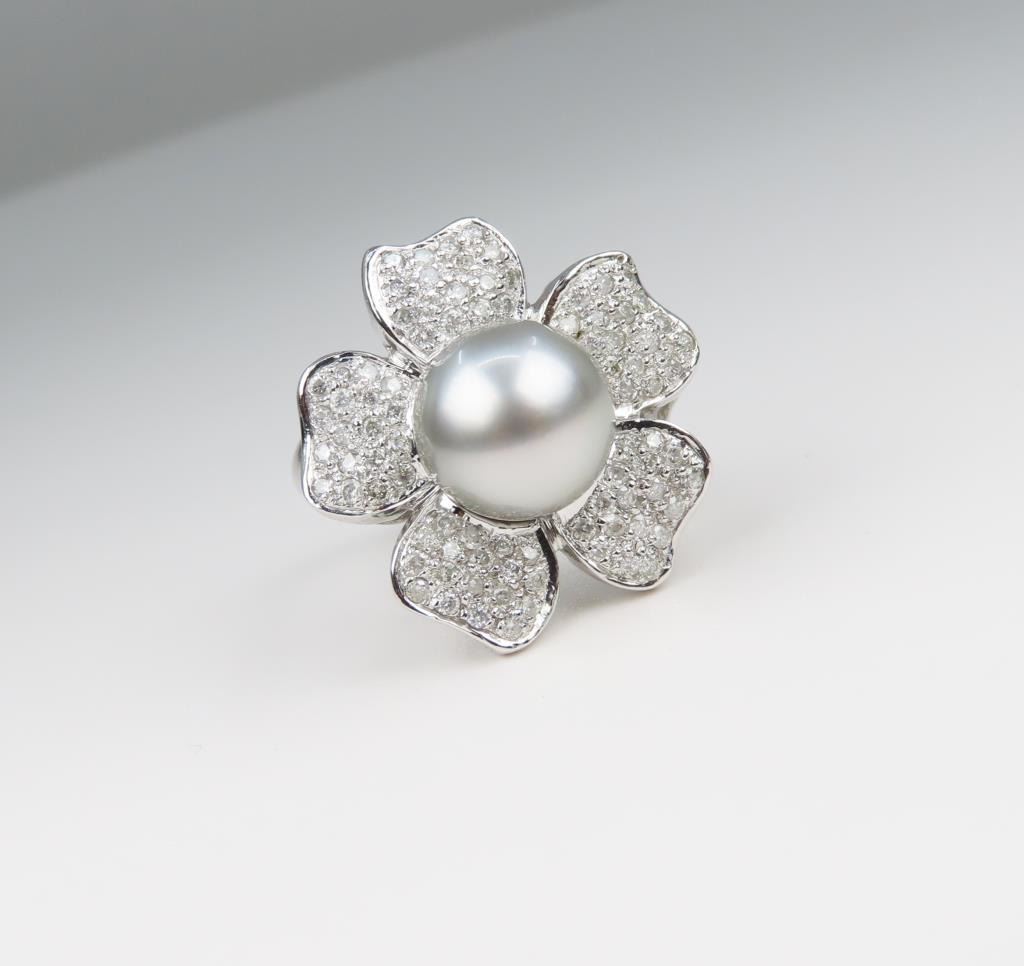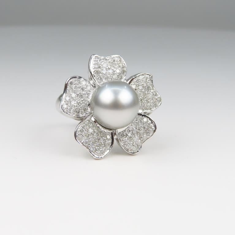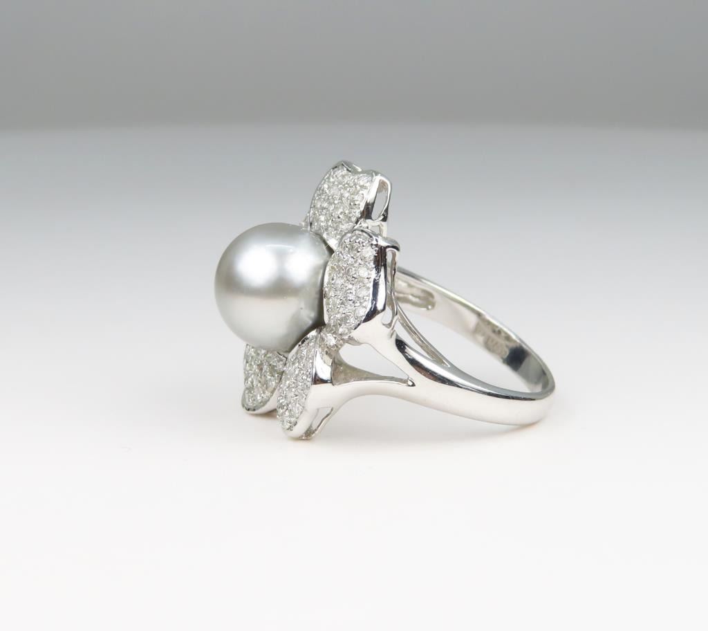 and Diamond Ring with Pearl averaging 10.00 MM in diameter and pave set with over 85 round Diamonds weighing approx. 1.20 carats set in a 14 karat white gold custom setting, Size 7. Retail $5,000-$6,000