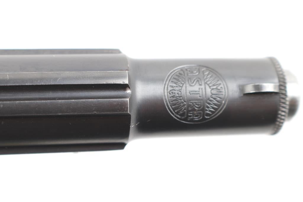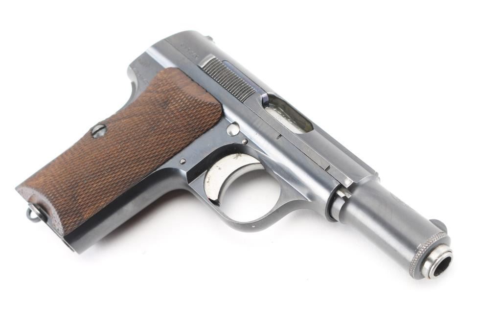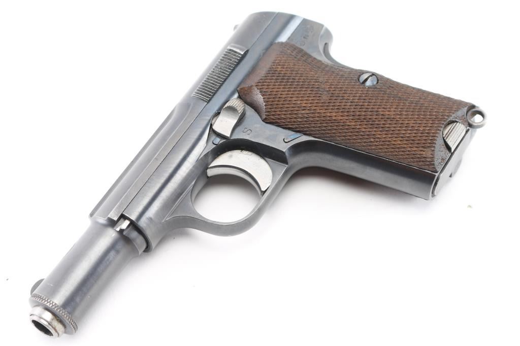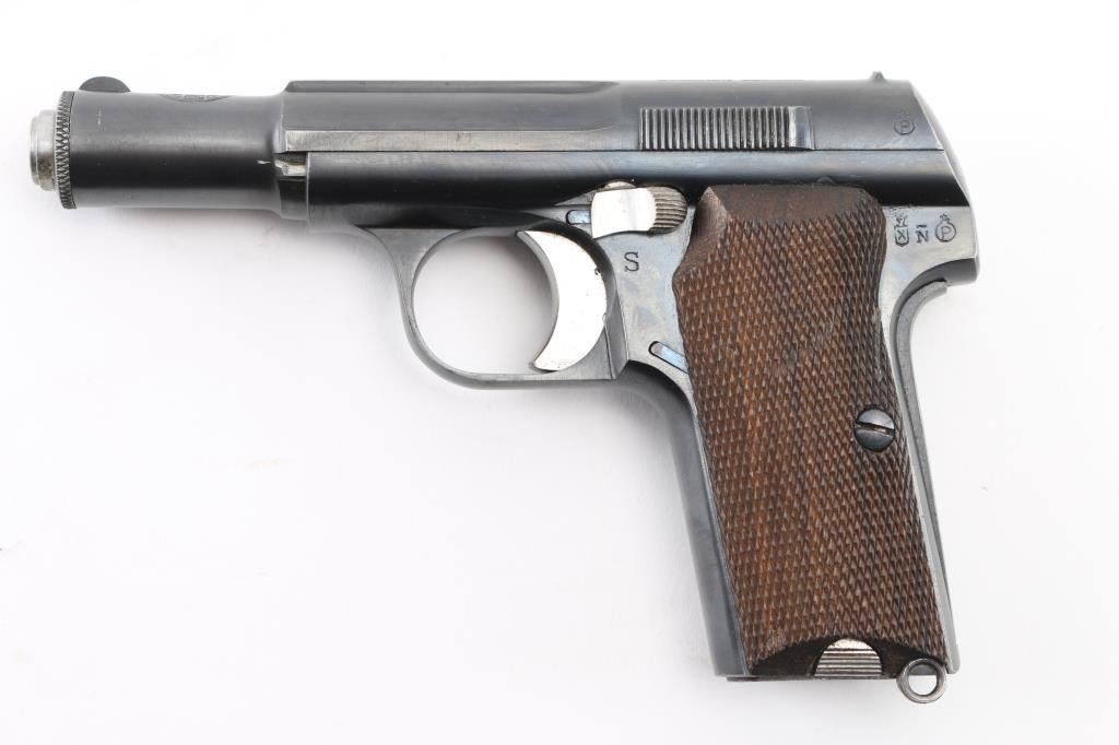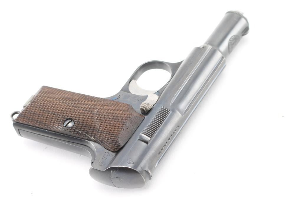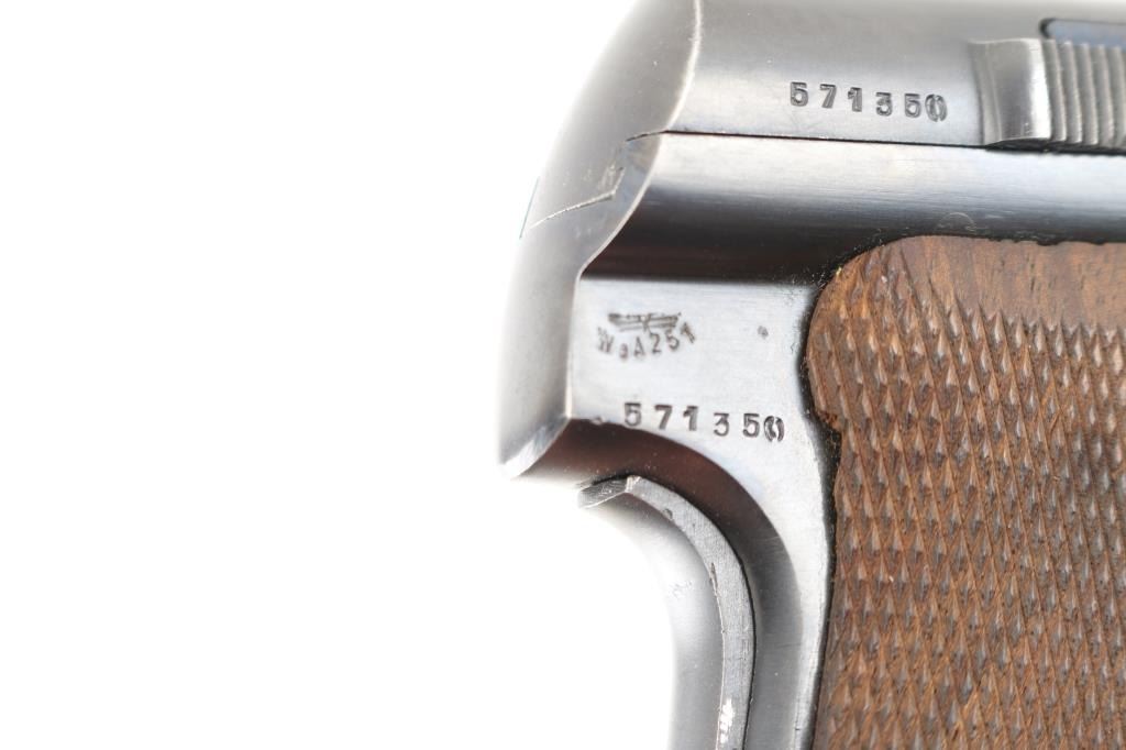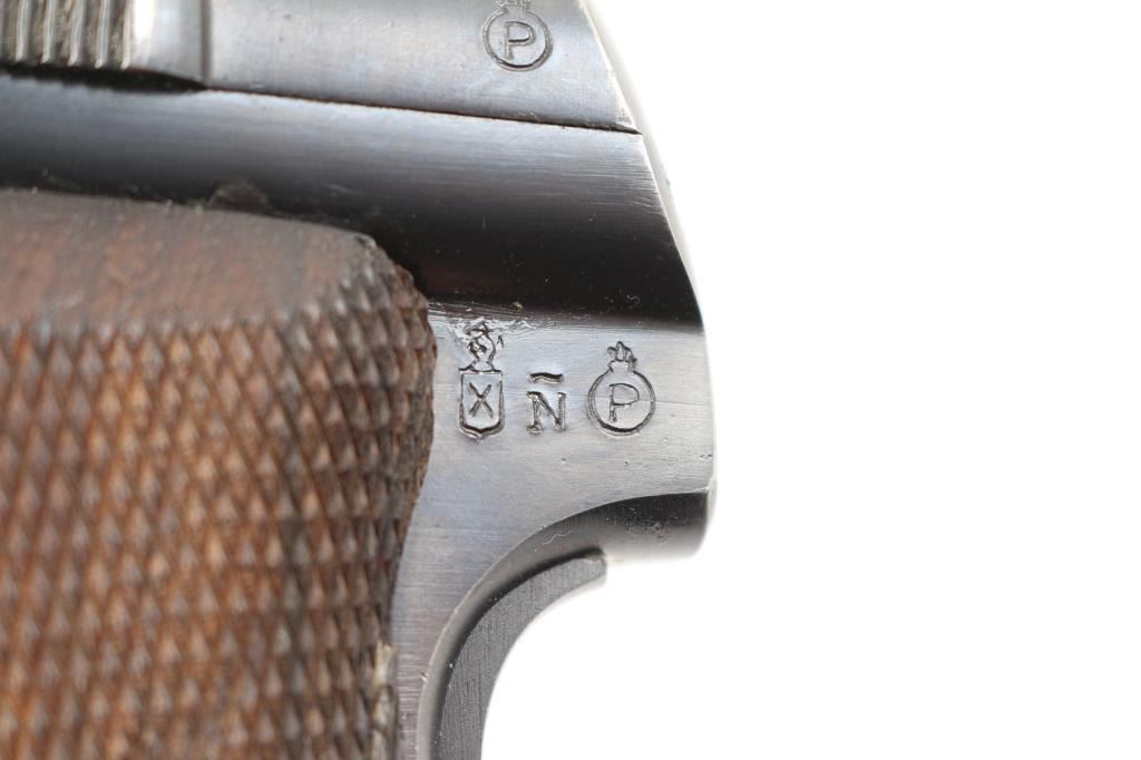 Spanish made single action, blow-back, semi- automatic pistol chambered in 9mm Kurz/..380. Produced 1942 ("N" code), Top of slide marked “UNCETA Y COMPANIA S.A. / GUERNICA ESPANA”, Spanish proofs on left rear frame. Waffenamt Eagle/WaA251 stamped on right rear receiver. 3.9" barrel with fixed blade/notch sights. manual & grip safeties, lanyard ring, matching serial numbers on slide/frame, one Astra marked 7-rd magazine. Bore is excellent/bright, checkered wood grips are very good, action is crisp/tight, Original blue finish is about 98%. Bright nitre blue still on the extractor. One of the nicest we've seen. NRA Condition-Excellent. C&R Firearm.