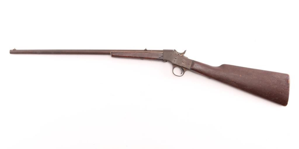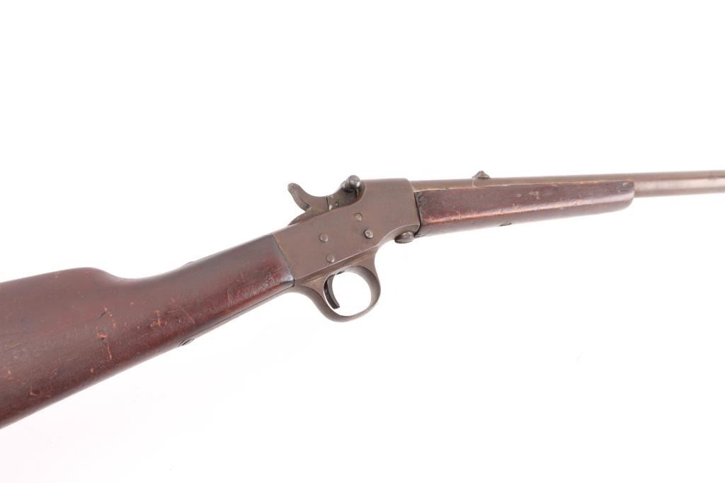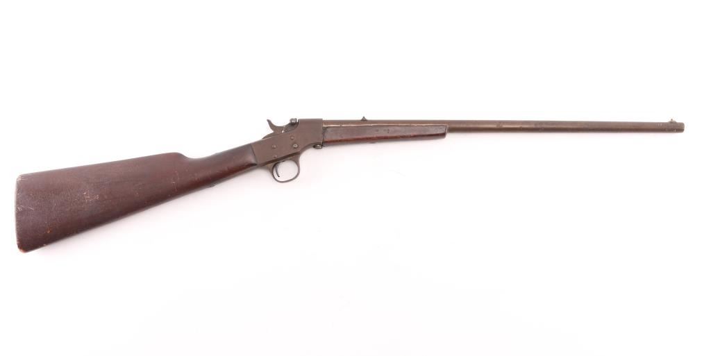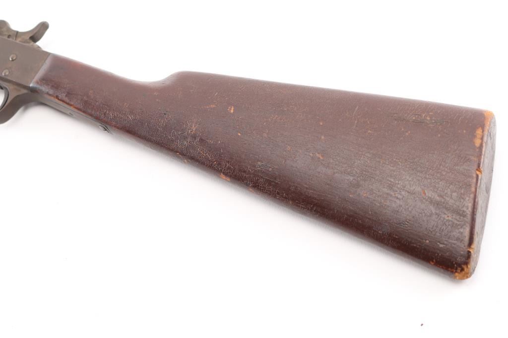 Vintage rimfire falling block action rifle manufactured circa 1903-1915. Features 19" barrel, takedown screw under receiver, post front & dovetailed notch rear sights, smooth wood forend & shoulder stock. Appears finished without buttplate. Bore is poor, dark and corroded condition. Metal surfaces show even brown patina color. Wood if fair to good, with dents & small gouges. Condition is NRA Fair *** C&R Firearm ***