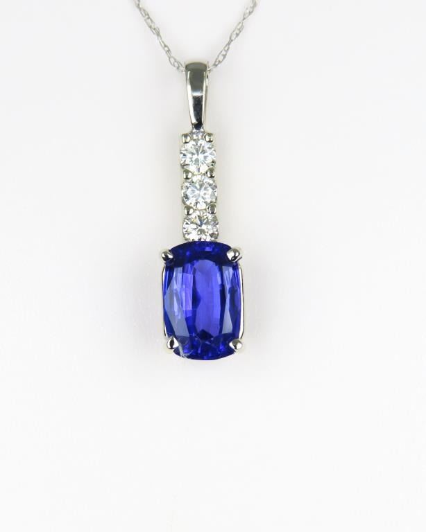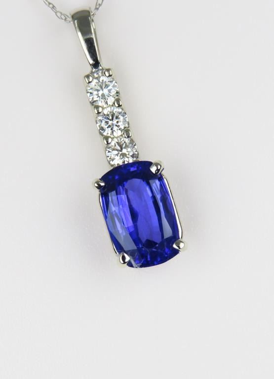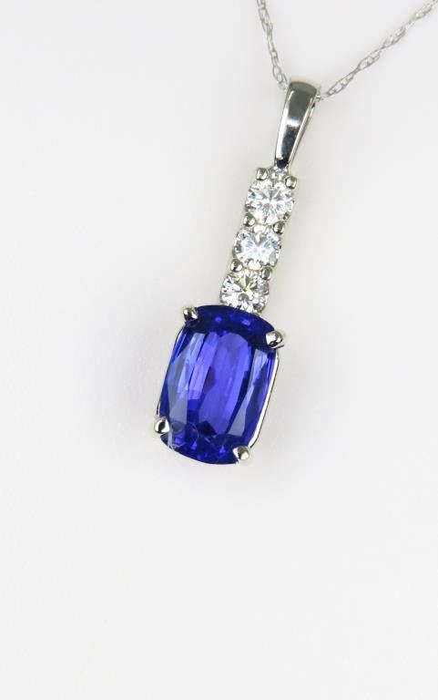 Pendant featuring an oval cut Tanzanite weighing 2.60 carats with intense Blue/Violet color and VS clarity accented with 3 “IDEAL” cut Diamonds with F-G colors and VS clarity set in 14 karat white gold setting. Retail $3,000-$4,000