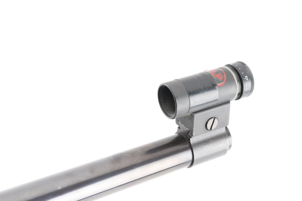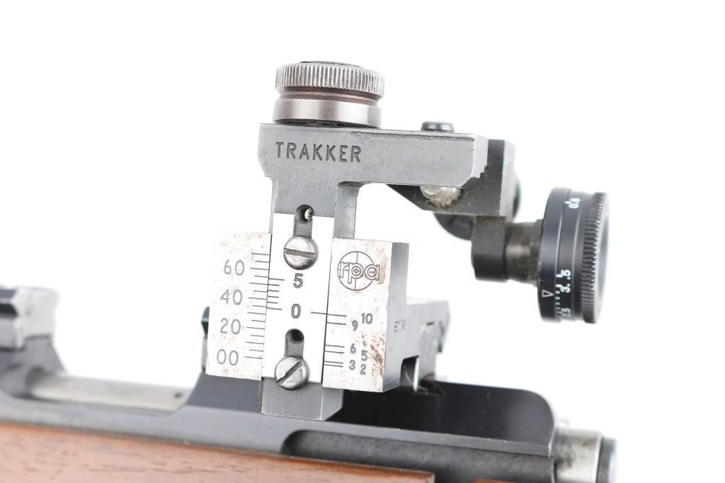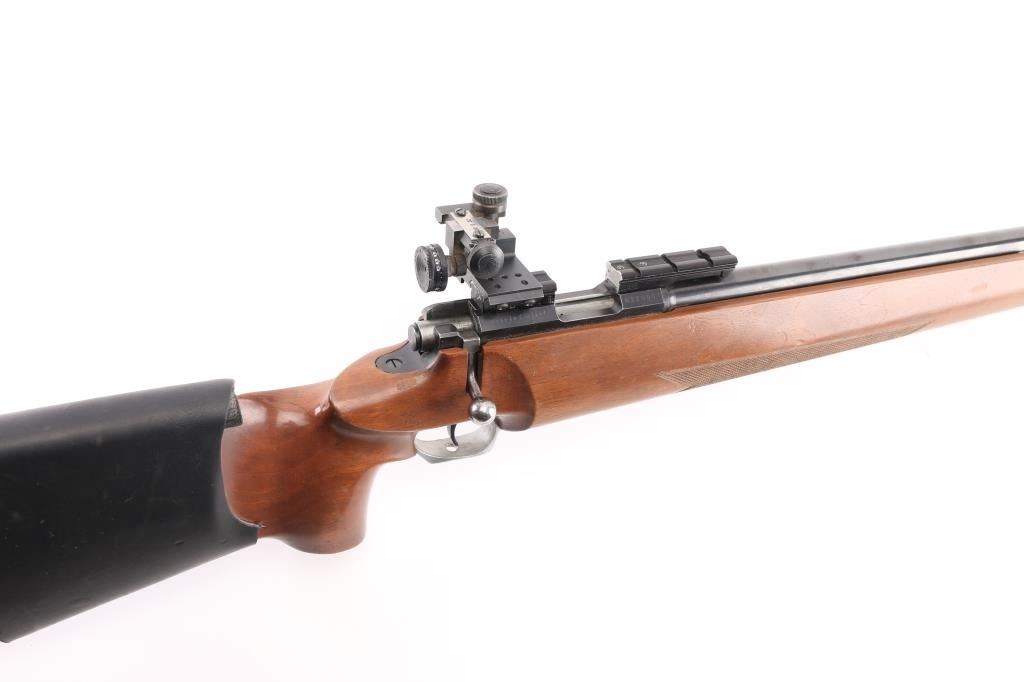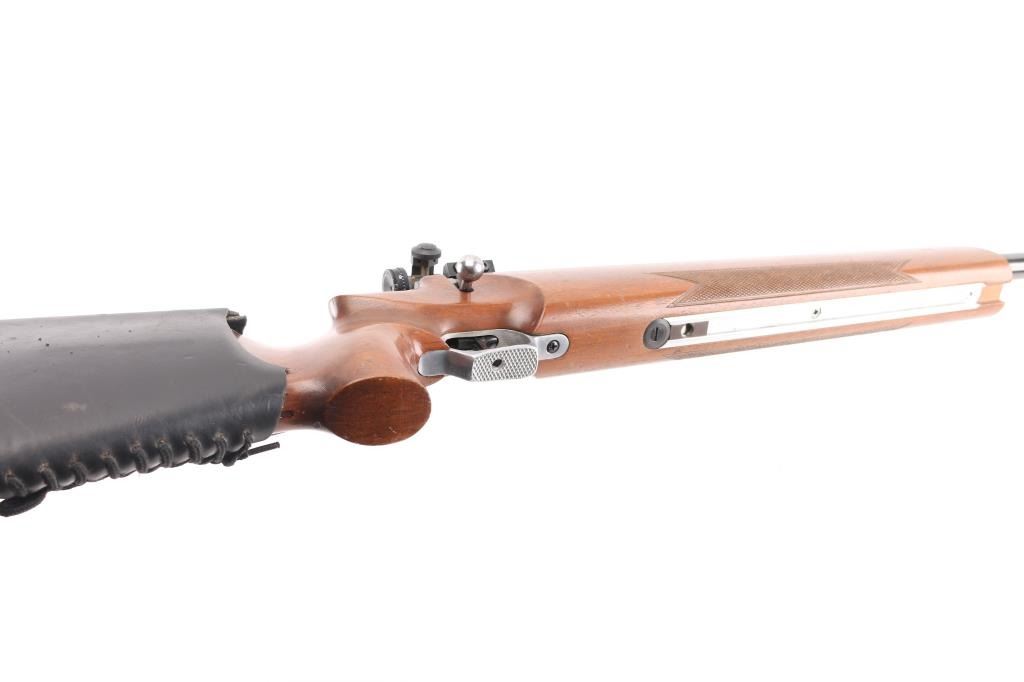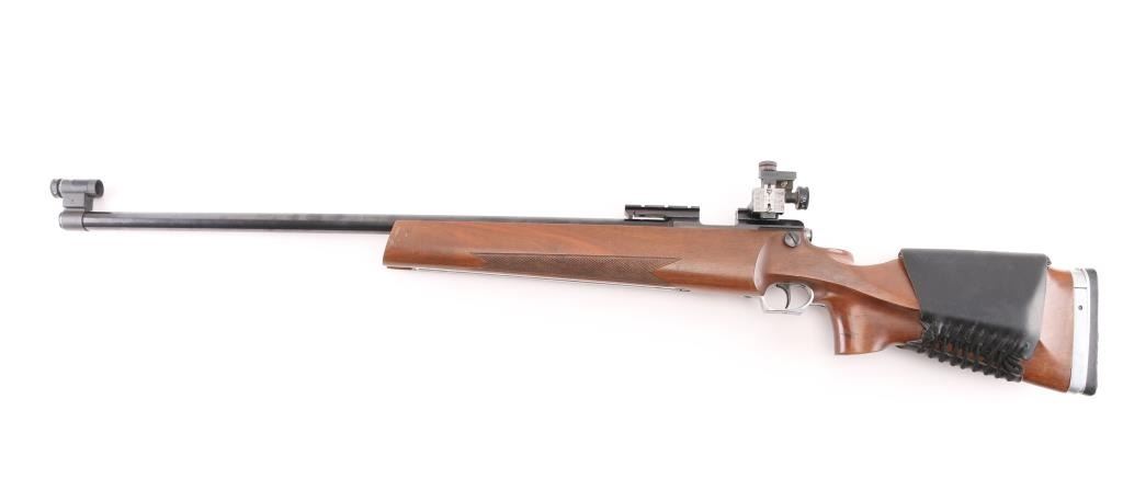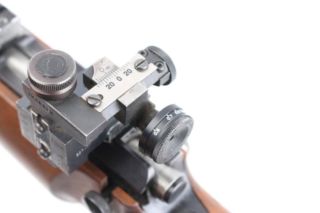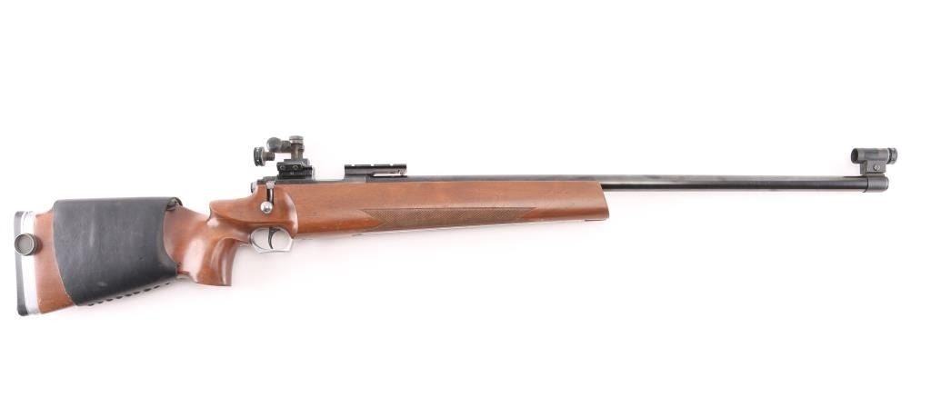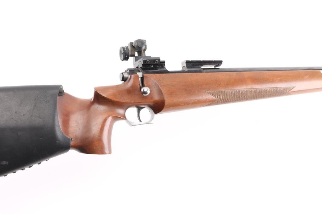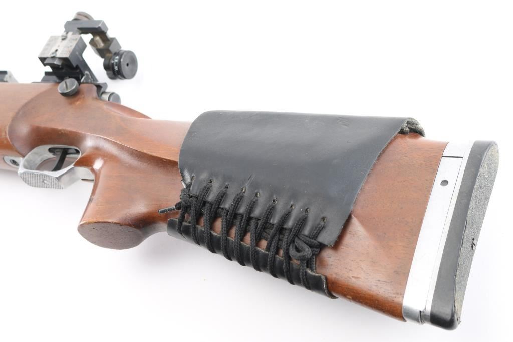 SN: 12623 "Finnish Lion" single shot bolt action rimfire target rifle made in Finland, imported by Mandell's of Scottsdale AZ. Features blued finish, 28" heavy barrel, hooded globe front sight and diopter adjustable rear peep sight (both on dovetails), Weaver rail in two sections mounted to receiver dovetail slots, adjustable trigger. Wood target stock has checkered panels at forend, hand stop rail under forend, pistol grip with right hand palm swell, adjustable butt plate, lace-up leather cheek sleeve, aluminum triggerguard with checkered bottom. Bore is very good bright condition. Retains 95% finish with handling marks. Wood is very good with small dings. Condition is NRA Very Good++ *** Modern Firearm ***