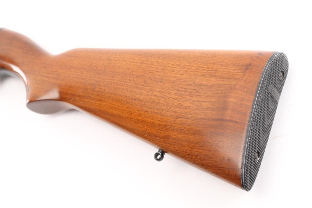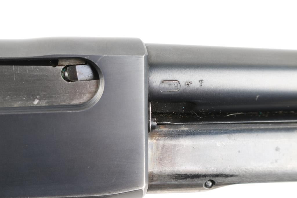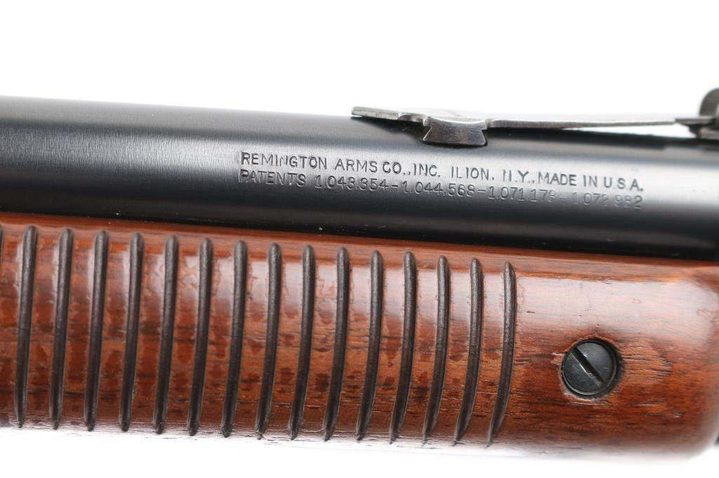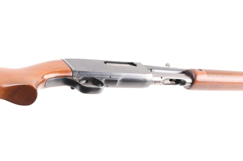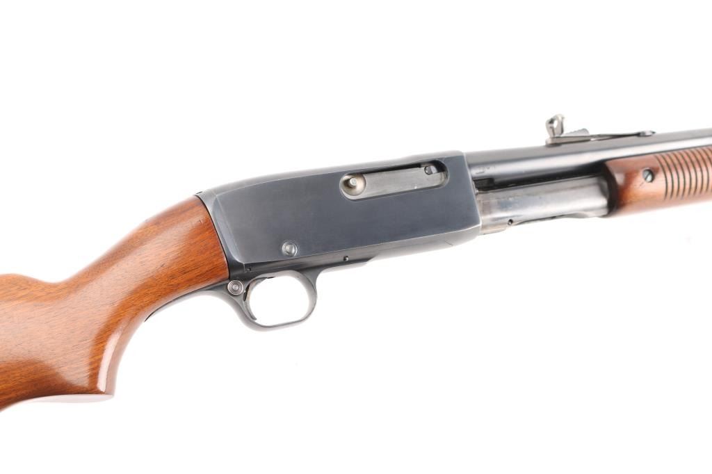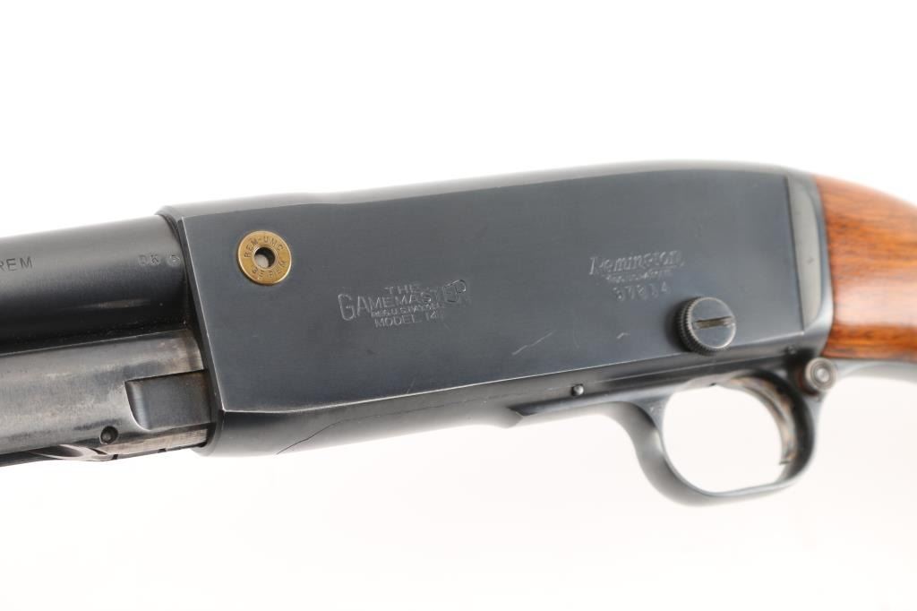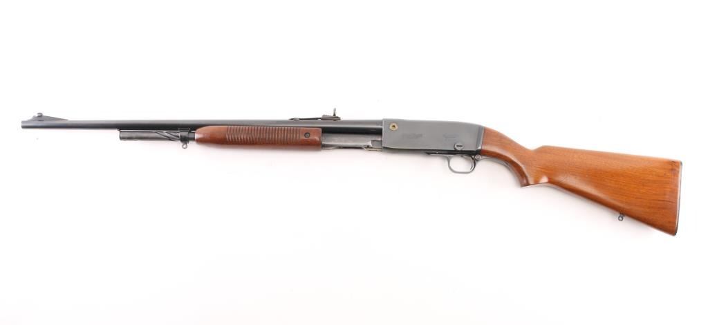 The 'Gamemaster' Vintage take-down pump action rifle, manufactured circa 1941. Features blued finish, smooth semi-pistol grip stock, grooved wood pump handle, 24" barrel, dovetailed Marble white bead/blade front & King sporting rear sight, tube magazine, push button safety, bolt release in side of bolt, brass cartridge head medallion and take down screw on left side of receiver, knurled metal factory buttplate. Bore is excellent/bright. Retains 90% finish with rubbing wear on magazine tube. Wood is very good with minor scratches/dings, sling swivel studs. Condition is NRA Very Good. C&R Firearm.