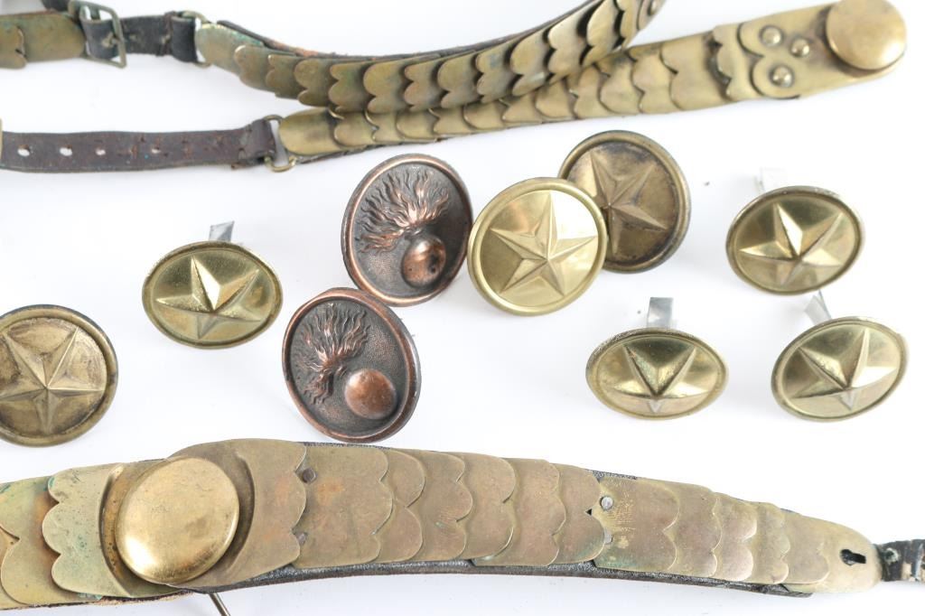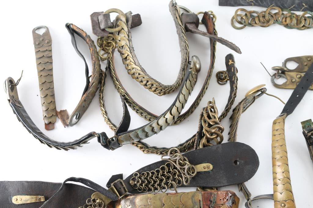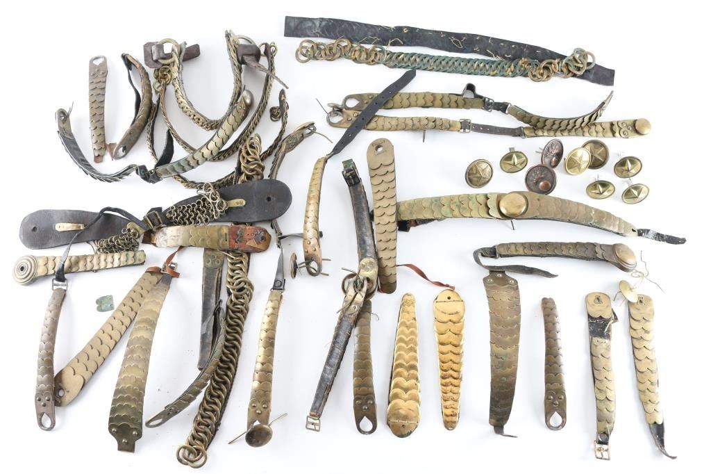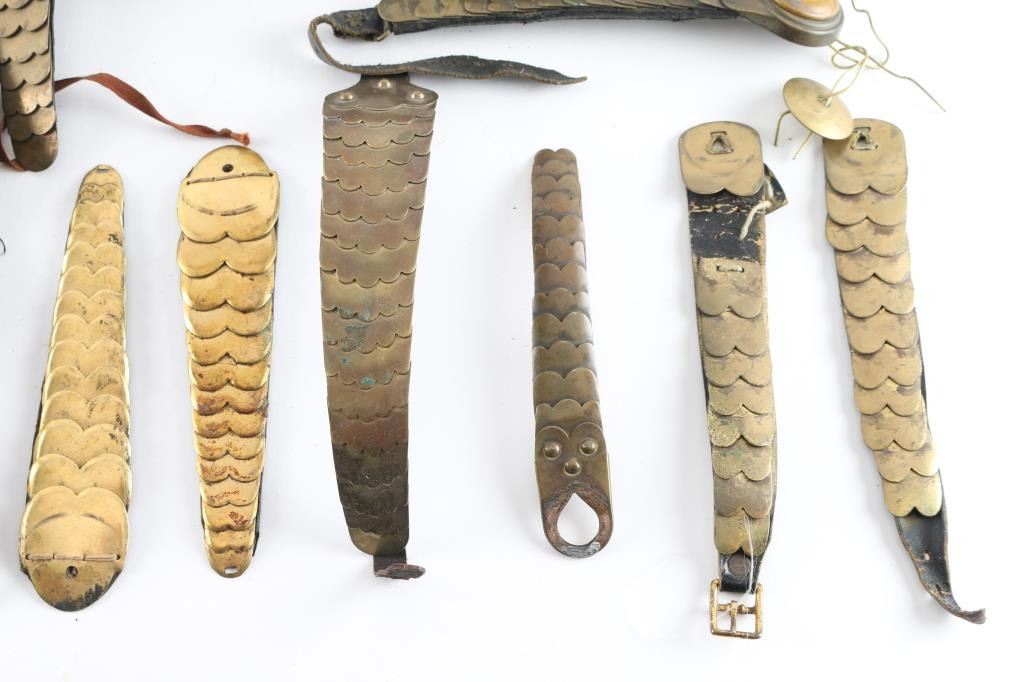 Large lot of vintage French, and British Shako/Helmet Brass chin scales, 14 complete sets, and 4 individual pieces. Includes 7 French "Star" bosses, and two French Flaming Bomb bosses. 6 complete brass linked chain chin straps These sell for a lot of money on E-Bay. From the Joe Musso Collection.